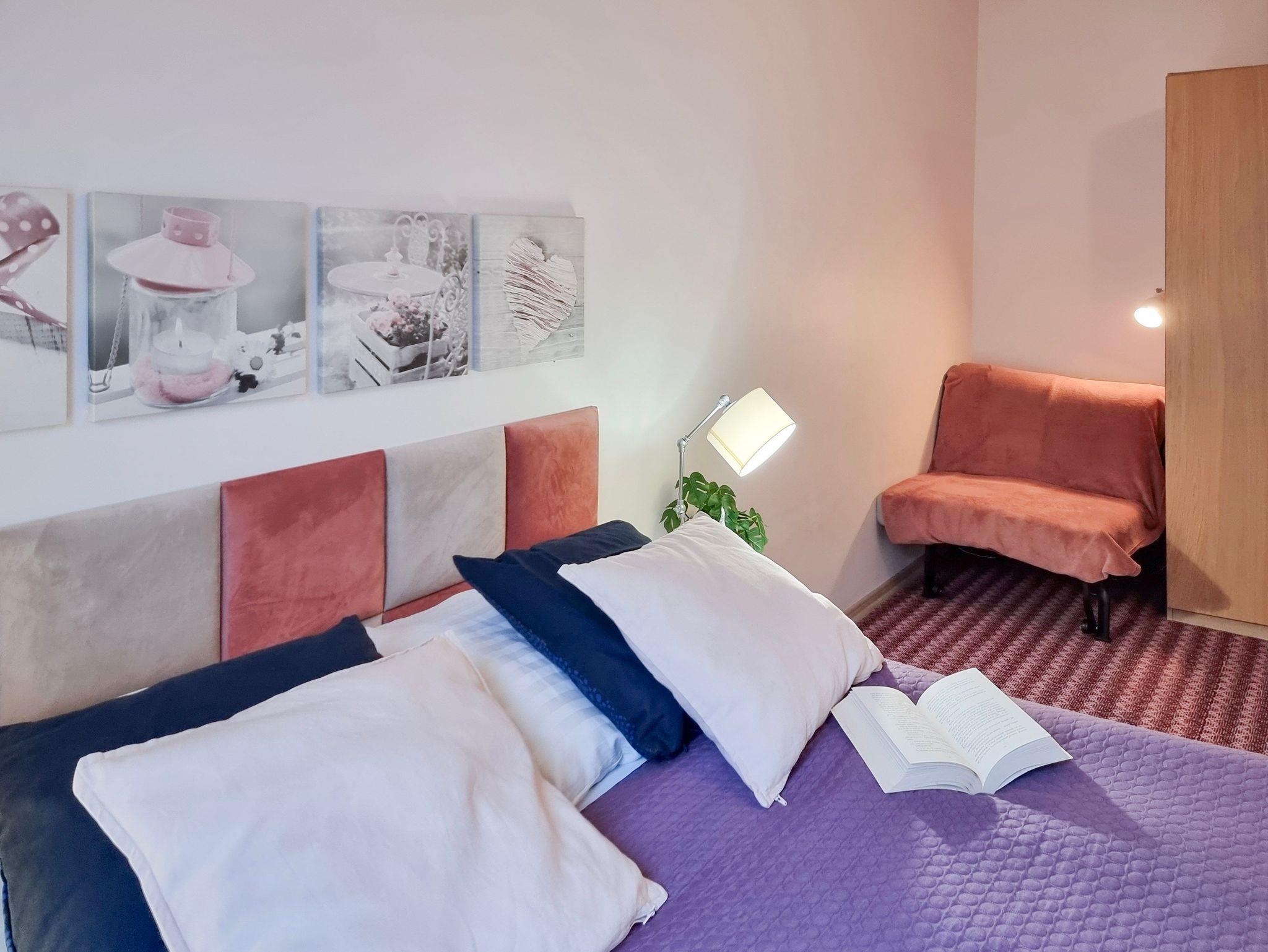.Im Schlafzimmer, dessen Fenster nach Westen zeigt, gibt es ein bequemes kontinentales Doppelbett (2x70 cm) mit der Möglichkeit, die Matratzen auszuziehen, ein ausziehbares Einzelsofa (90 x 195 cm) und einen Kleiderschrank.