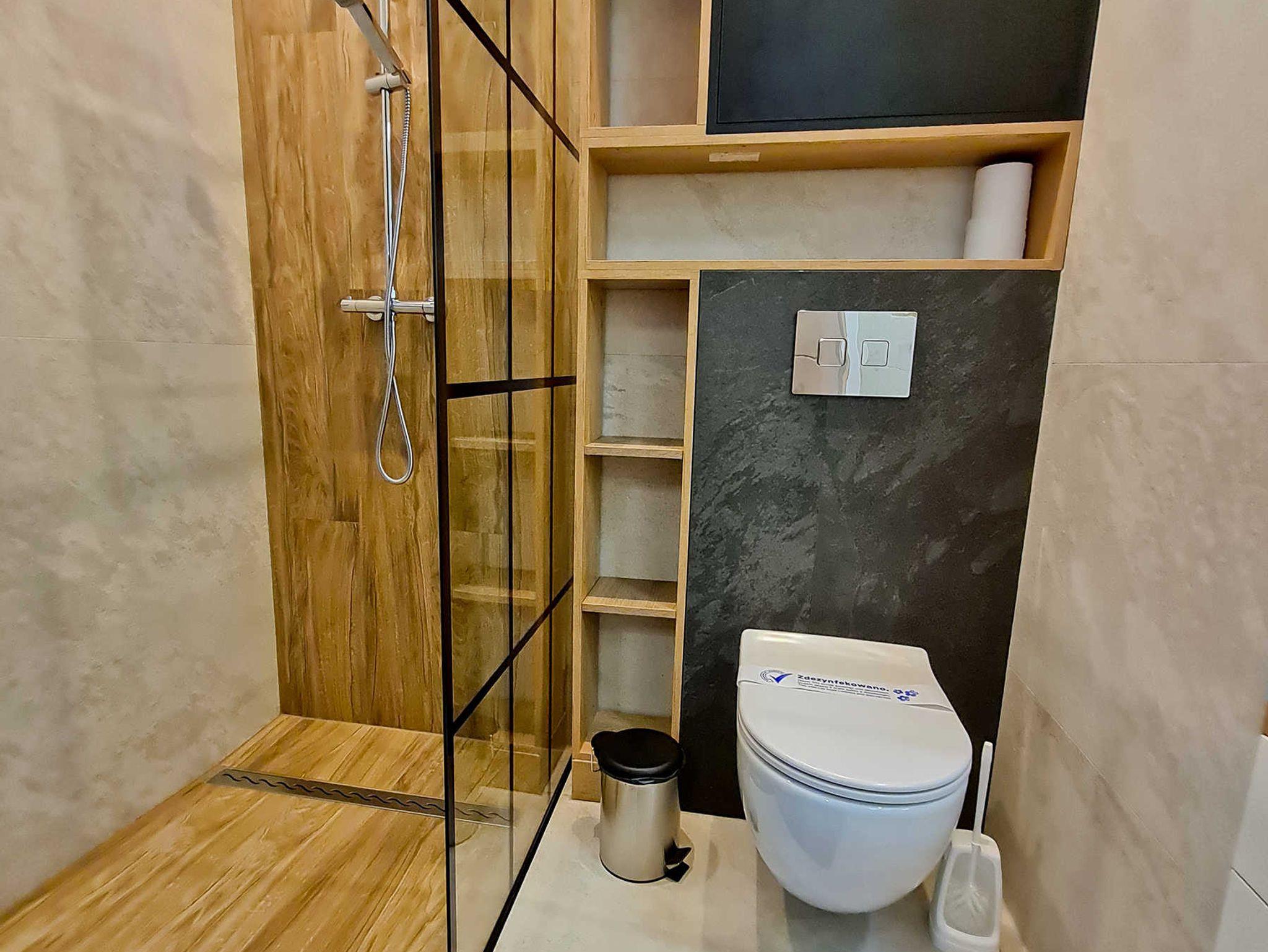 Im Badezimmer befindet sich eine Duschkabine mit Bodenablauf und WC.