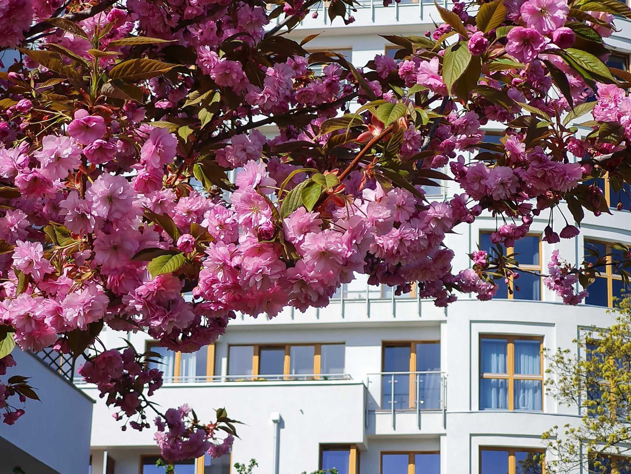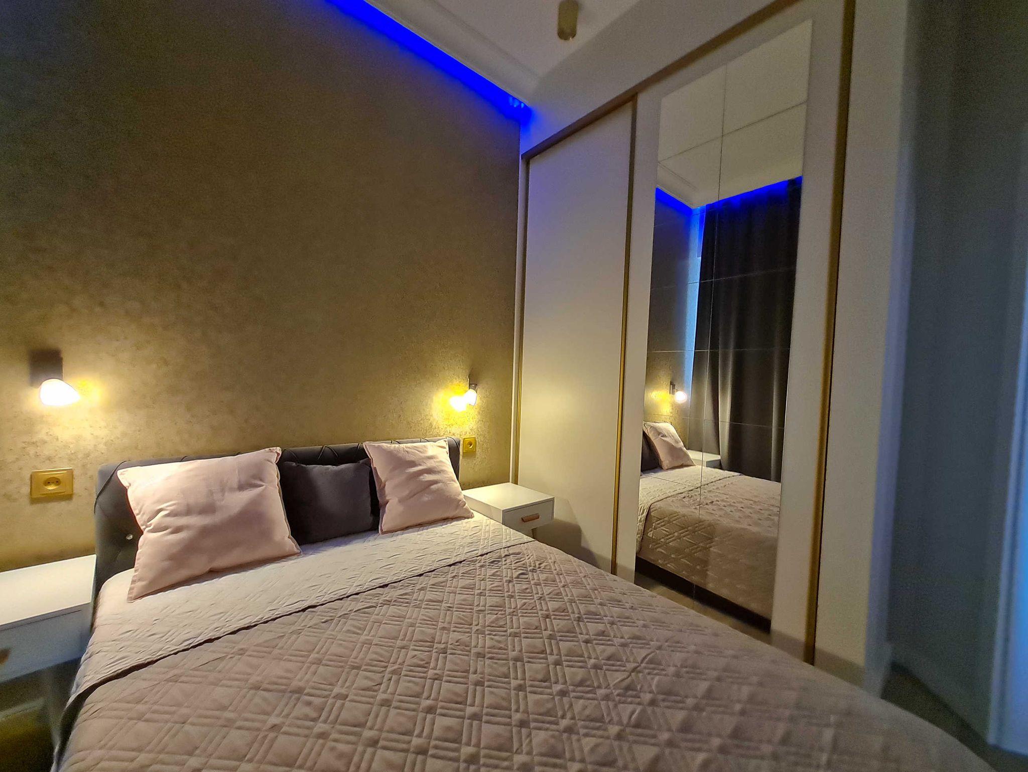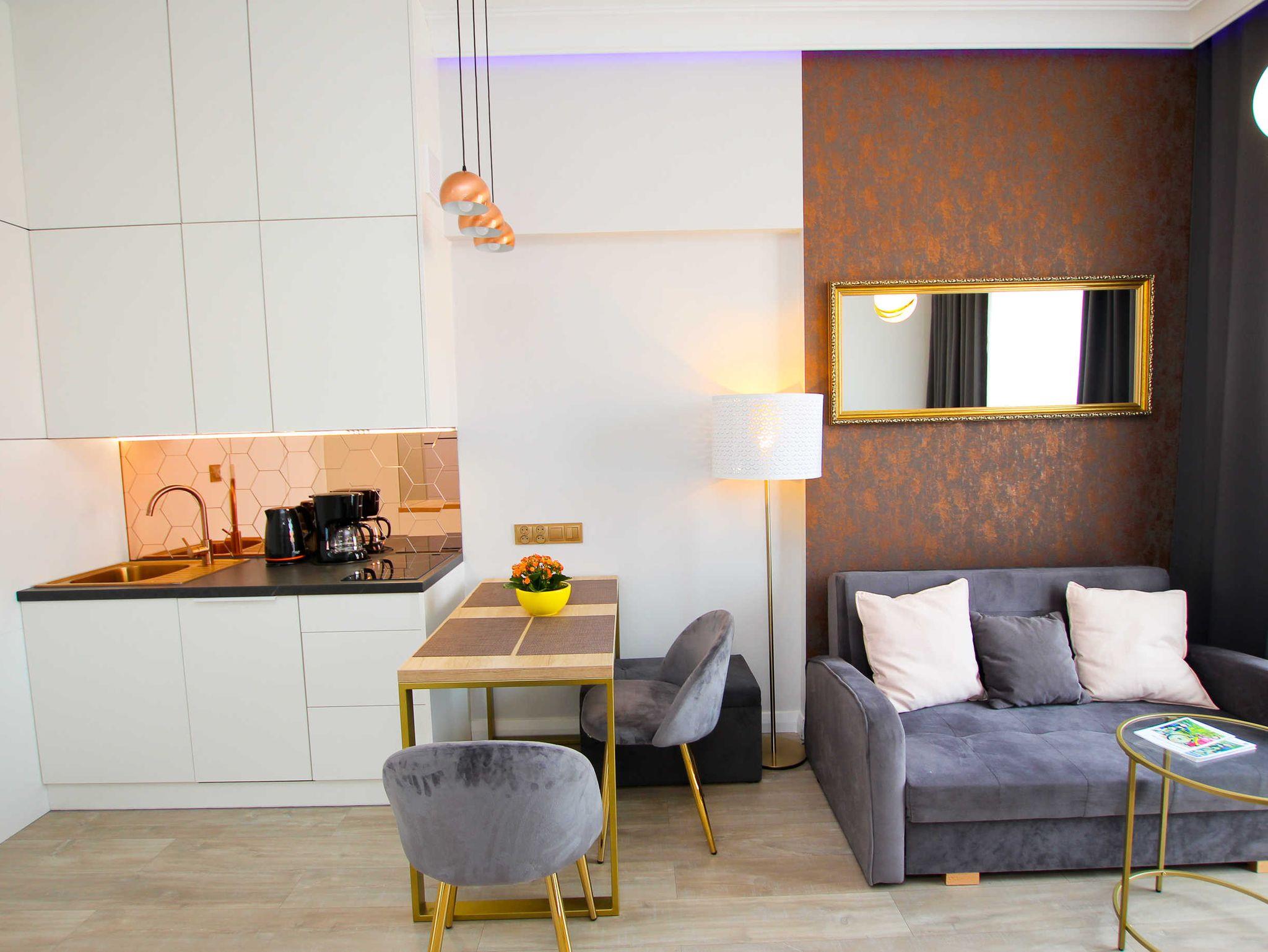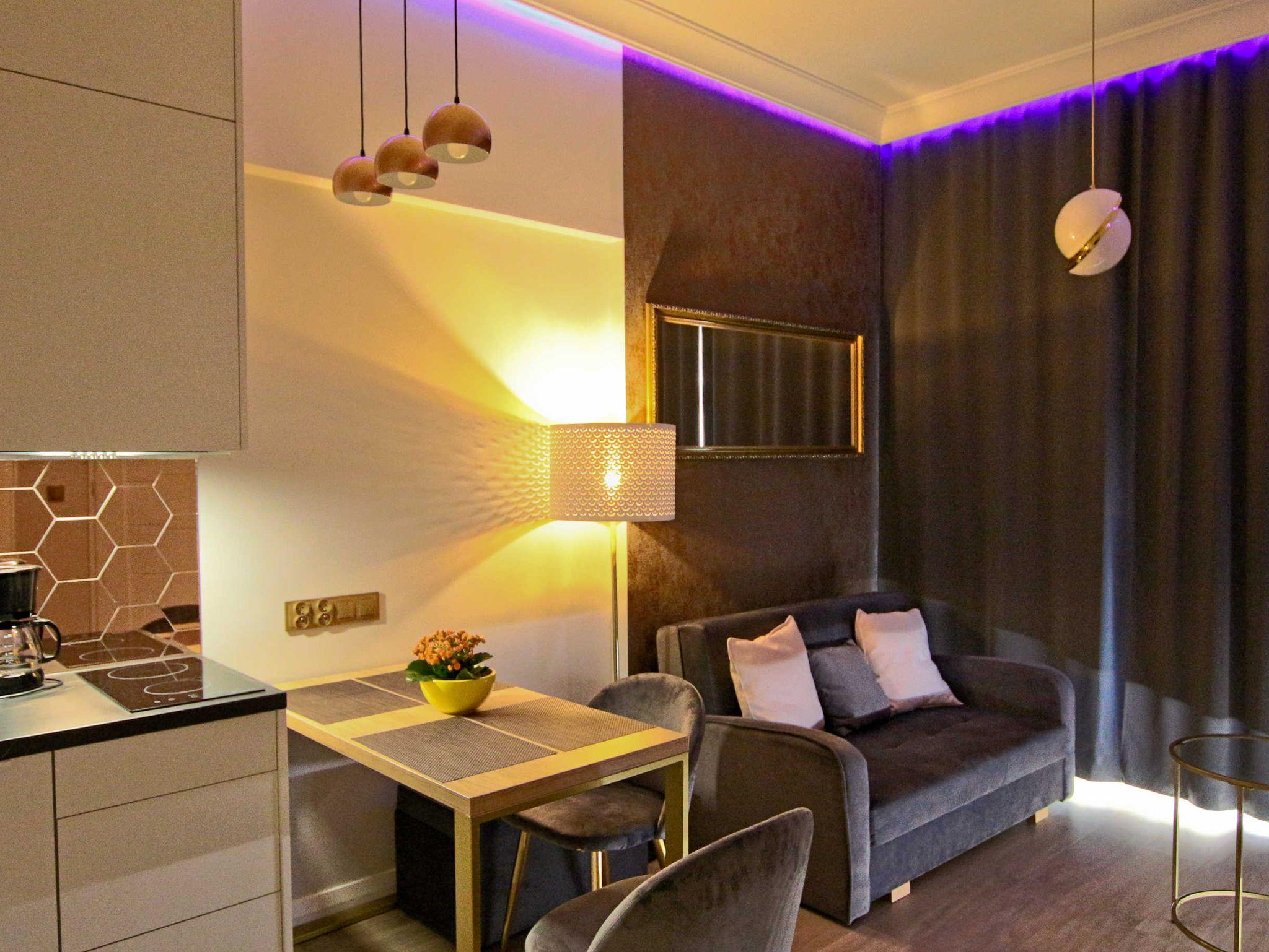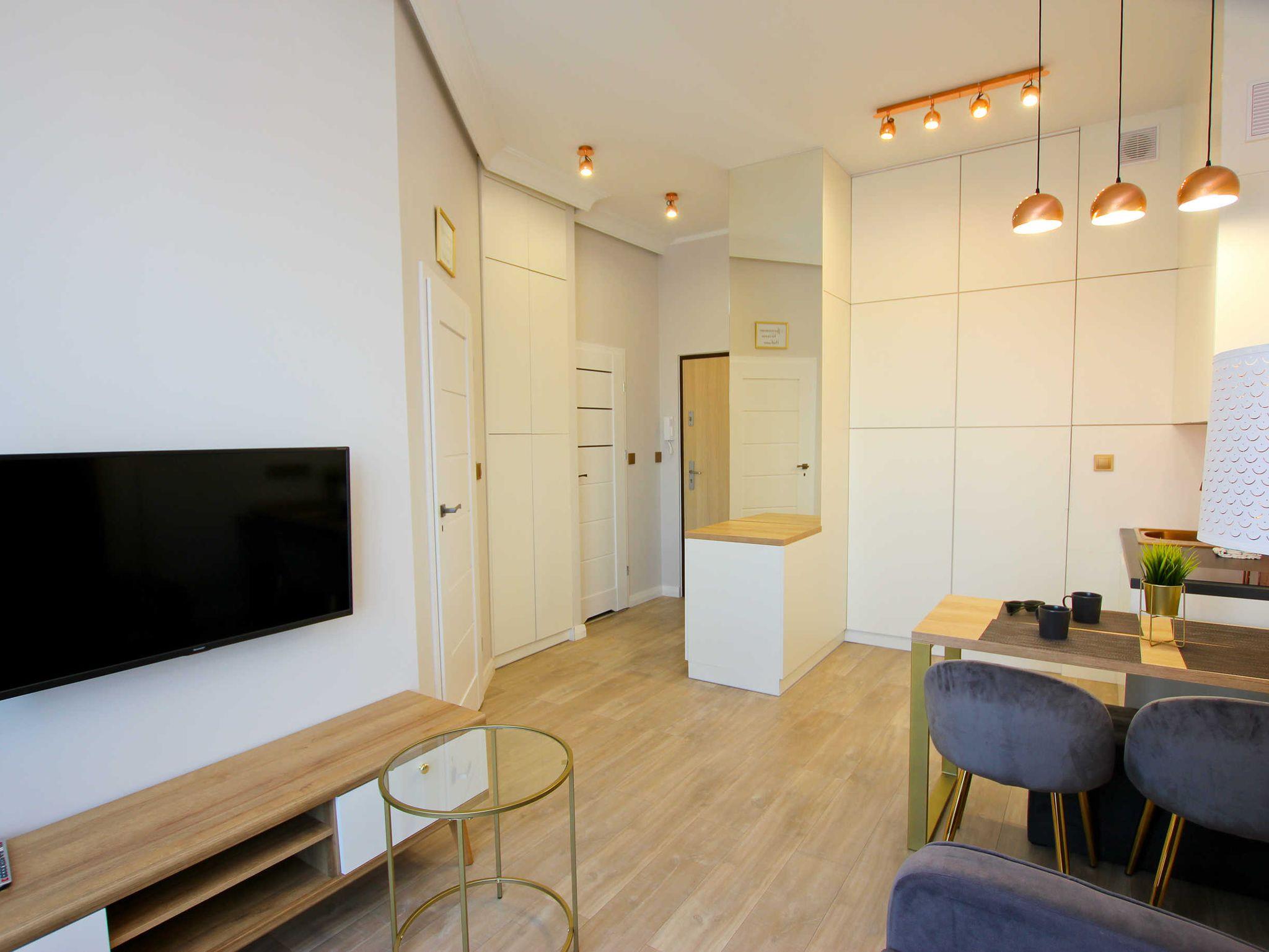 Das modern eingerichtete 2-Zimmer-Apartment mit der Fläche von 31m2 besteht aus einem Wohnzimmer mit Sitzecke und Küchenzeile und einem Schlafzimmer. Die Fenster und Balkon der Wohnung sind nach Nord ausgerichtet