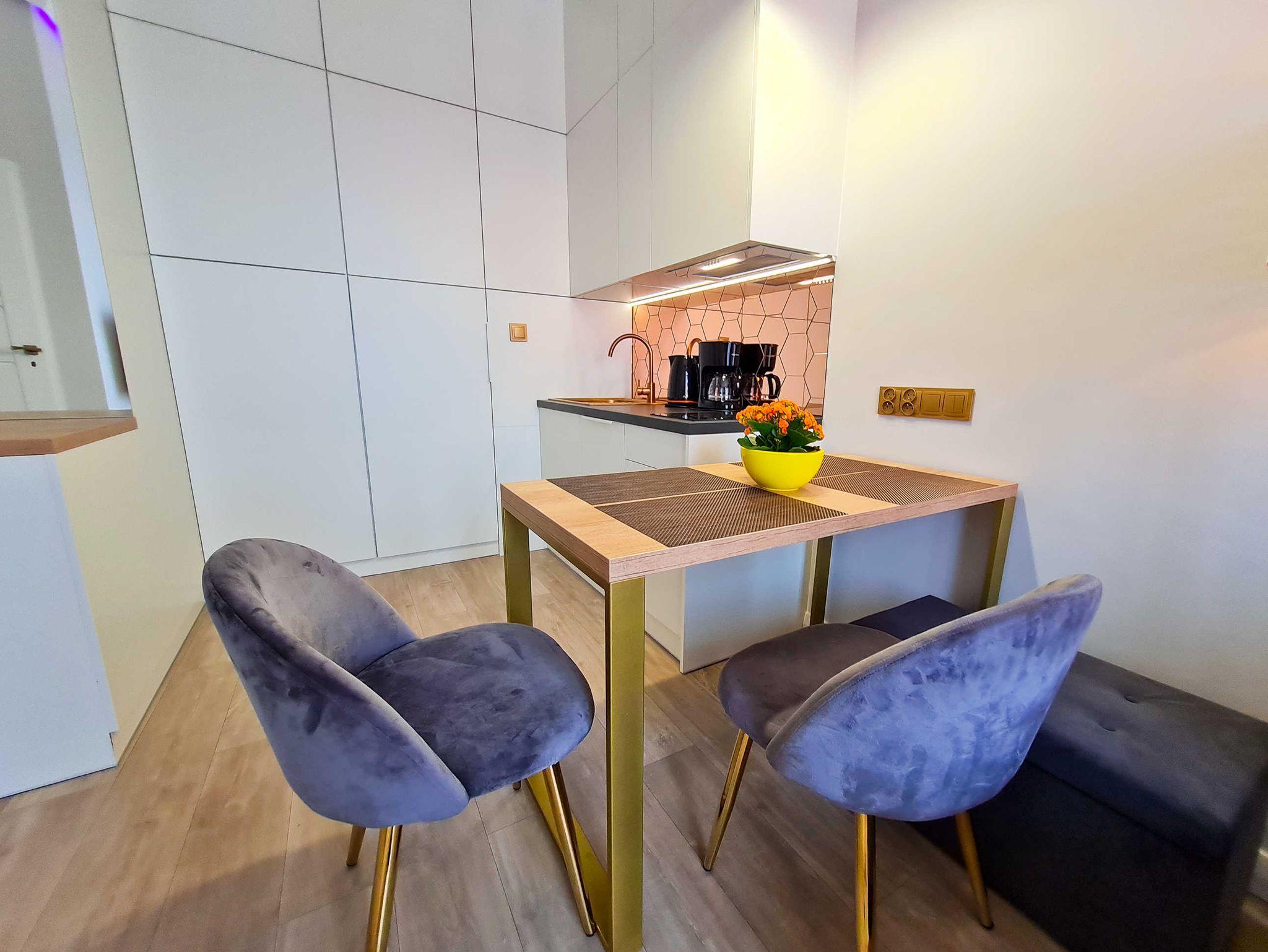 Das modern eingerichtete 2-Zimmer-Apartment mit der Fläche von 31m2 besteht aus einem Wohnzimmer mit Sitzecke und Küchenzeile und einem Schlafzimmer. Die Fenster und Balkon der Wohnung sind nach Nord ausgerichtet.