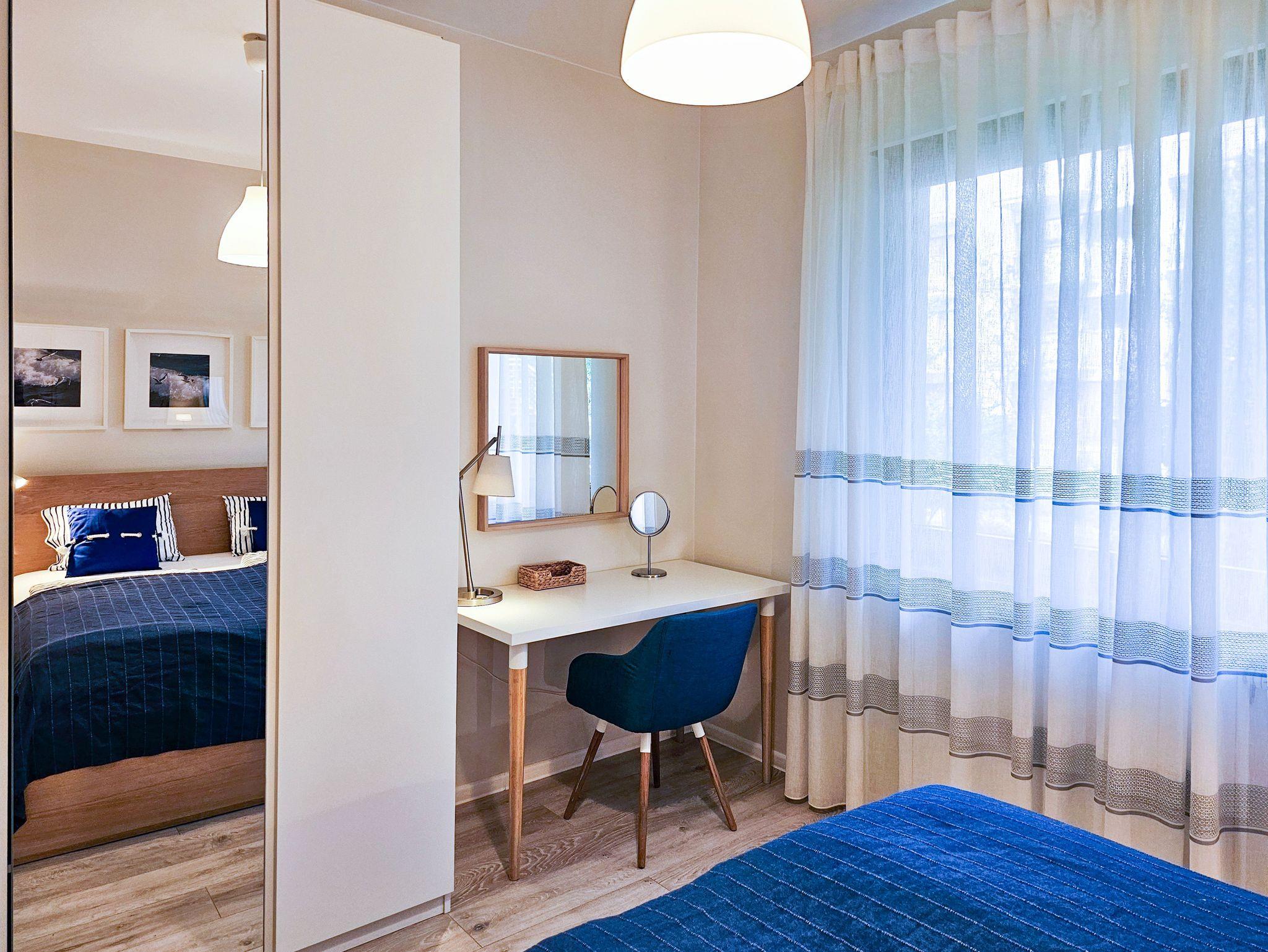 Sie besteht aus zwei Schlafzimmern und einem geräumigen Wohnzimmer mit Terrasse. Die Fenster der beiden Schlafzimmer sind nach Norden zum Innenhof gerichtet. Jedes Schlafzimmer ist mit einem Doppelbett, Kleiderschrank und einem Nachttisch mit Lampen ausgestattet, in einem der beiden befindet sich zusätzlich ein Frisiertisch.