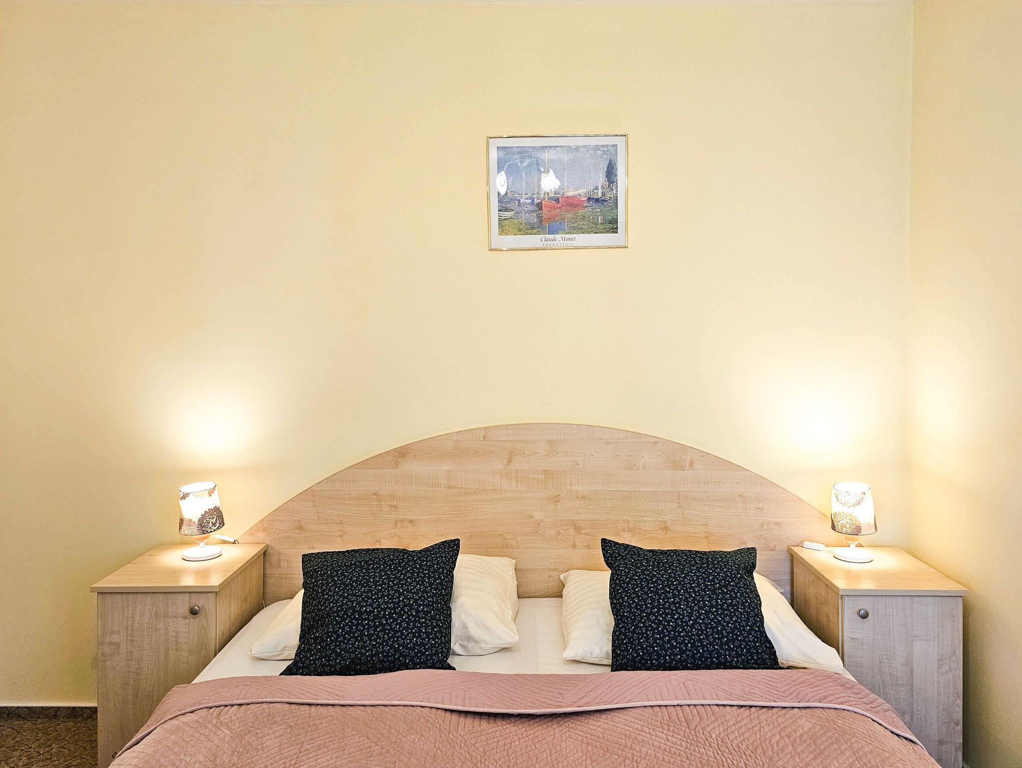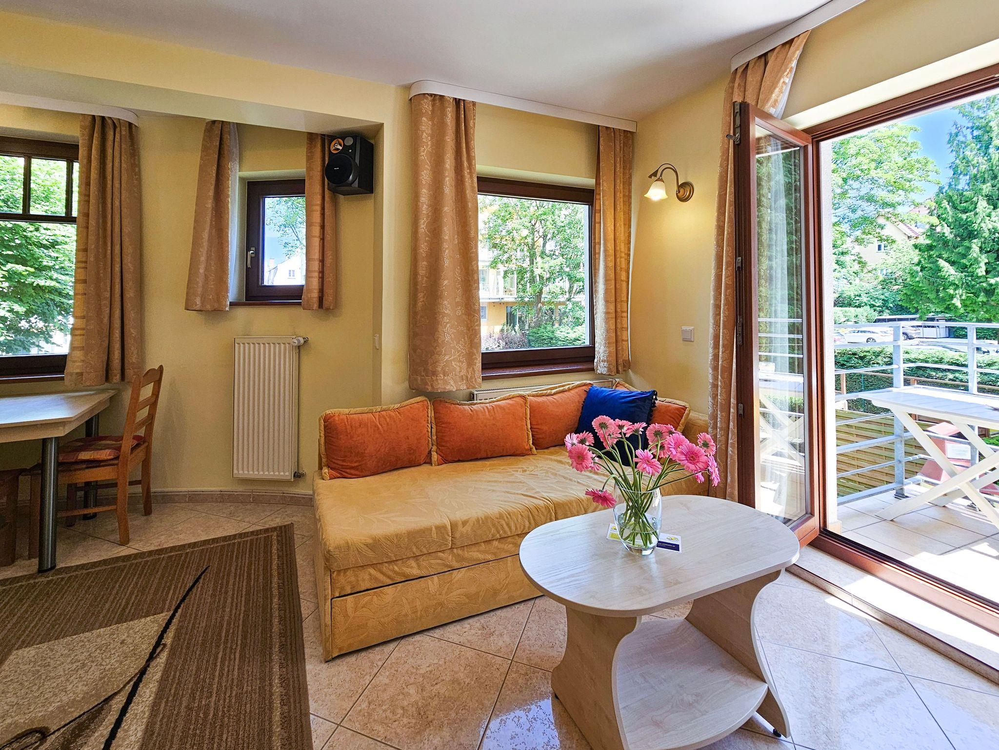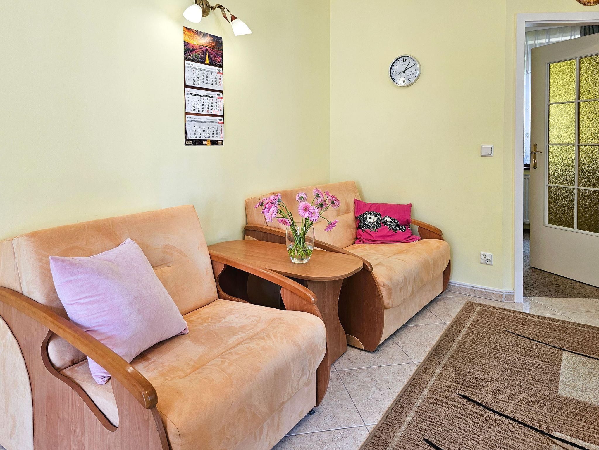 Eine große 2-Zimmer Wohnung mit ruhigem Schlafzimmer mit Ehebett, Wohnzimmer mit Doppelcouch, zwei Schlafsesseln und Balkon zur Hofseite, sowie einer gut ausgestatteten Küchenzeile. Im Bad steht eine Waschmaschine. Darüber hinaus haben Sie die Möglichkeit auf dem Hof einen Parkplatz (P) zu mieten.