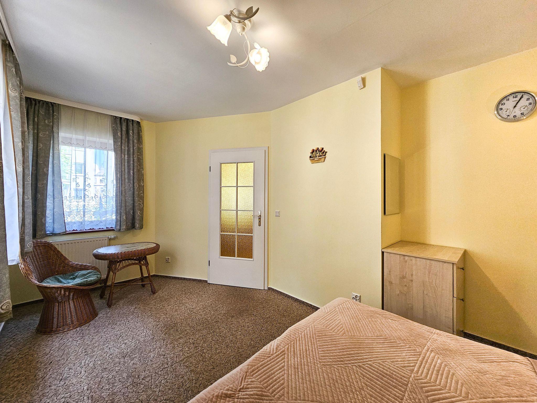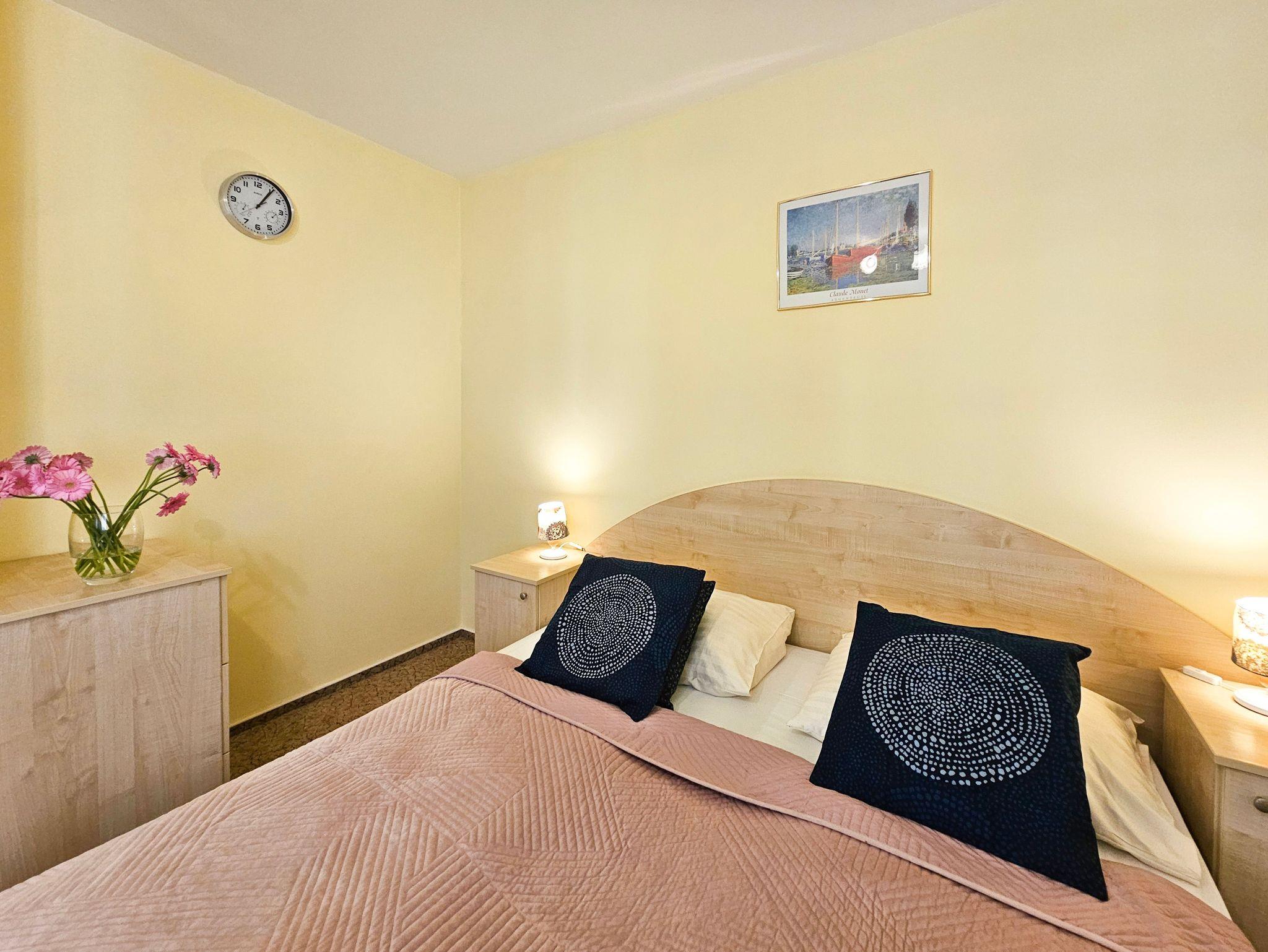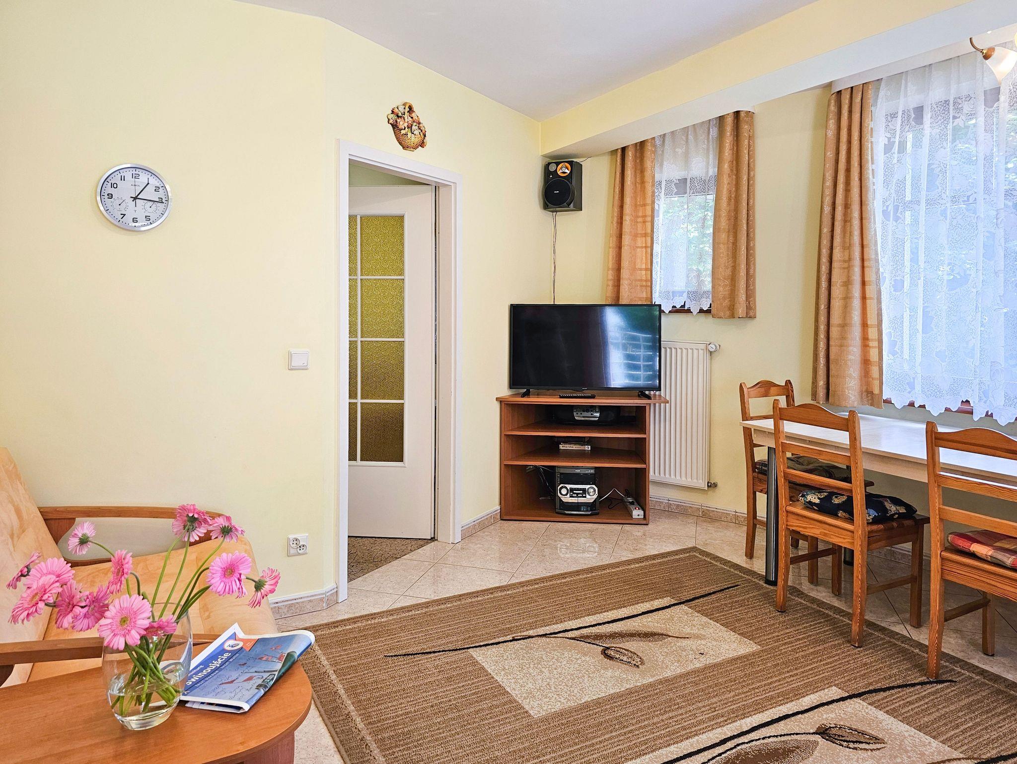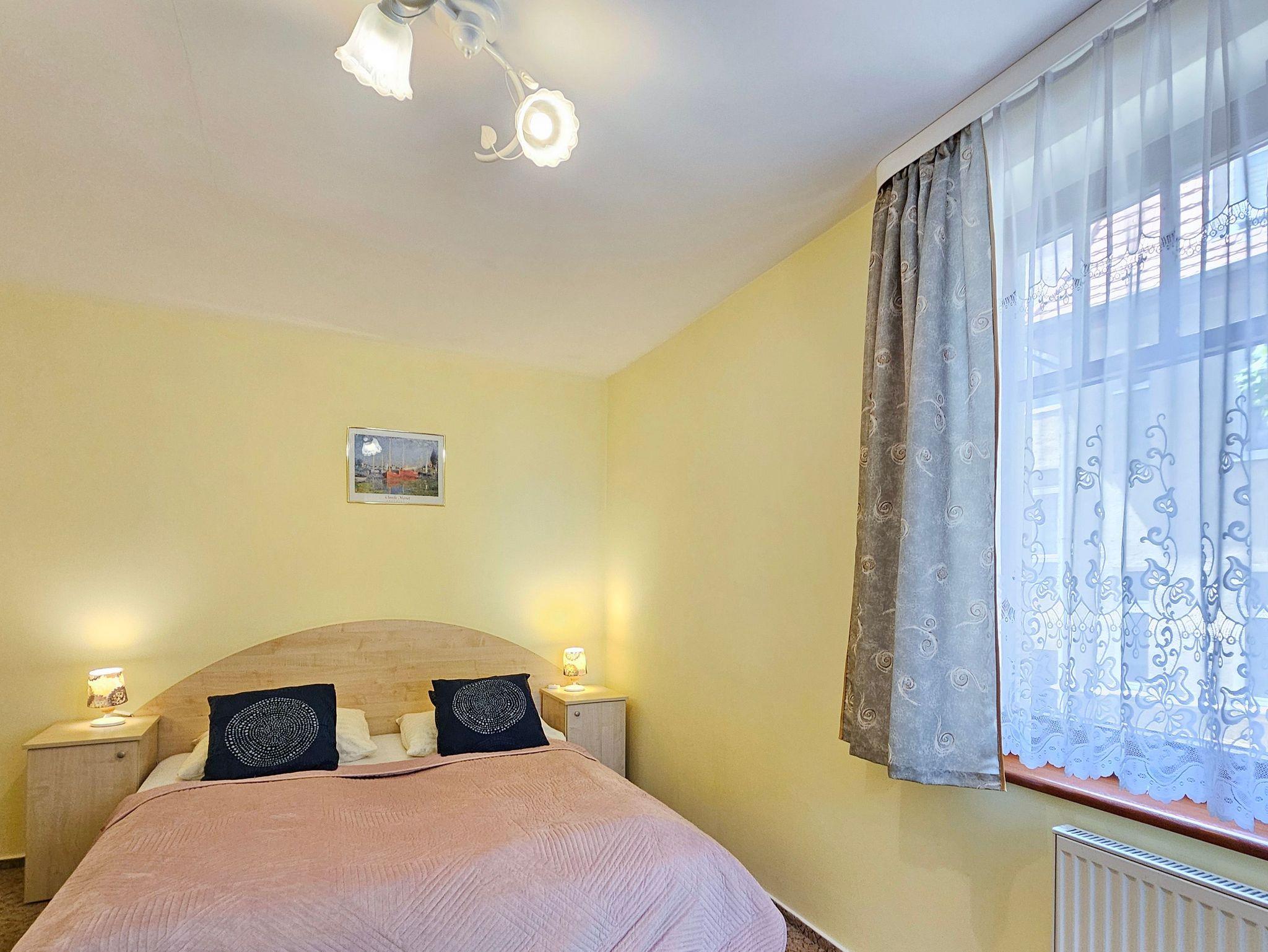 Eine große 2-Zimmer Wohnung mit ruhigem Schlafzimmer mit Ehebett, Wohnzimmer mit Doppelcouch, zwei Schlafsesseln und Balkon zur Hofseite, sowie einer gut ausgestatteten Küchenzeile. Im Bad steht eine Waschmaschine. Darüber hinaus haben Sie die Möglichkeit auf dem Hof einen Parkplatz (P) zu mieten.