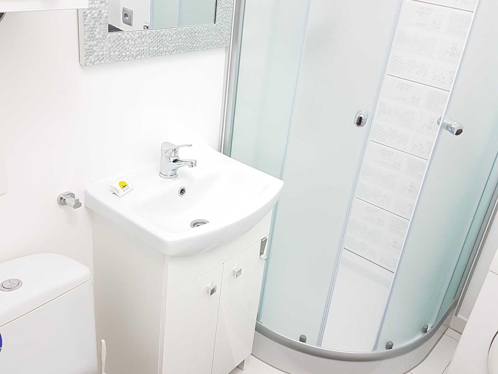 Das Badezimmer verfügt über eine Duschkabine, ein Waschbecken, ein WC sowie einen Gasdurchlauferhitzer zur Warmwasserbereitung.
