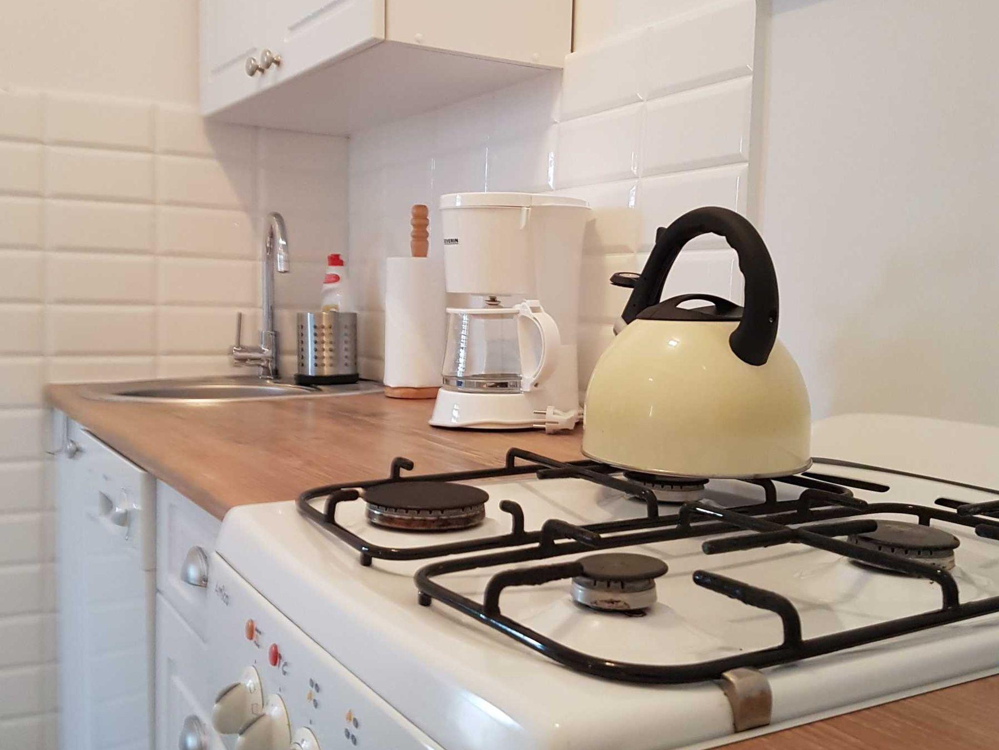 Die separate Küche ist mit einem Gasherd mit Backofen, einem Kühlschrank mit Gefrierfach, einer Filterkaffeemaschine, einem Toaster und einer Spülmaschine ausgestattet. In der Küche befinden sich außerdem das notwendige Geschirr und Besteck zum Zubereiten und Verzehren von Mahlzeiten. Die Küche ist eine sogenannte „Innenküche“ ? ein separater Raum innerhalb der Wohnung ohne Fenster.