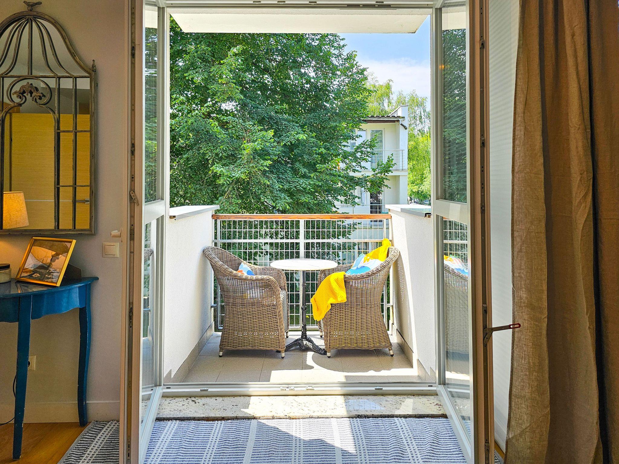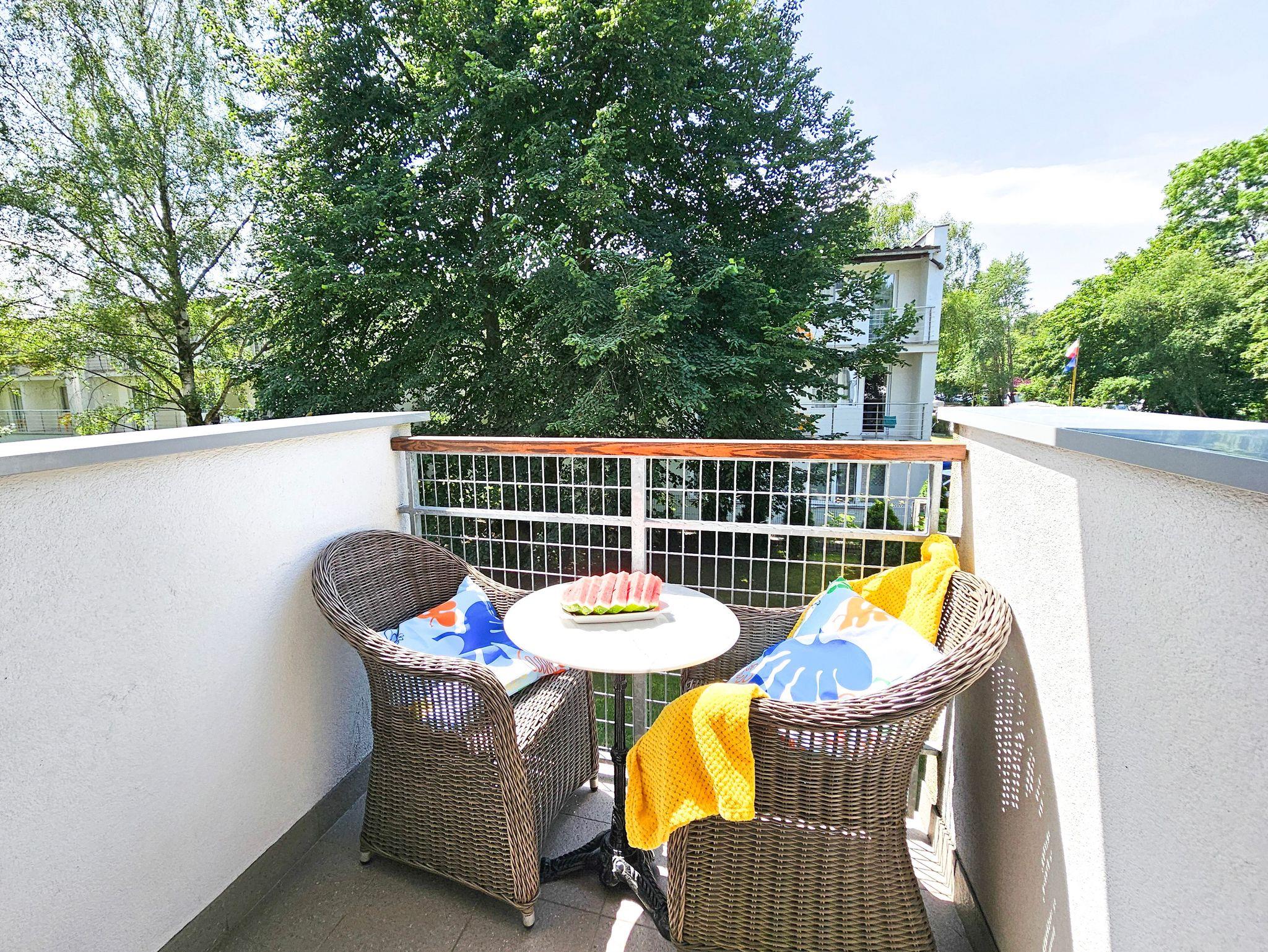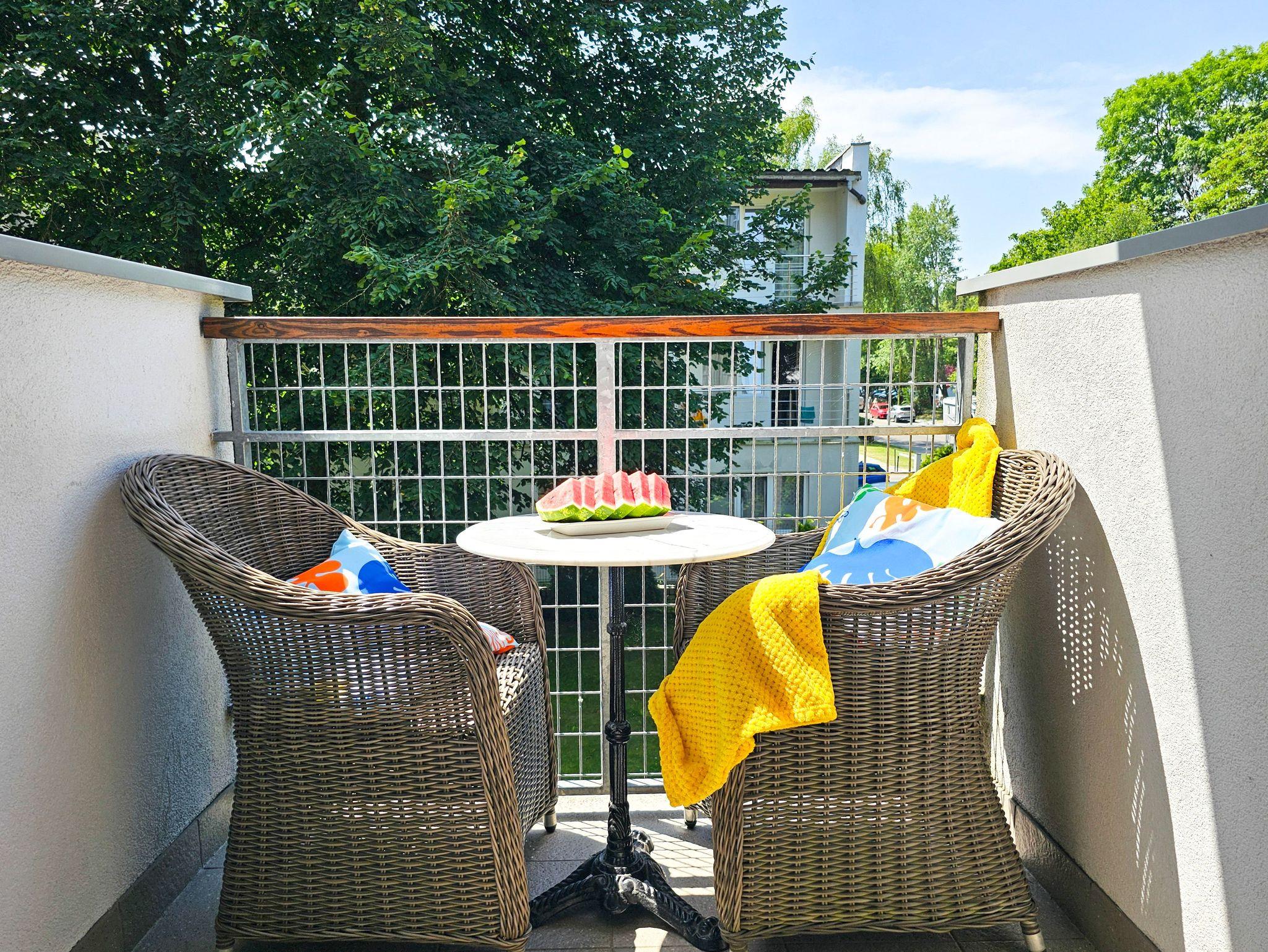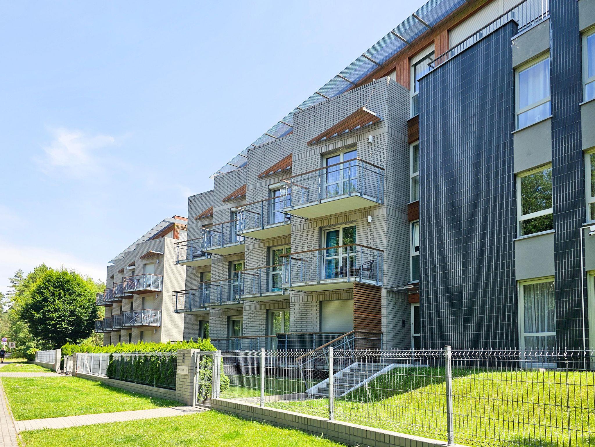 Die Ferienwohnung befindet sich in dem Komplex Baltycka, der aus zwei Gebäuden besteht, die auf einem eingezäunten Grundstück liegen. Innerhalb der Anlage gibt es einen kleinen Spielplatz für Kinder, Bänke. Die Lage am Rande des Kurviertels, in unmittelbarer Nähe des Strandeingangs und nicht weit vom Grenzübergang zu Deutschland sind unbestrittene Vorteile dieses Standorts.