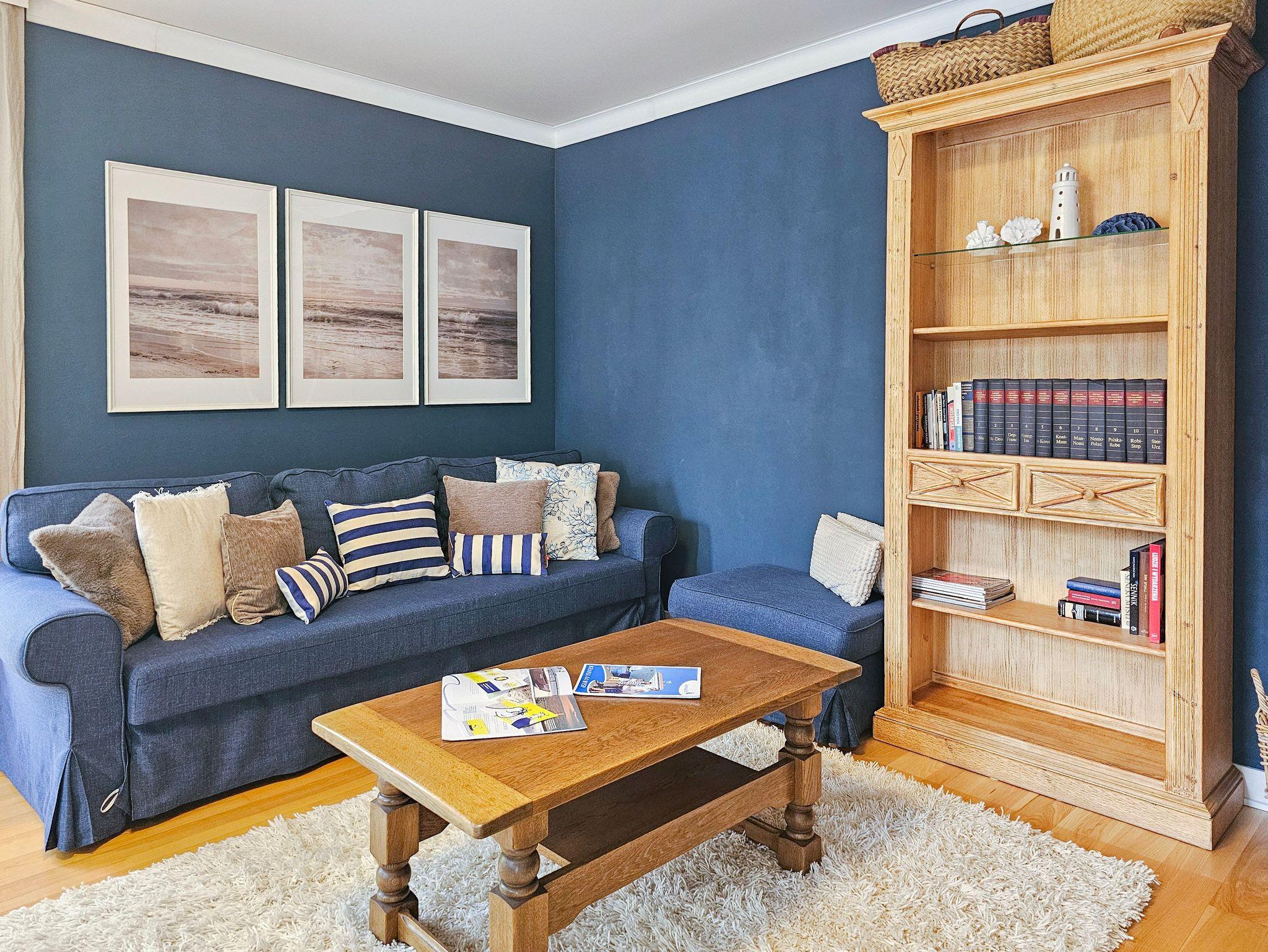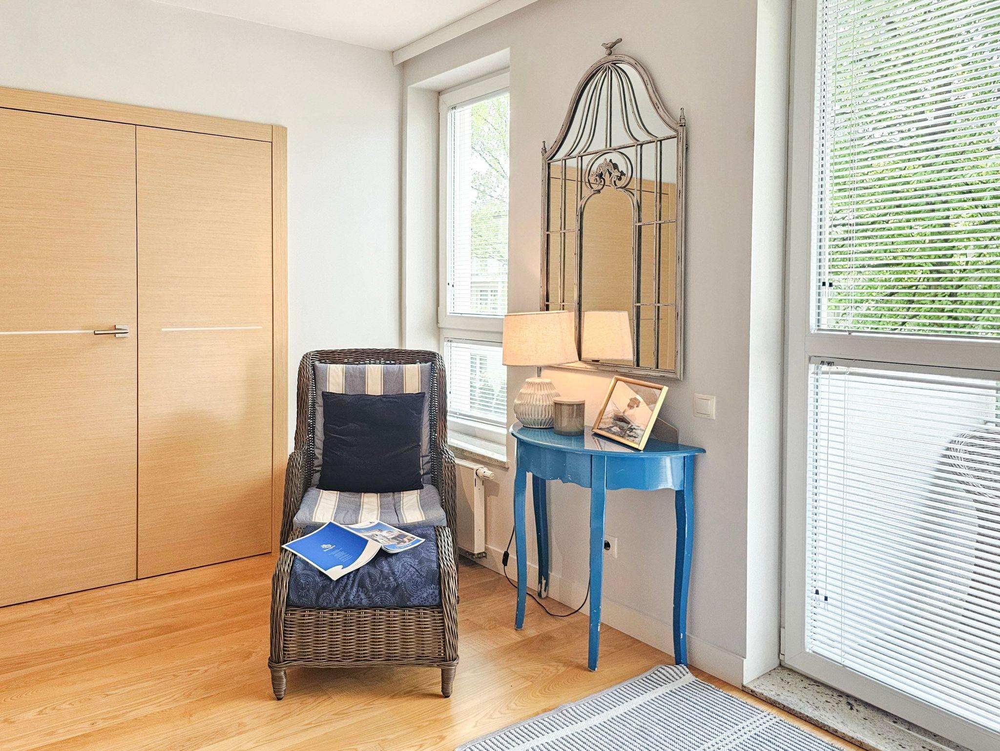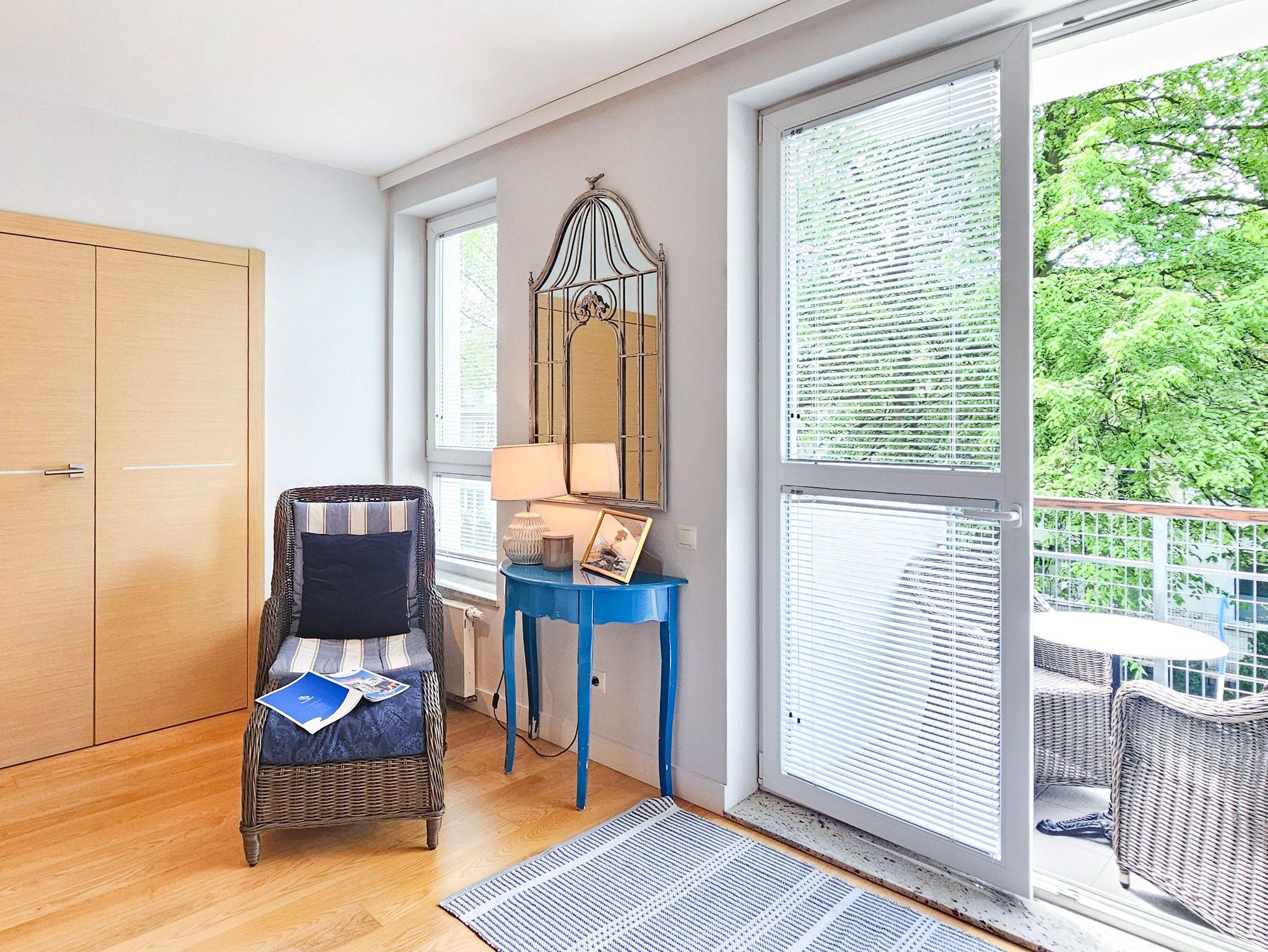 Im Wohnzimmer, von dem aus man auf den Balkon gelangt, stehen den Gästen ein bequemes Sofa (ausgeklappt mit einer Liegefläche von 140×200 cm), ein Couchtisch sowie ein Esstisch mit vier Sesseln zur Verfügung. Die Küchenzeile ist ausgestattet mit einem Kühlschrank, Wasserkocher, Filterkaffeemaschine, Toaster, Mikrowelle und Elektroherd. Zusätzlich steht ein Airfryer zur Verfügung. Die Fenster des Wohnzimmers sind nach Süden und Westen ausgerichtet, der Balkon liegt auf der Südseite.