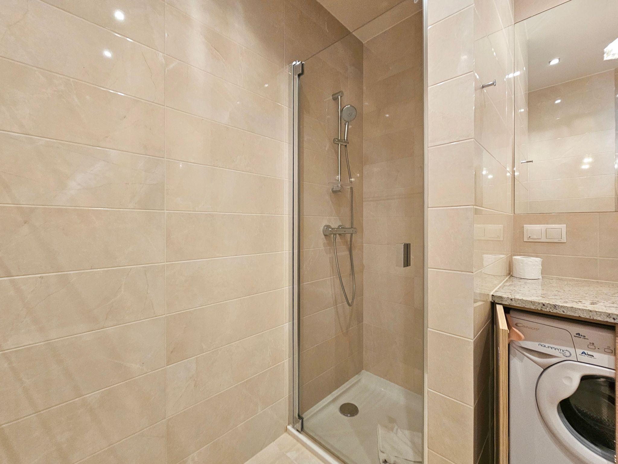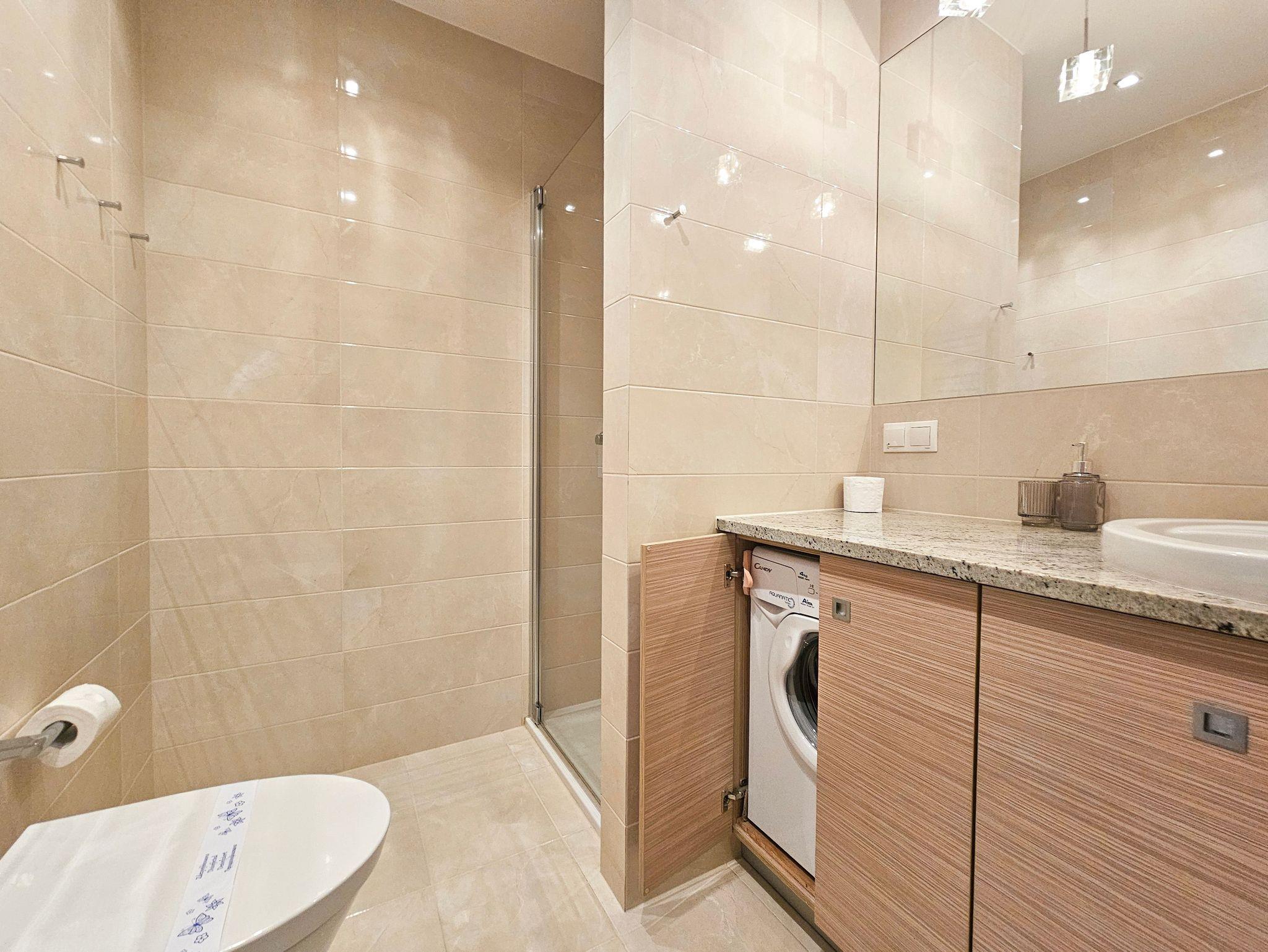 Das Badezimmer verfügt über eine Toilette, eine Duschkabine sowie eine Waschmaschine.
