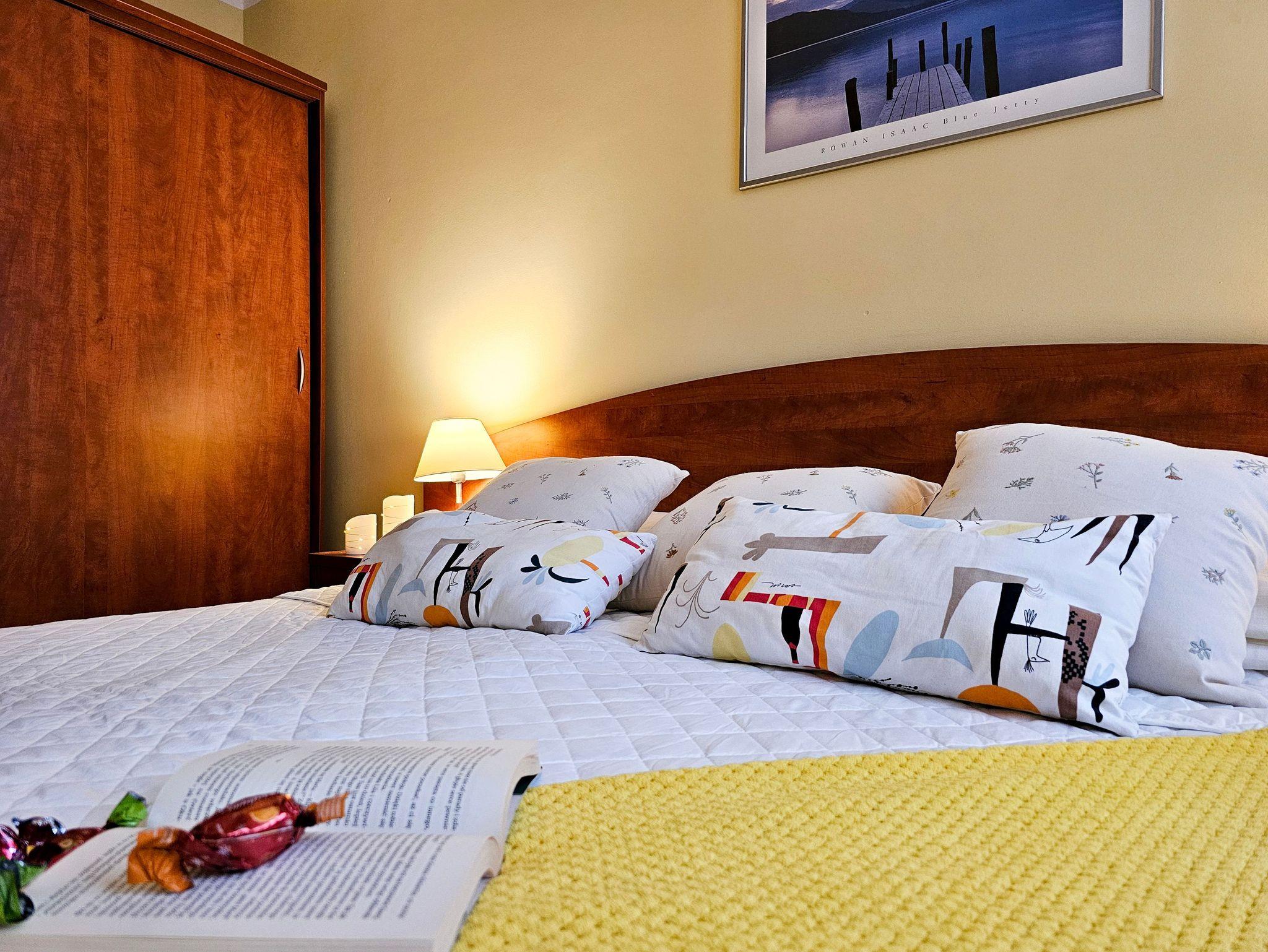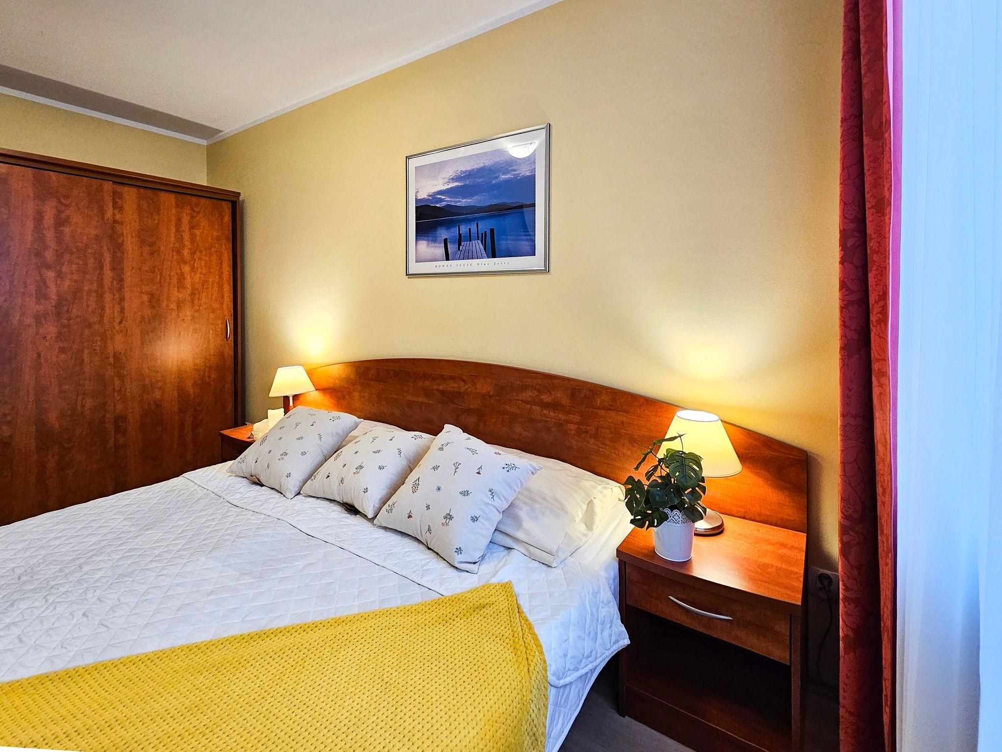 Schlafzimmer mit einem Doppelbett (160x200cm), Nachttischen, einem Kleiderschrank. Wohnzimmer mit Balkon und einem Tisch mit vier Stühlen. Die Wohnung hat der Balkon. Die Fenster und Balkon nach Nord ausgerichtet sind. Badezimmer mit Dusche, WC und Waschbecken.