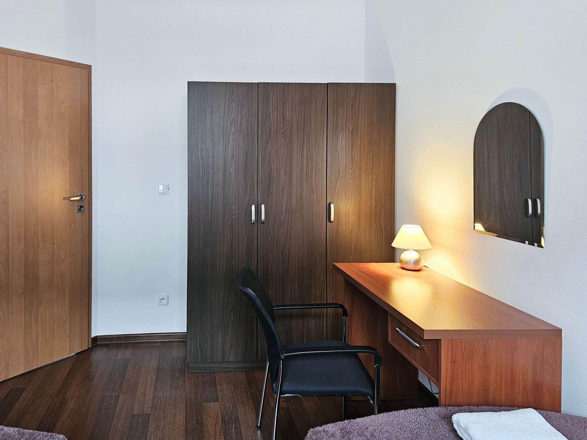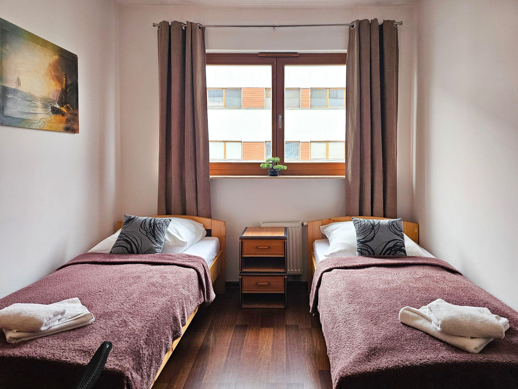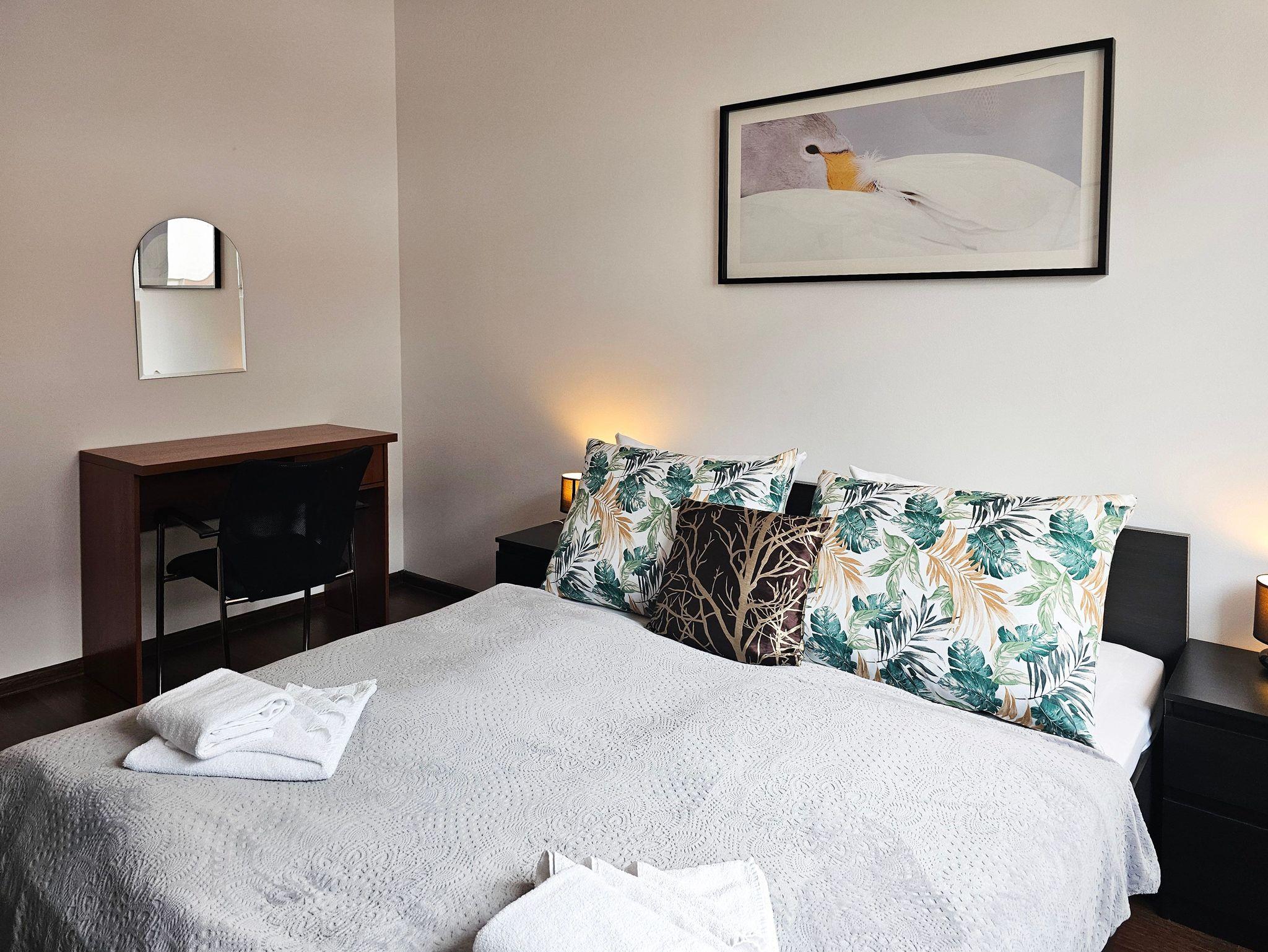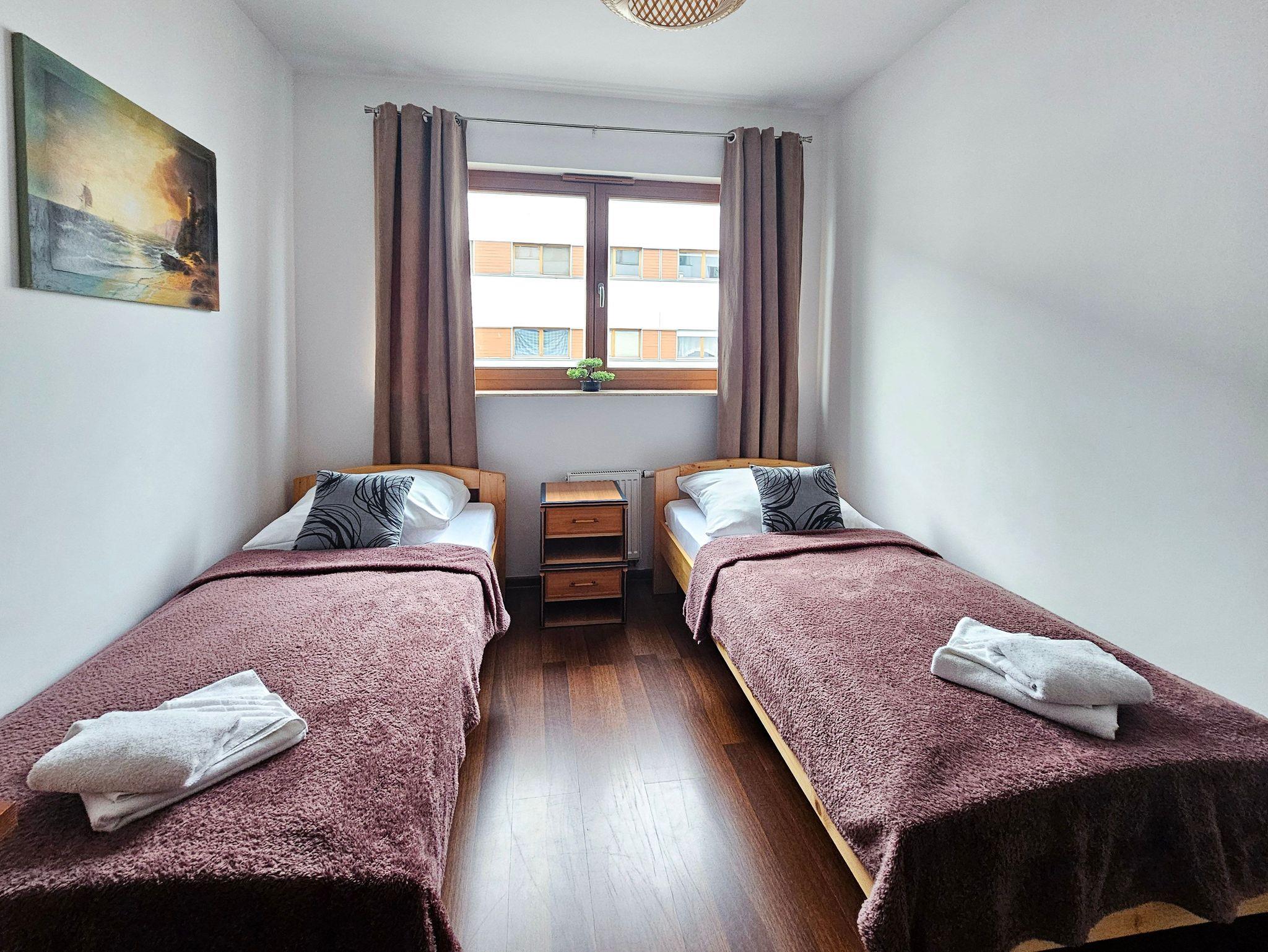 Die Wohnung besteht aus zwei gemütlichen Schlafzimmern. Im ersten Schlafzimmer befindet sich ein bequemes Doppelbett (160x200 cm). Das zweite Schlafzimmer ist mit zwei Einzelbetten (90x200 cm) ausgestattet.
