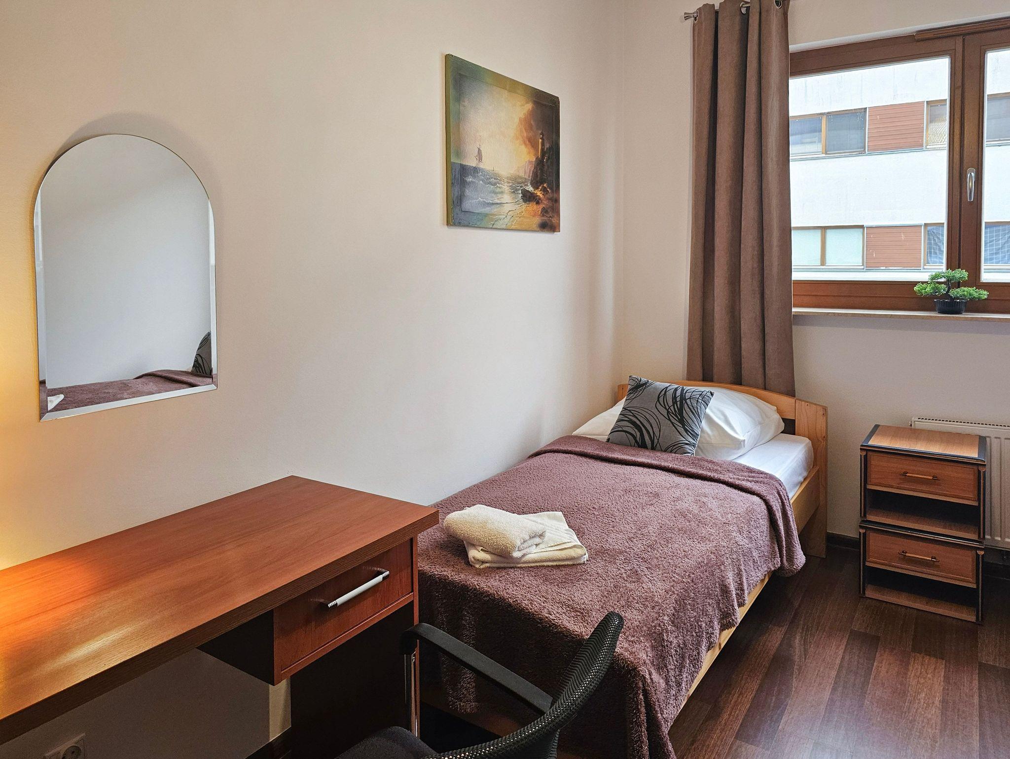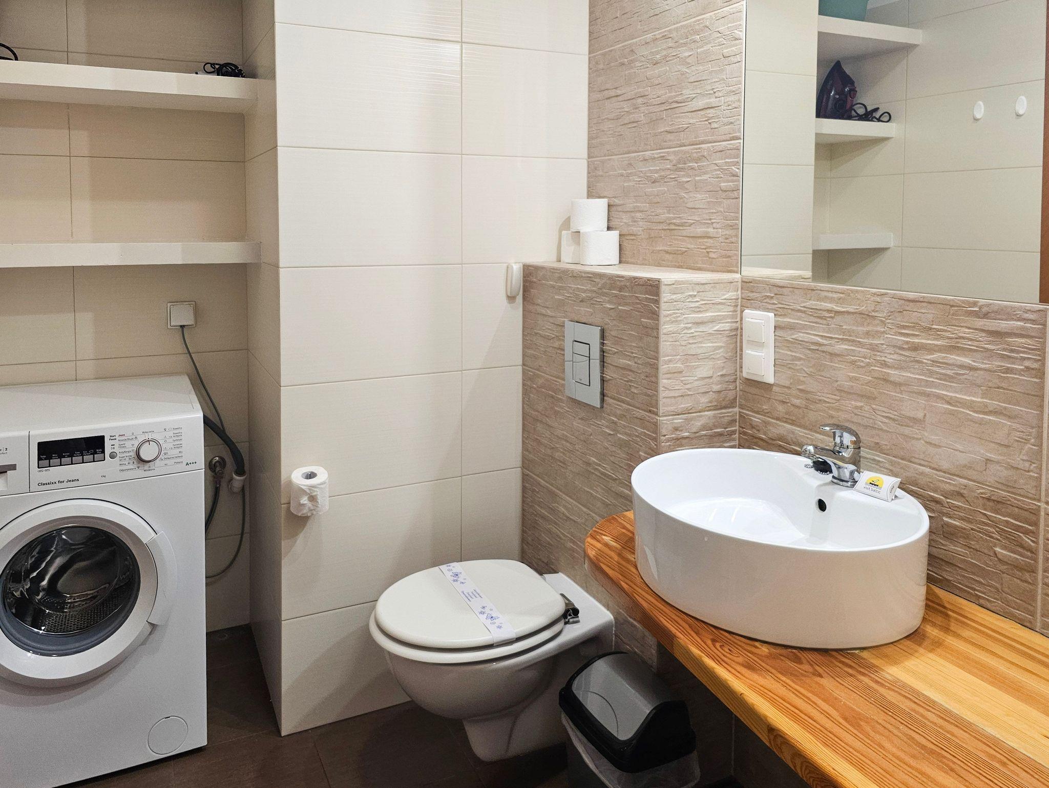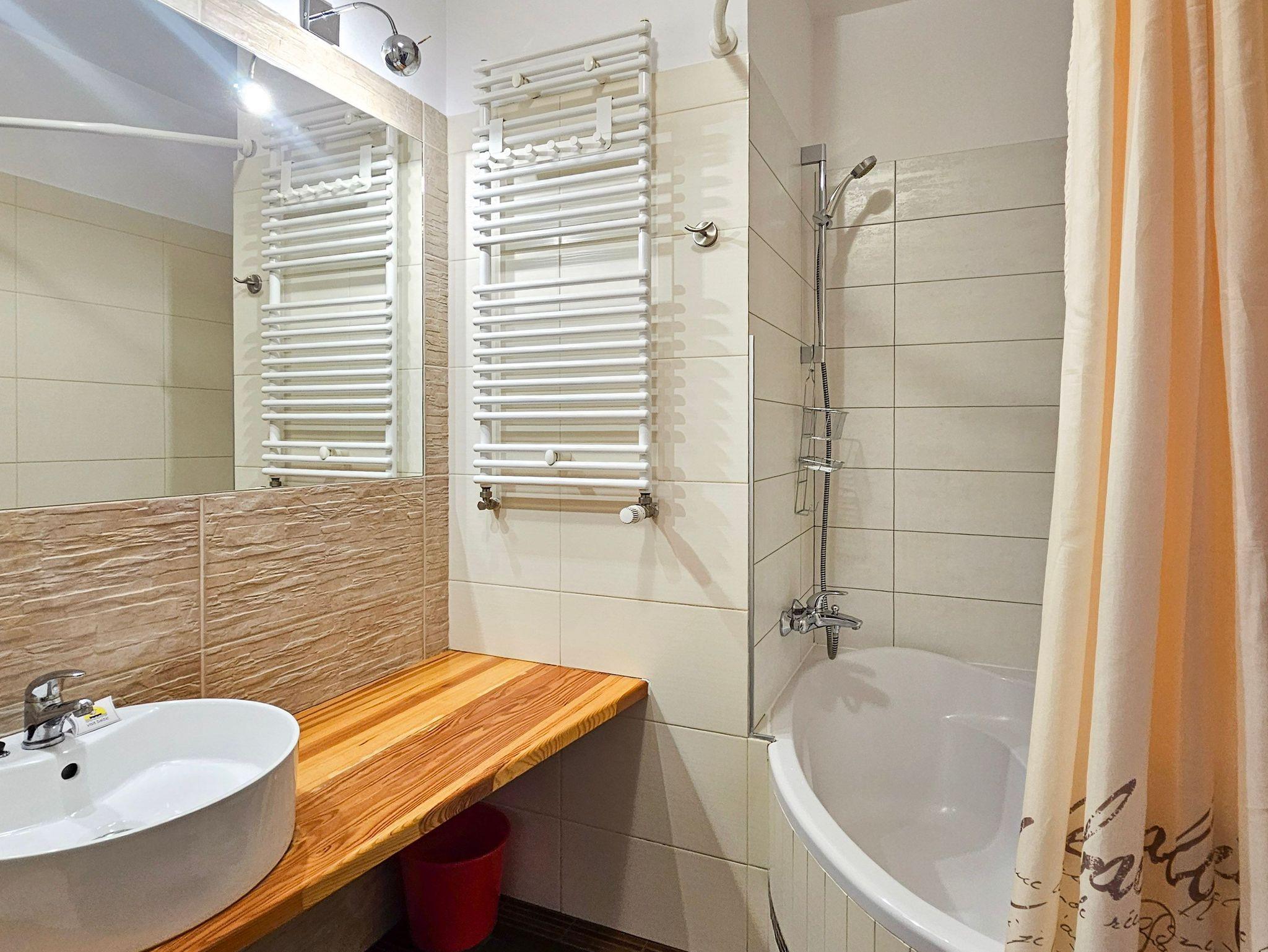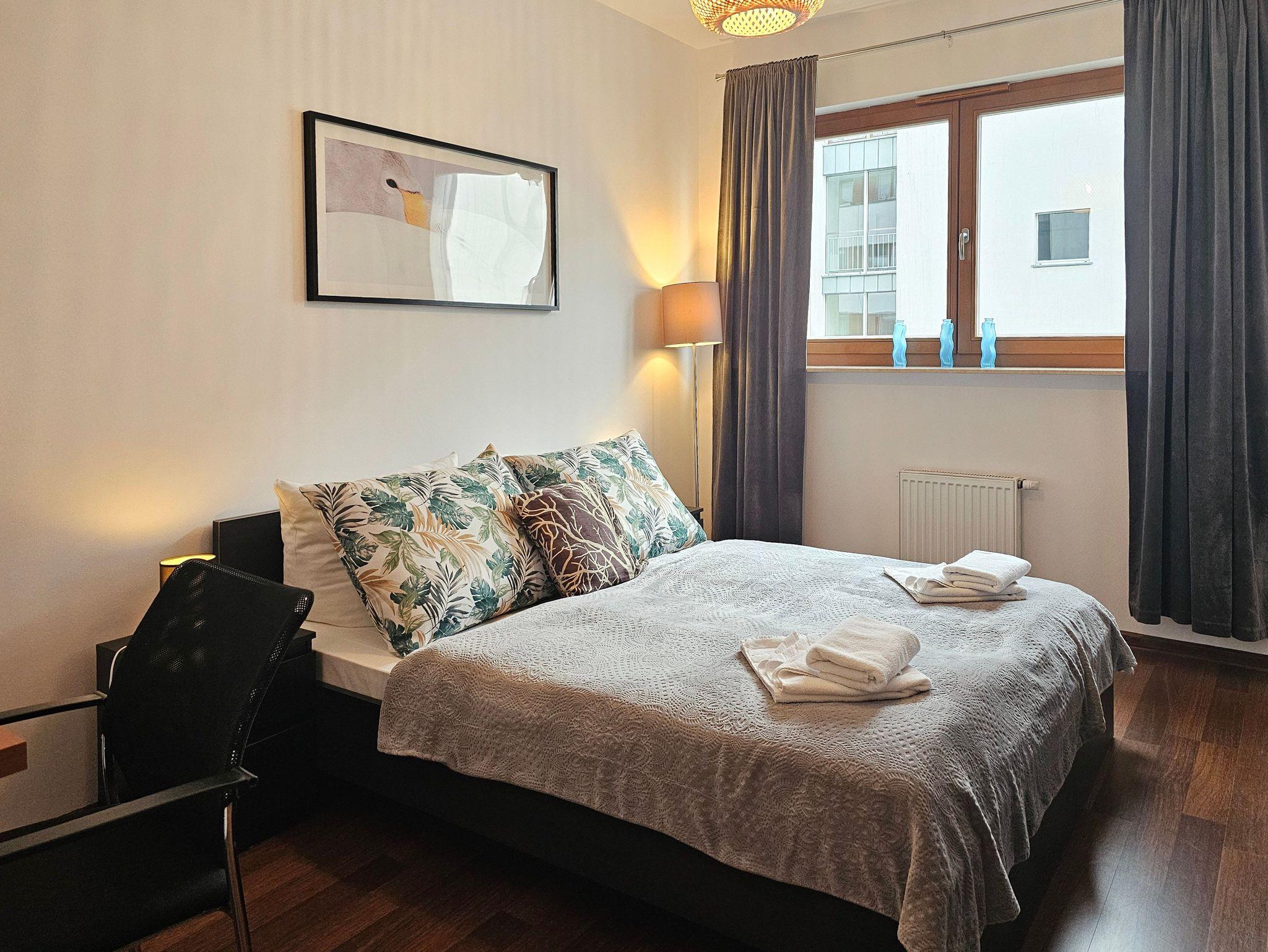 Die Wohnung besteht aus zwei gemütlichen Schlafzimmern. Im ersten Schlafzimmer befindet sich ein bequemes Doppelbett (160x200 cm). Das zweite Schlafzimmer ist mit zwei Einzelbetten (90x200 cm) ausgestattet.
