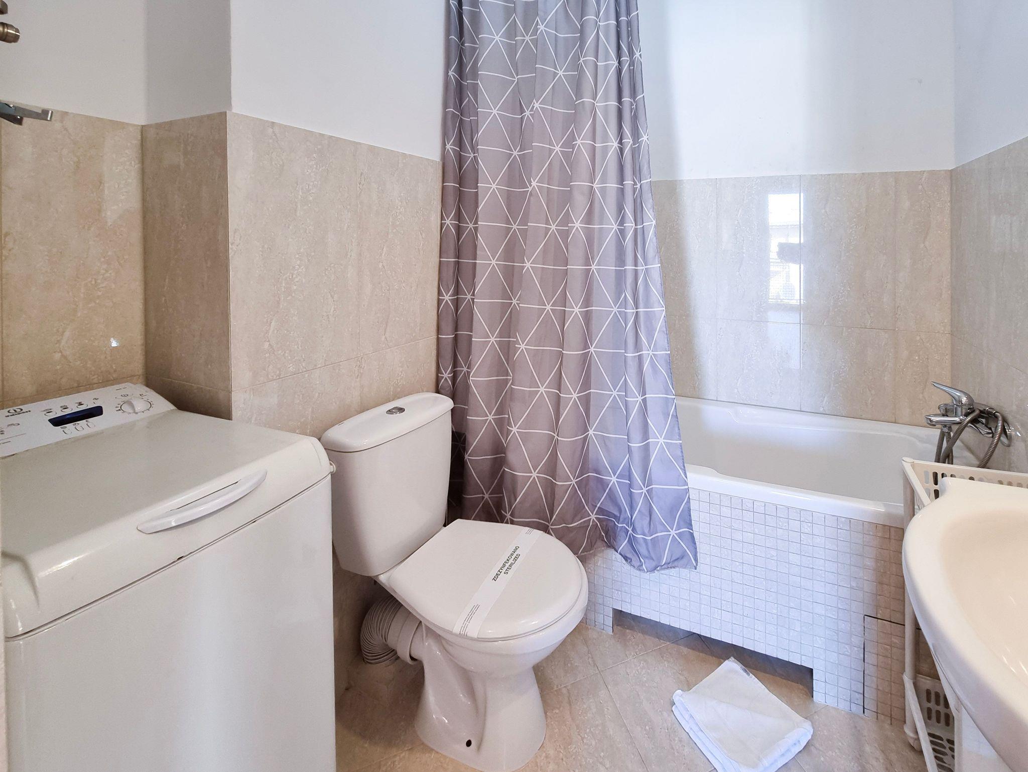 Das Badezimmer hat eine Badewanne, ein WC und ein Waschbecken sowie eine automatische Waschmaschine.