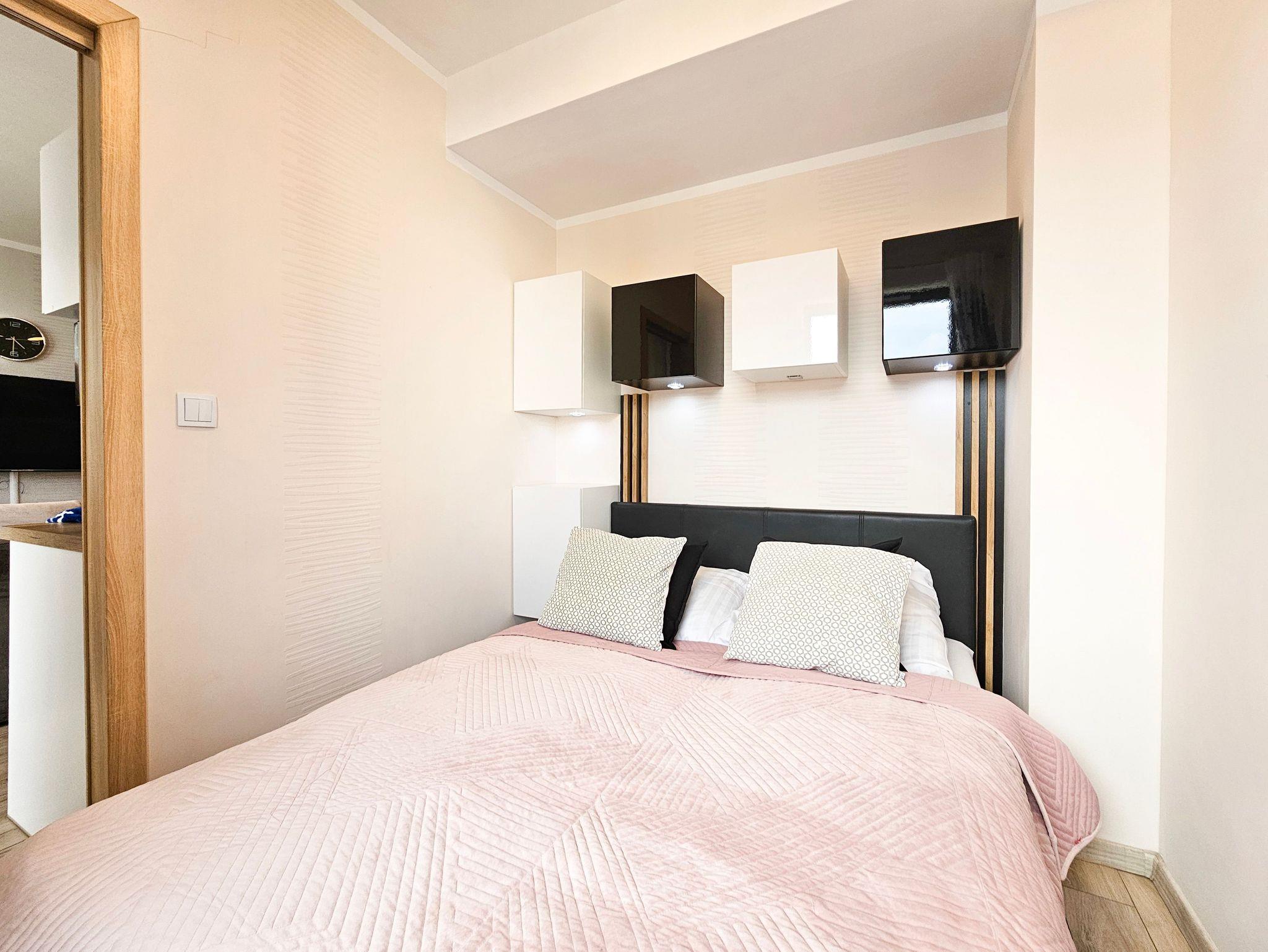 Das 30m2 große Apartment befindet sich im vierten Stock eines Gebäudes mit Aufzug und besteht aus einem Wohnzimmer mit Küchenzeile, Schlafzimmer und Badezimmer.