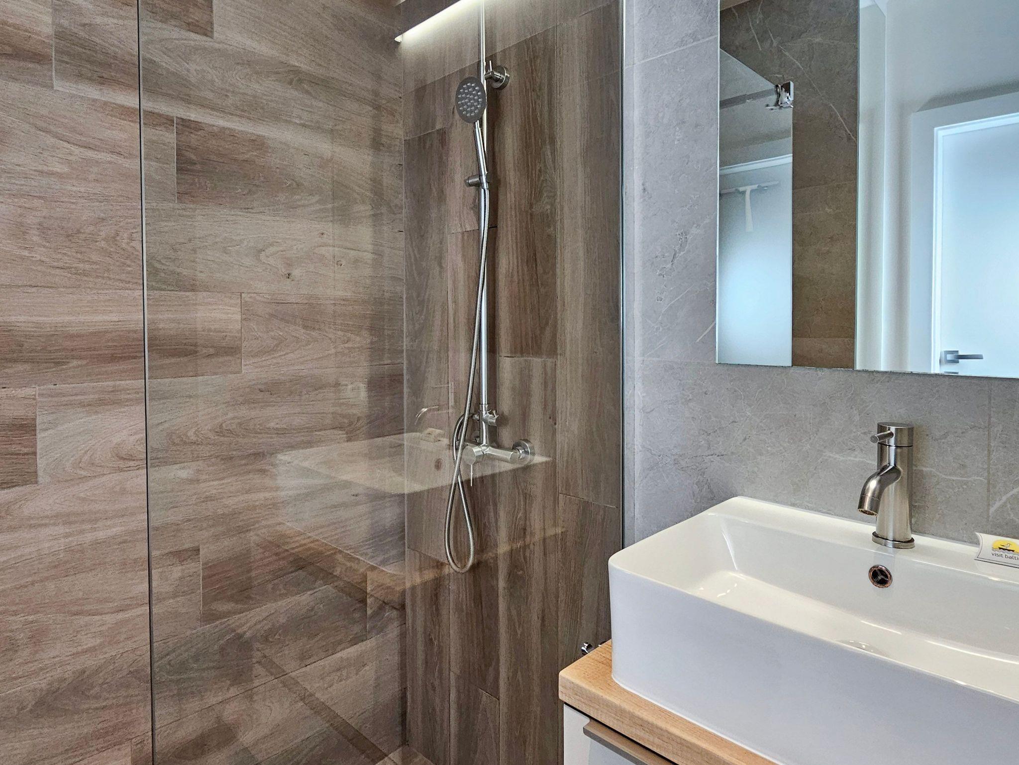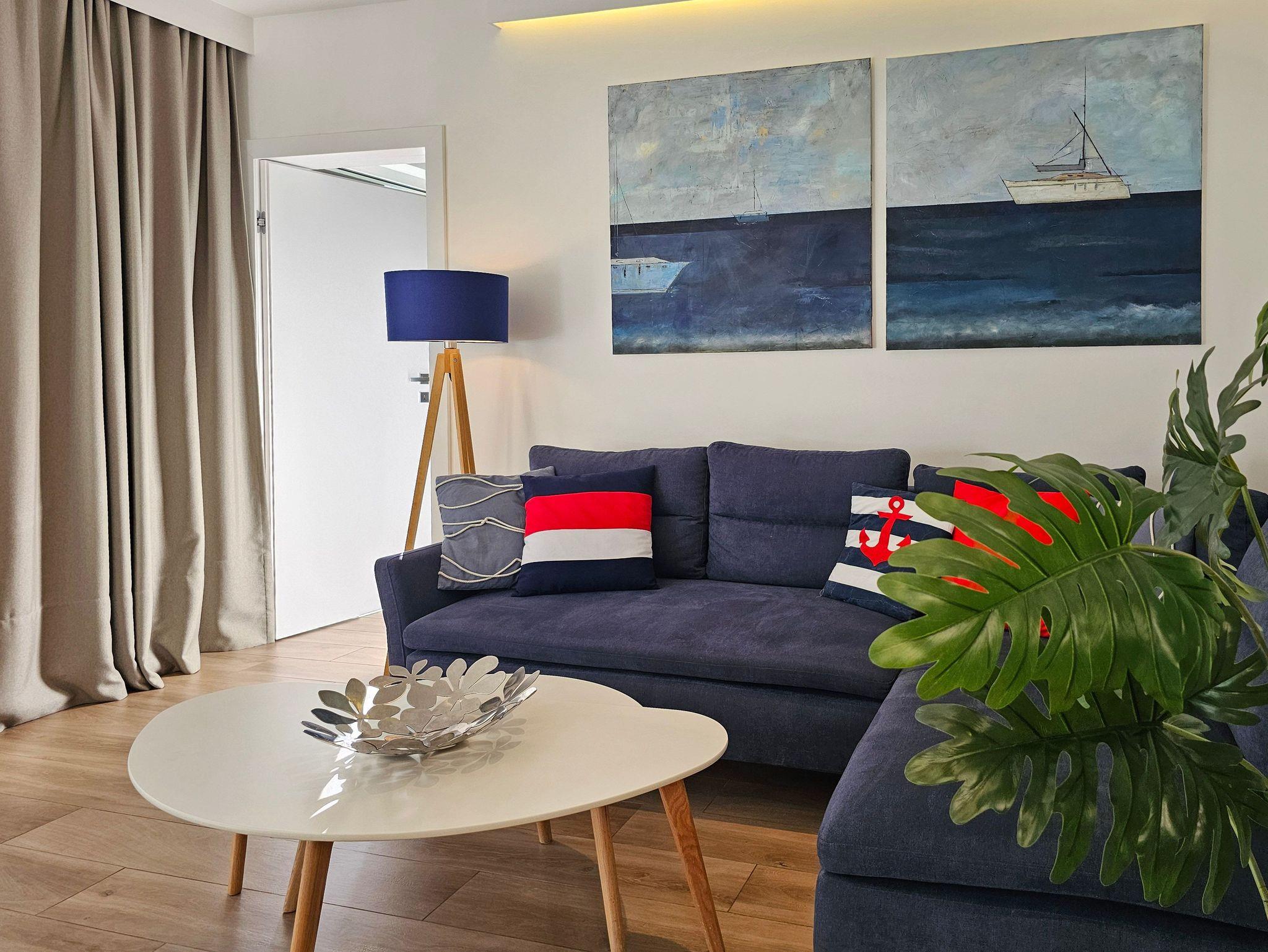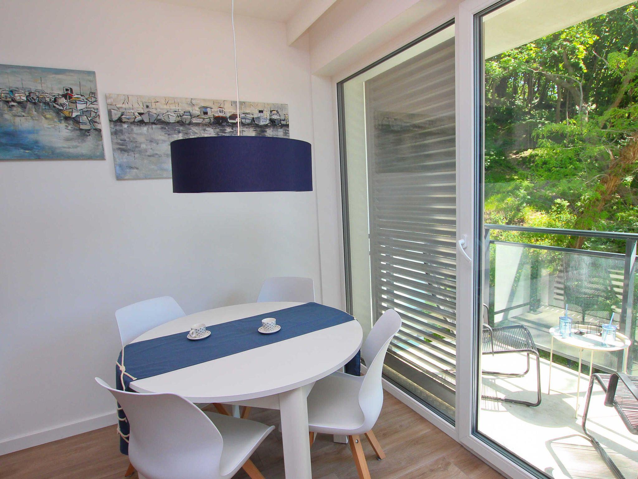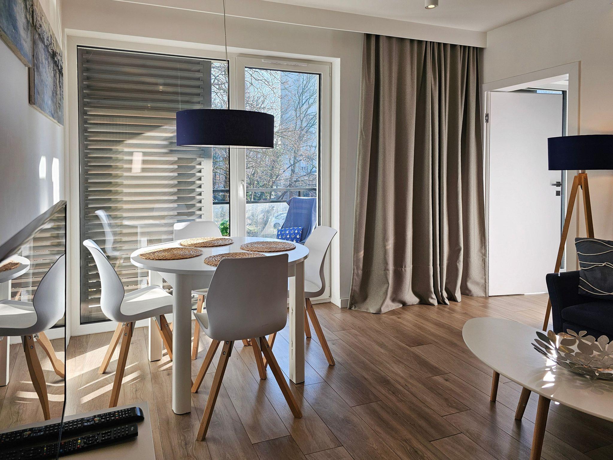 Ein Schlafzimmer mit einem Doppelbett (160 x 200 cm), einer Kommode und einem Balkon, ein Wohnzimmer mit einem Tisch und 4 Stühlen, einer Sitzecke mit ausklappbarer Hornhaut. Eine Küchenzeile mit Einbaumöbeln ist mit allem ausgestattet, was Sie zum Zubereiten und Essen von Mahlzeiten benötigen, einem Wasserkocher, einer Überlauf-Kaffeemaschine, einem Toaster, einem Elektroherd mit 4 Kochstellen, einer Mikrowelle, einem Geschirrspüler und einem Kühlschrank. Badezimmer mit niederschwelliger Duschkabine.
