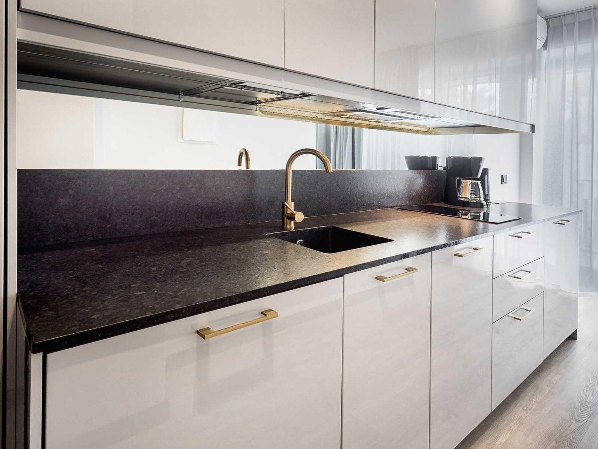 Die Küche ist mit notwendigen Geschirr und Besteck für die Zubereitung und den Verzehr von Mahlzeiten ausgestattet, ebenfalls mit einem Induktionsherd mit zwei Heizflächen, Geschirrspüler, einer Filterkaffeemaschine und einem Toaster.