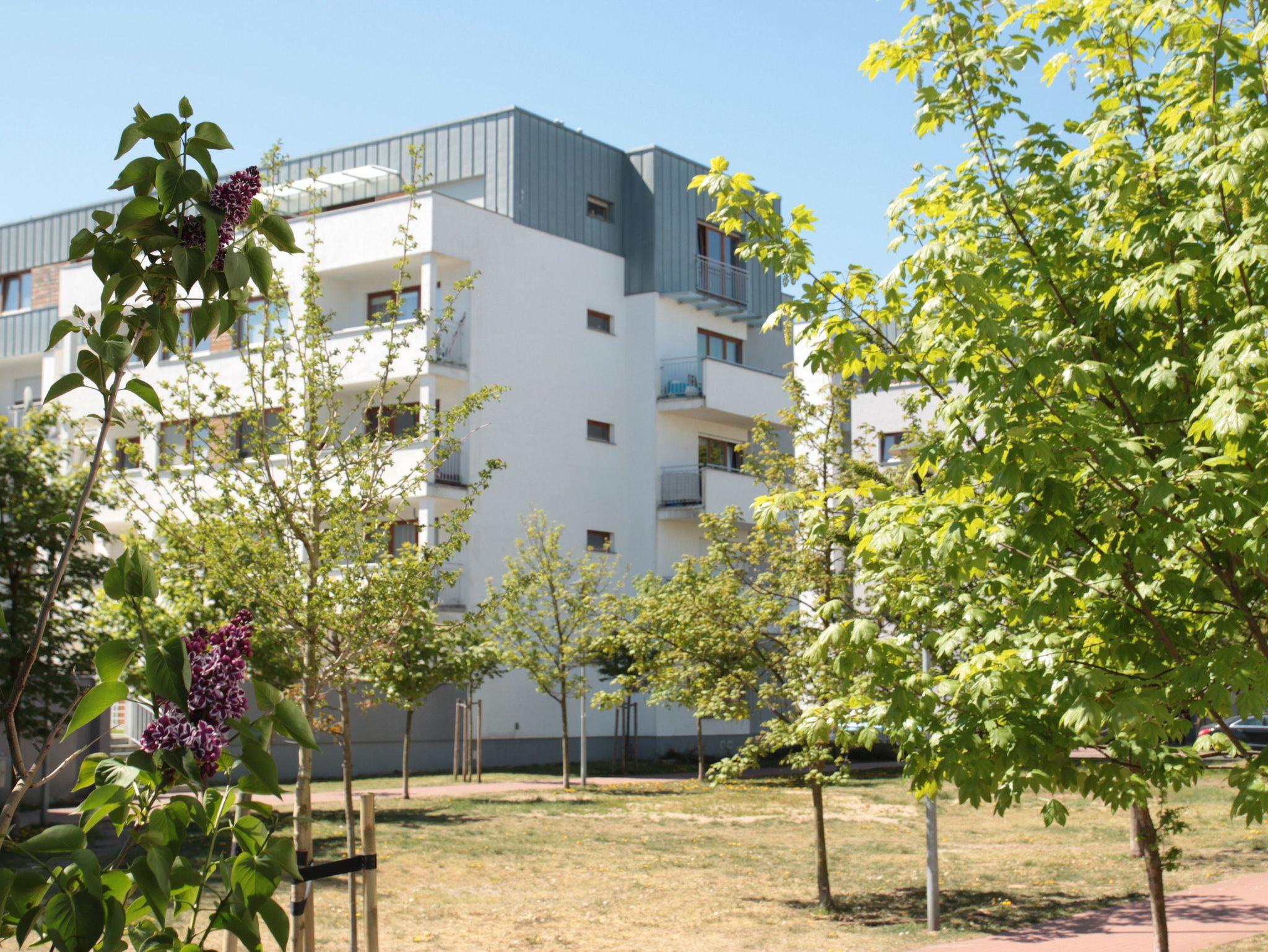 Die Fenster des Schlafzimmers und der Küche blicken auf die Westseite, die Siedlungsstraße.
