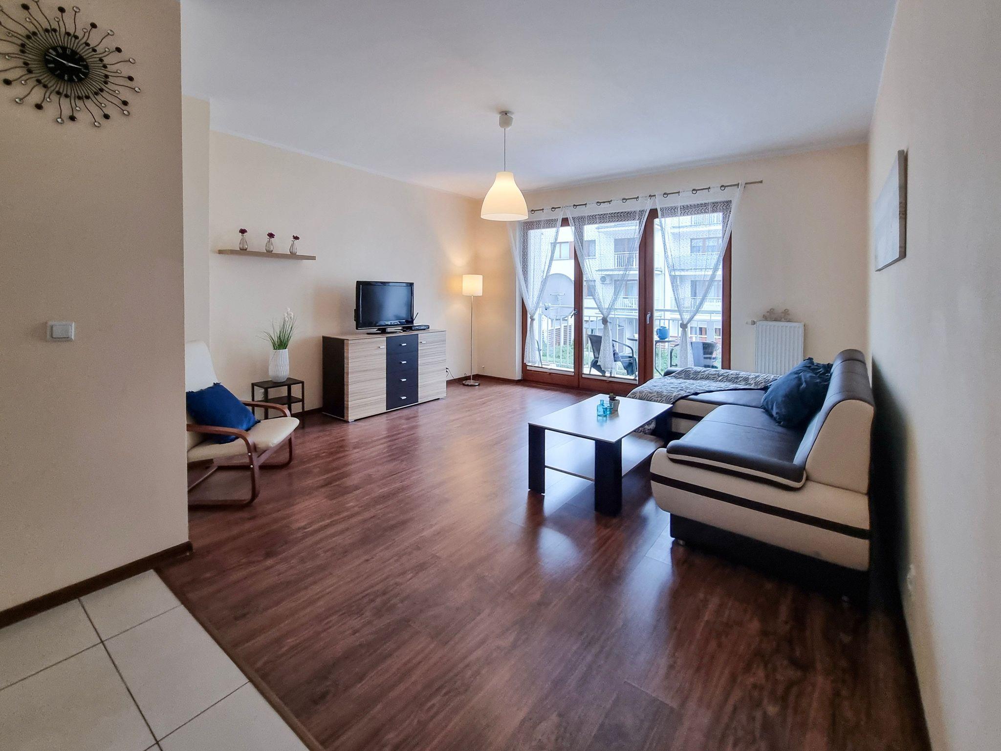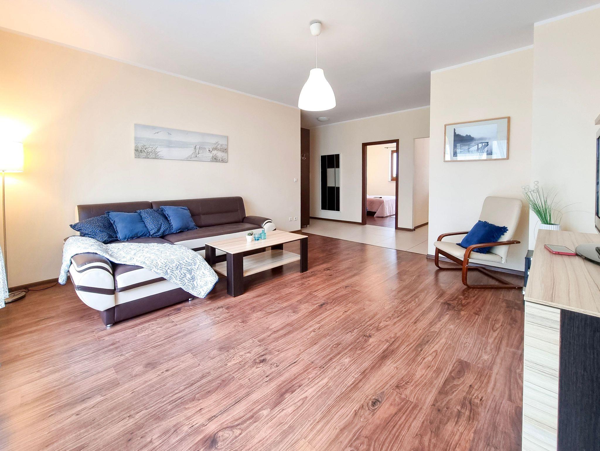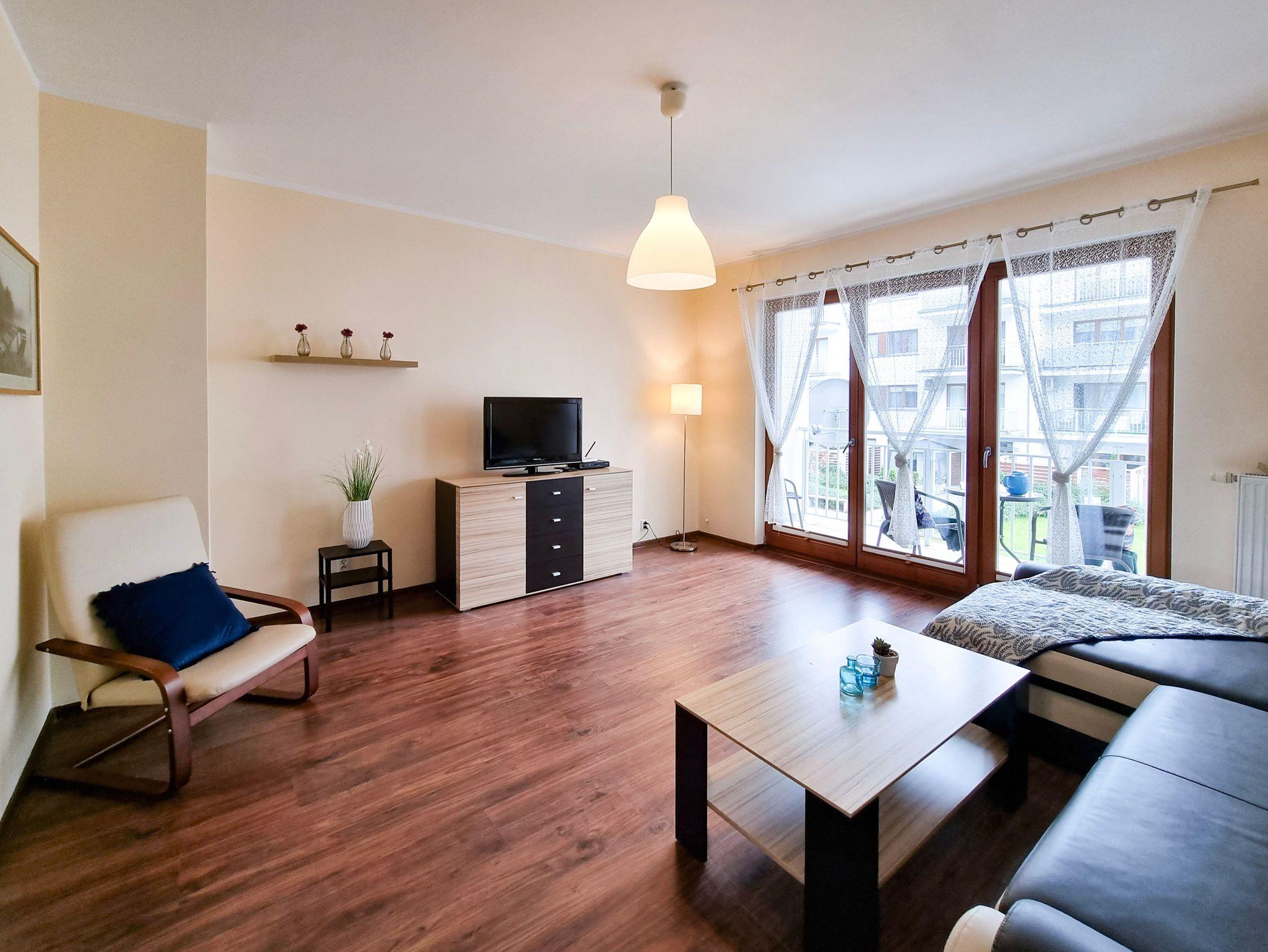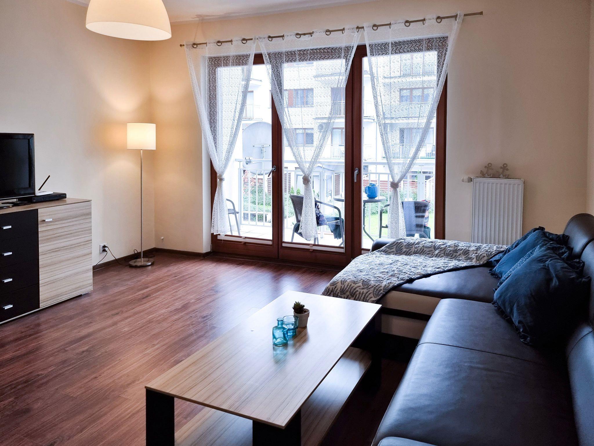 Das Wohnzimmer mit Balkon ist mit einem Schlafsofa, einem Couchtisch und zwei Sesseln ausgestattet. Ein Fernseher mit Zugang zu den Kabelfernsehprogrammen von Vectra. Das Wohnzimmer öffnet sich auf einen nach Osten ausgerichteten Balkon mit Blick auf den grünen Innenhof.