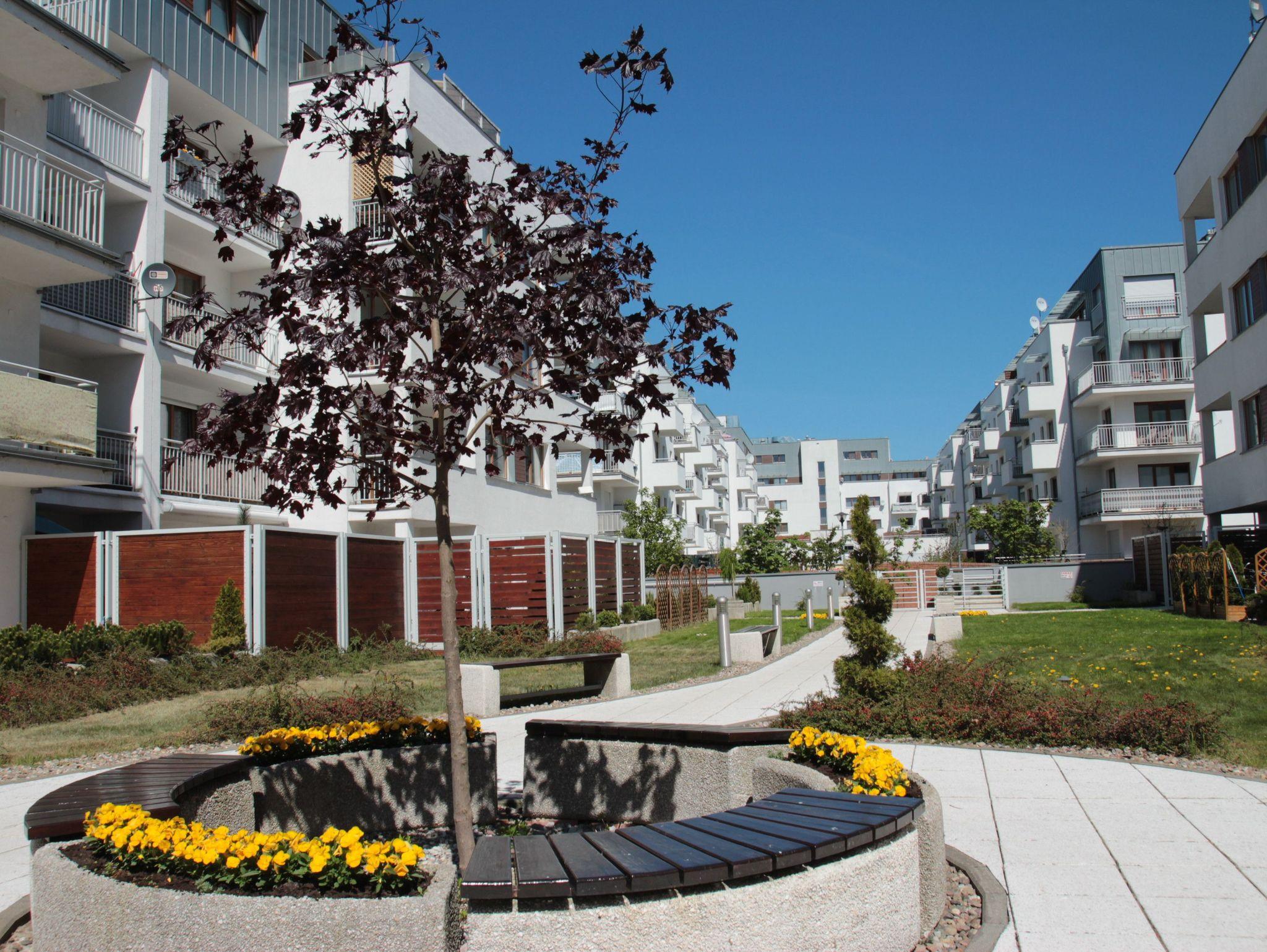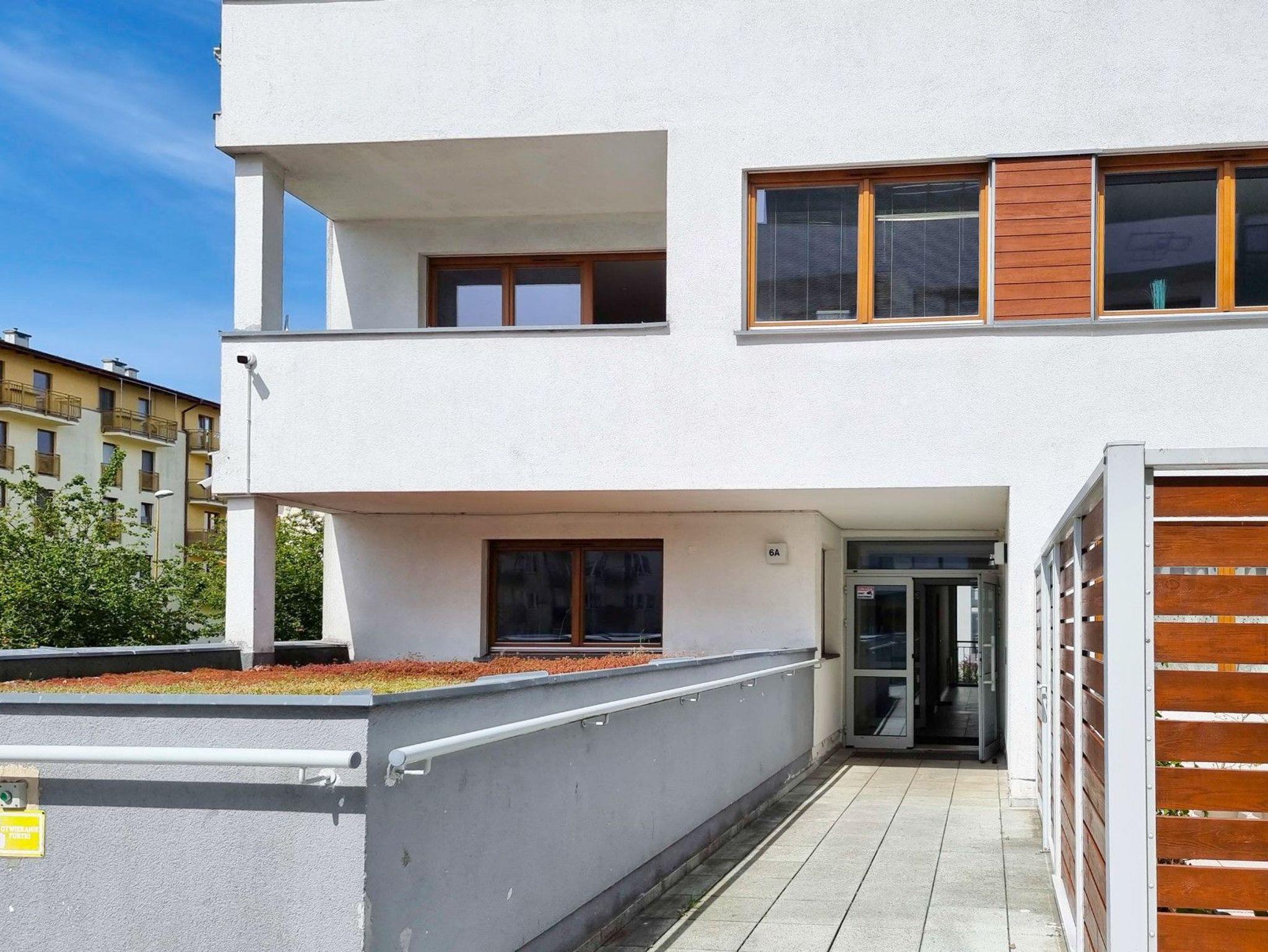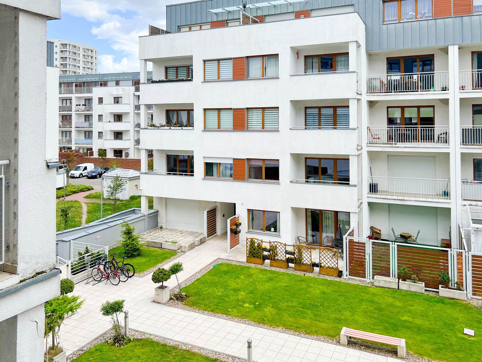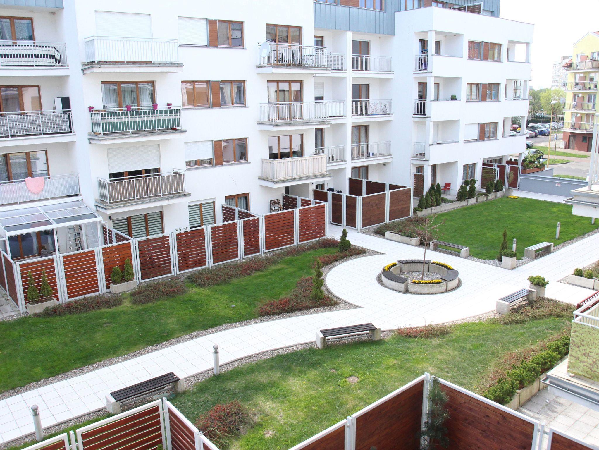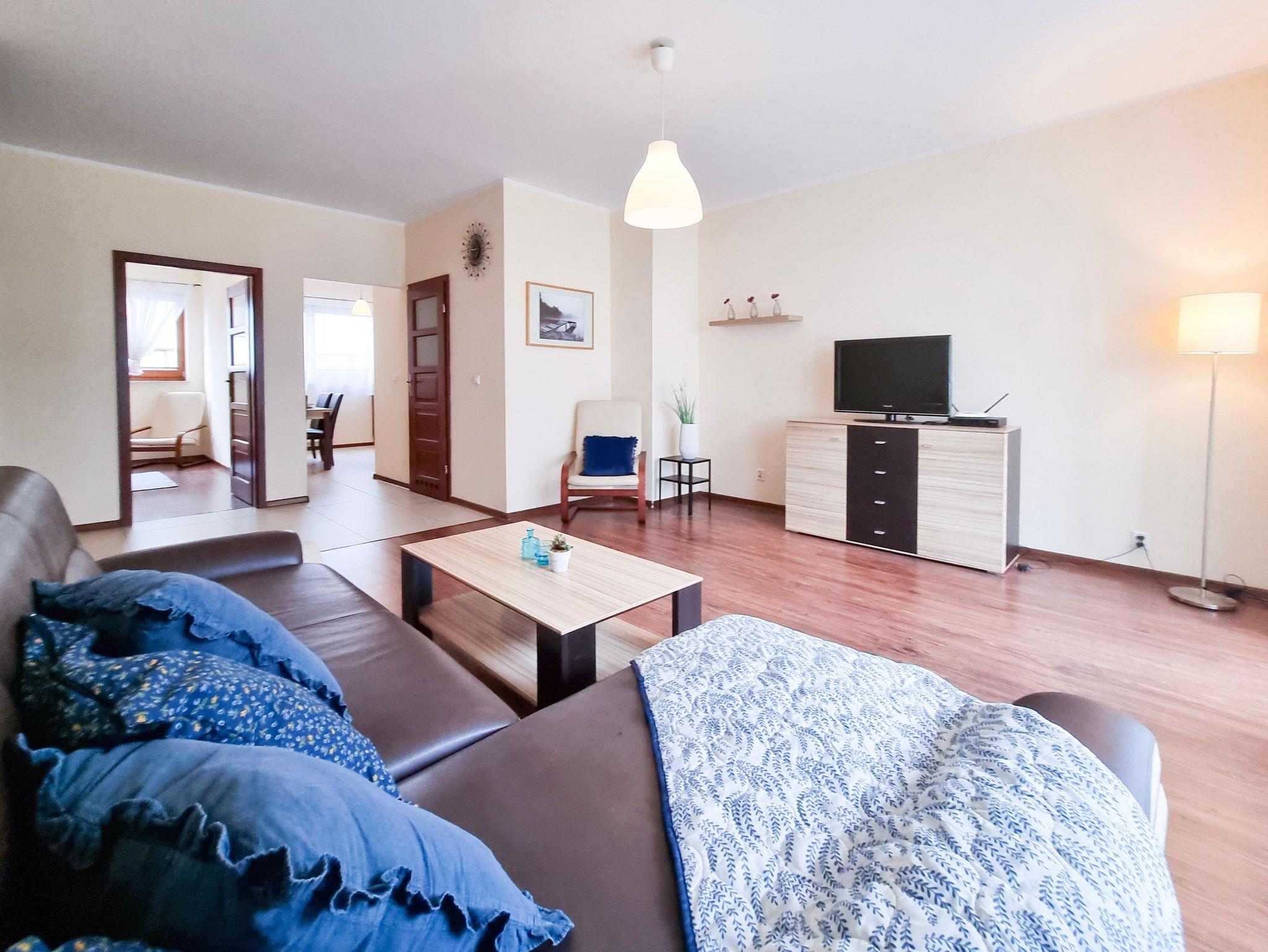 Das Wohnzimmer mit Balkon ist mit einem Schlafsofa, einem Couchtisch und zwei Sesseln ausgestattet. Ein Fernseher mit Zugang zu den Kabelfernsehprogrammen von Vectra. Das Wohnzimmer öffnet sich auf einen nach Osten ausgerichteten Balkon mit Blick auf den grünen Innenhof.