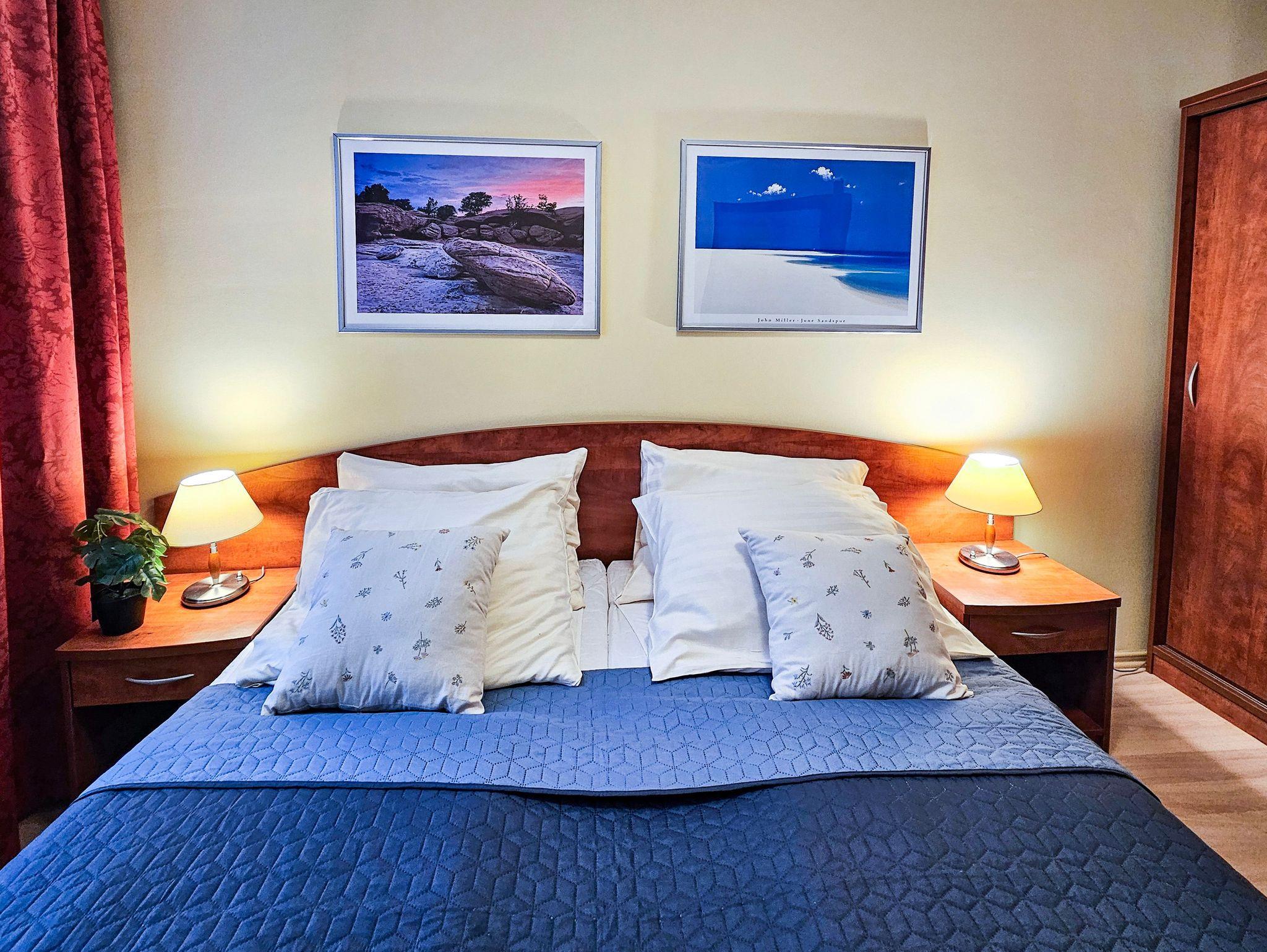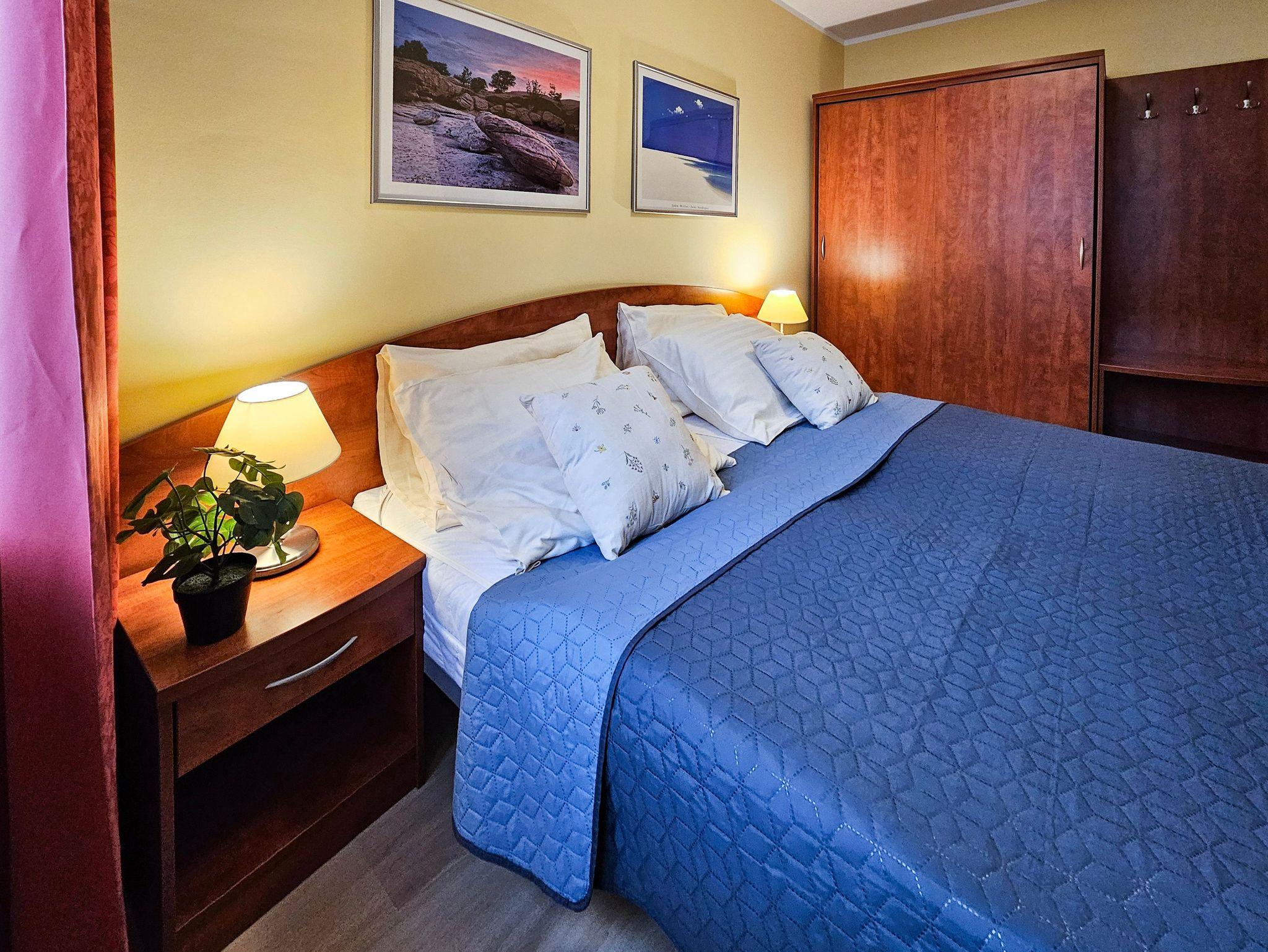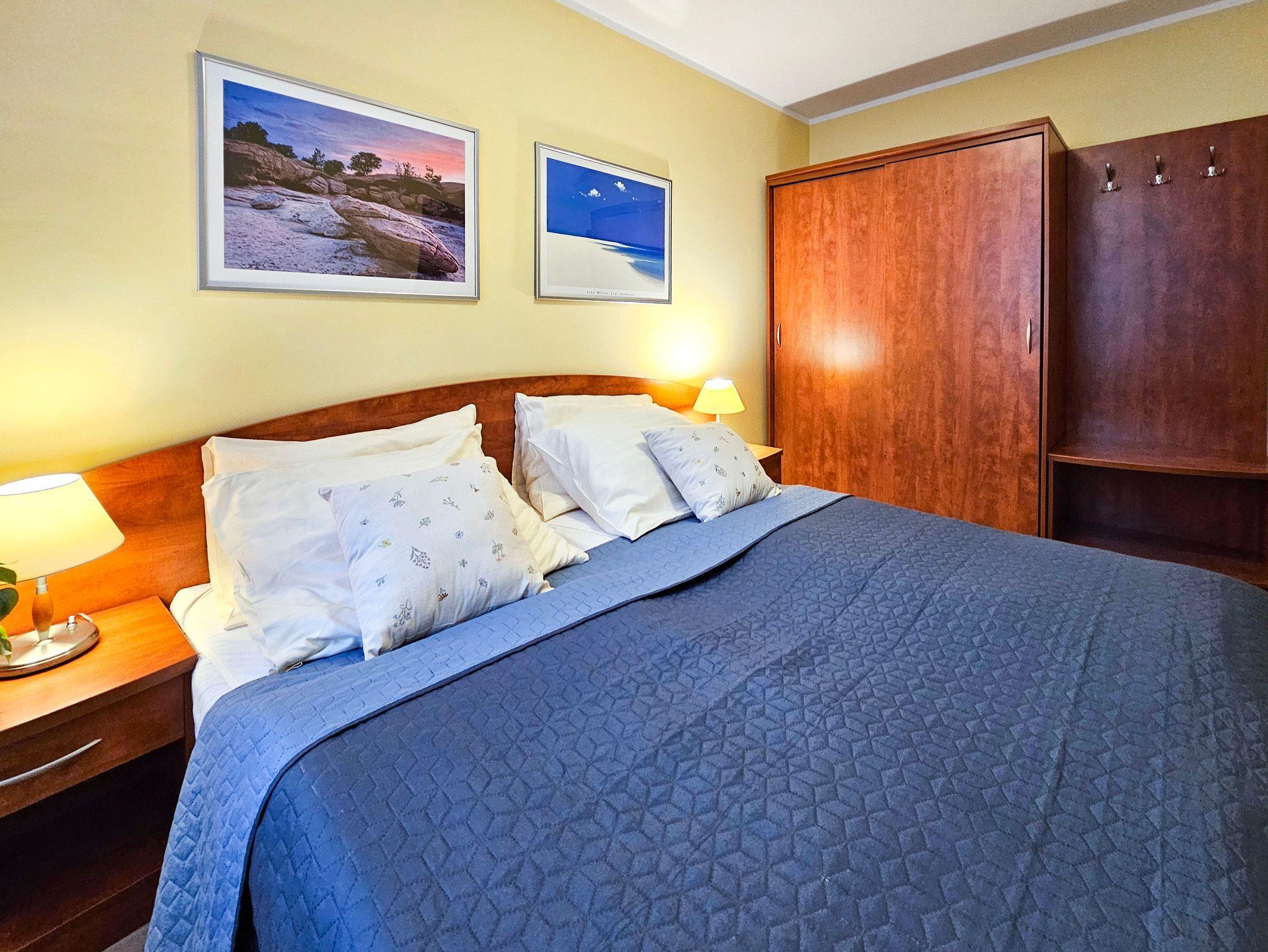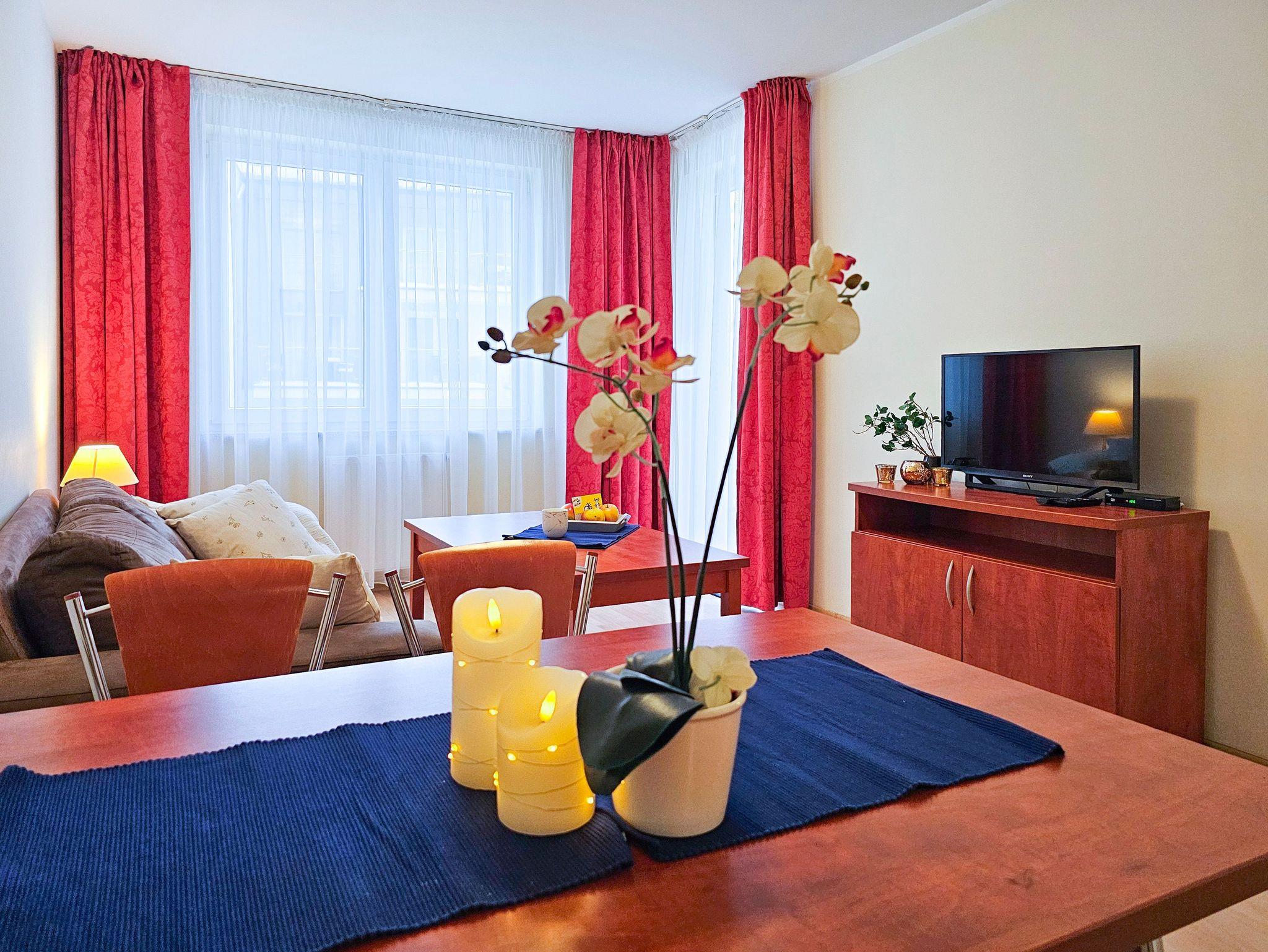 Schlafzimmer mit einem Doppelbett (160x200cm), Nachttischen, einem Kleiderschrank. Wohnzimmer mit Balkon und einem Tisch mit vier Stühlen. Die Wohnung hat der Balkon. Die Fenster und Balkon nach Nord ausgerichtet sind. Badezimmer mit Dusche, WC und Waschbecken.