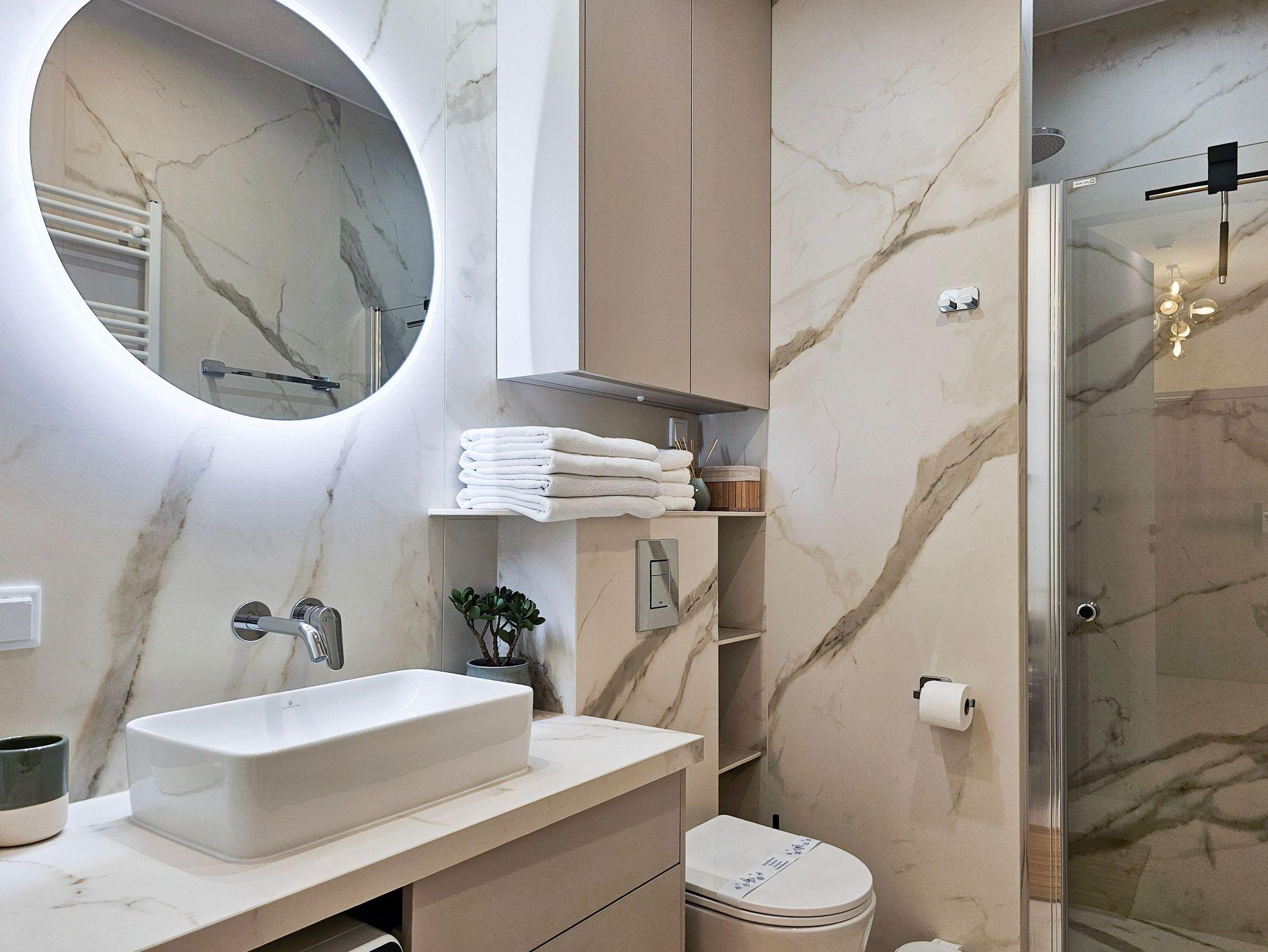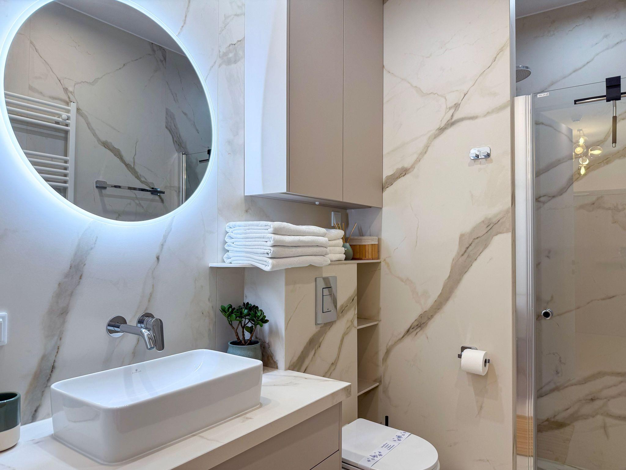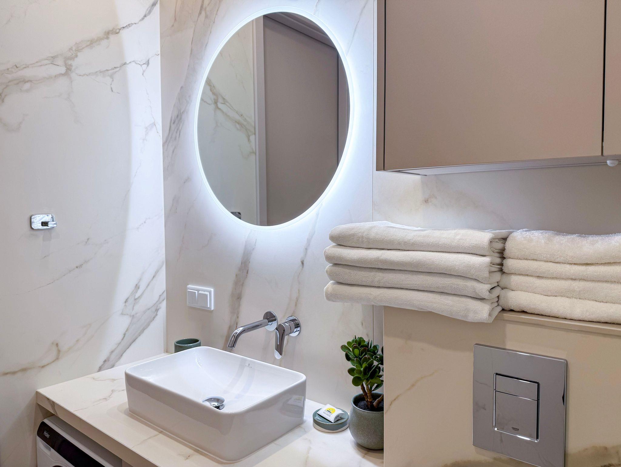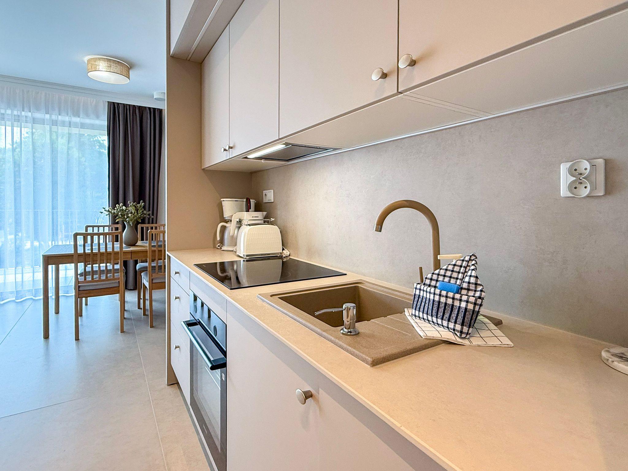 Eine komfortable, gut ausgestattete und moderne Ferienwohnung im Greeneri Park Komplex. Die Wohnung befindet sich im 1. Stock eines Gebäudes mit Aufzug. Sie besteht aus einem Wohnzimmer mit Küchenzeile und einem Schlafzimmer. Das Schlafzimmer ist mit einem Doppelbett (160x200 cm) und einem Kleiderschrank ausgestattet. Das Wohnzimmer verfügt über einen Wohnbereich mit ausklappbarem Sofa, Couchtisch sowie einen Essbereich mit Tisch und Stühlen und eine Küchenzeile. Die Küchenzeile ist mit Geräten zum Zubereiten und Verzehren von Mahlzeiten ausgestattet, darunter eine Spülmaschine, ein Backofen, ein Kühlschrank, ein Wasserkocher, eine Filterkaffeemaschine und ein Toaster. Das Badezimmer verfügt über eine ebenerdige Dusche, ein Waschbecken, ein WC und eine Waschmaschine.