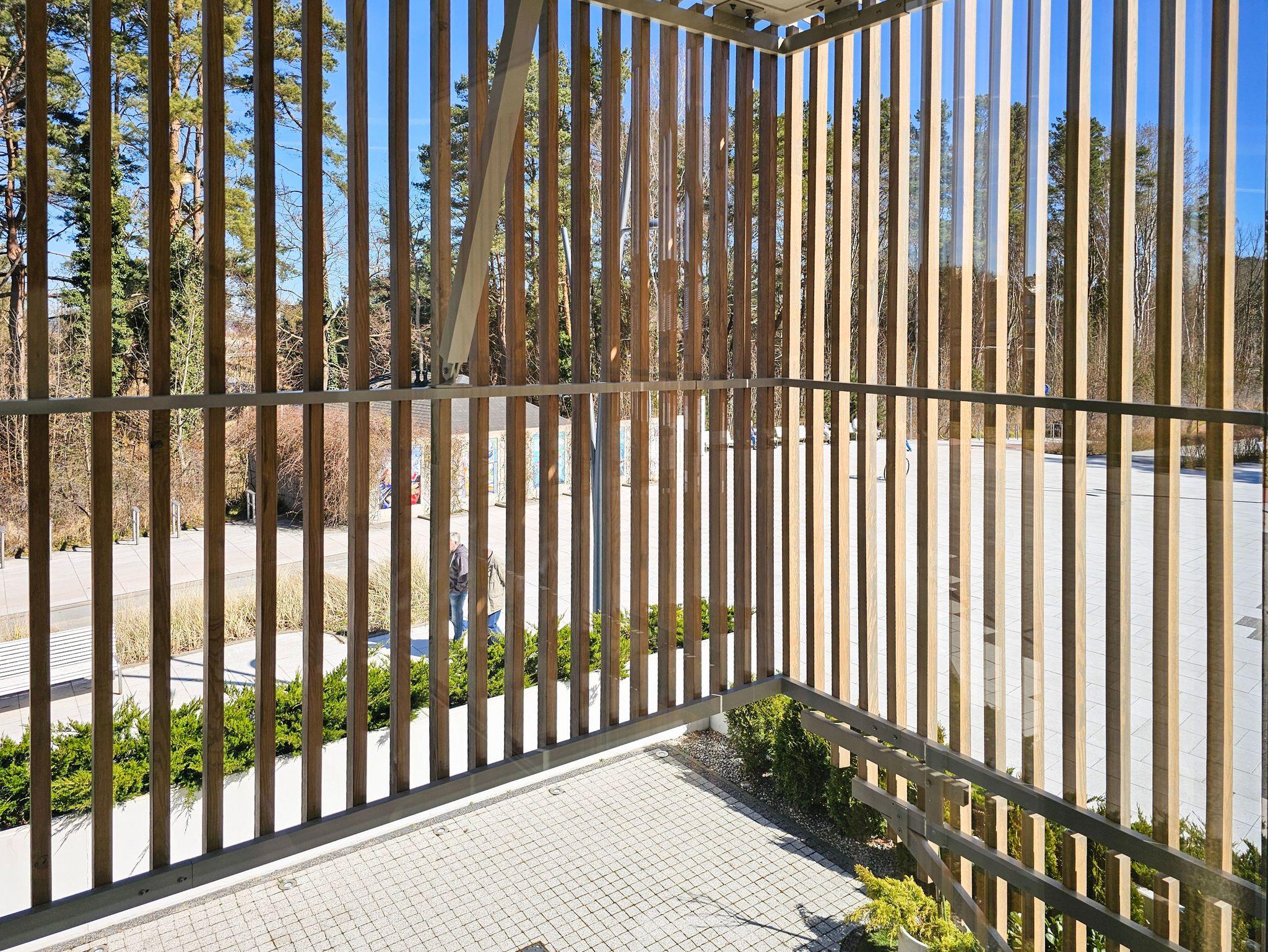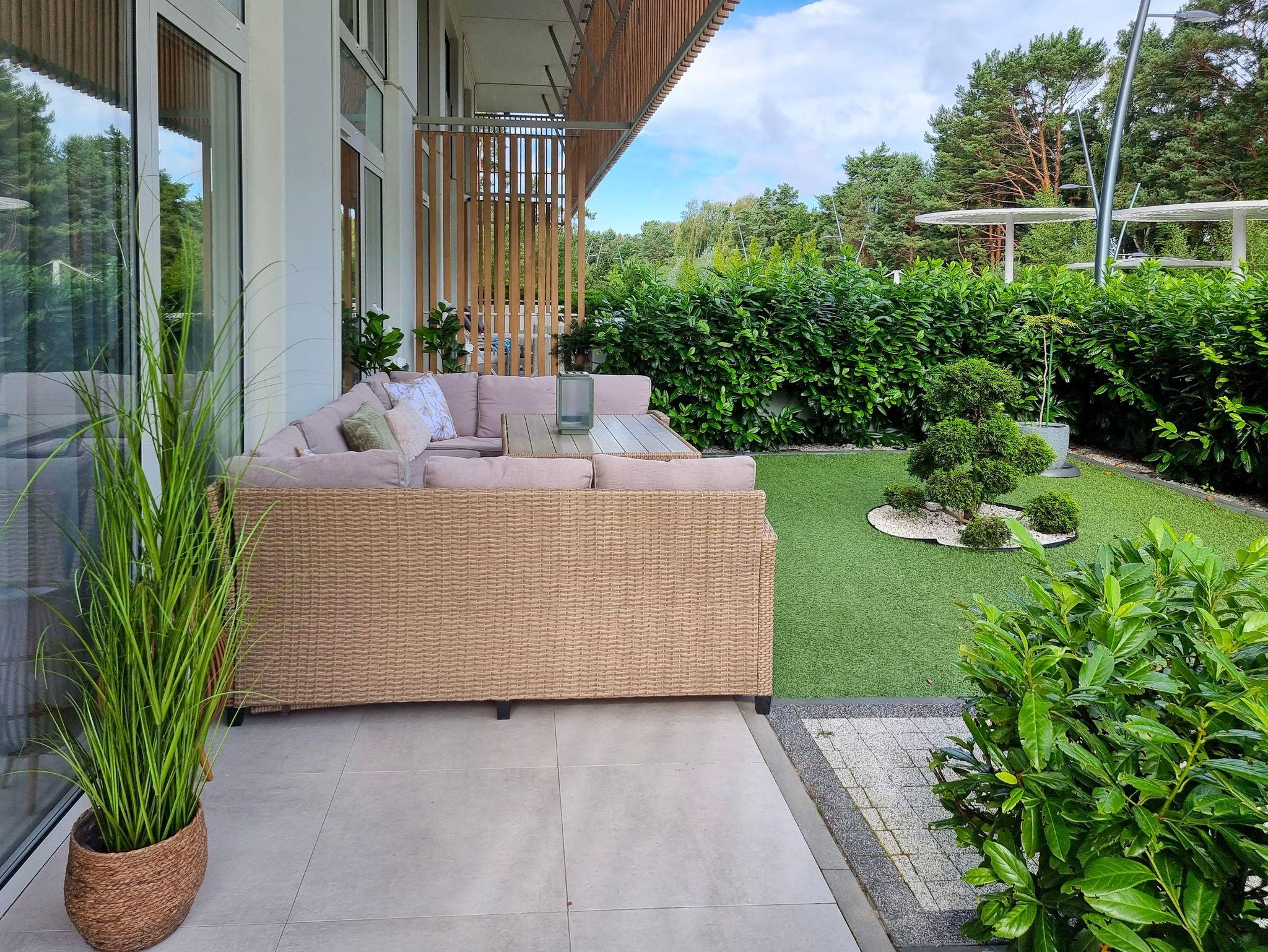 Ausgang zur geräumigen Gartenterrasse mit Blick auf die schöne Kurpromenade mit Gartenmöbeln und Liegestühlen.