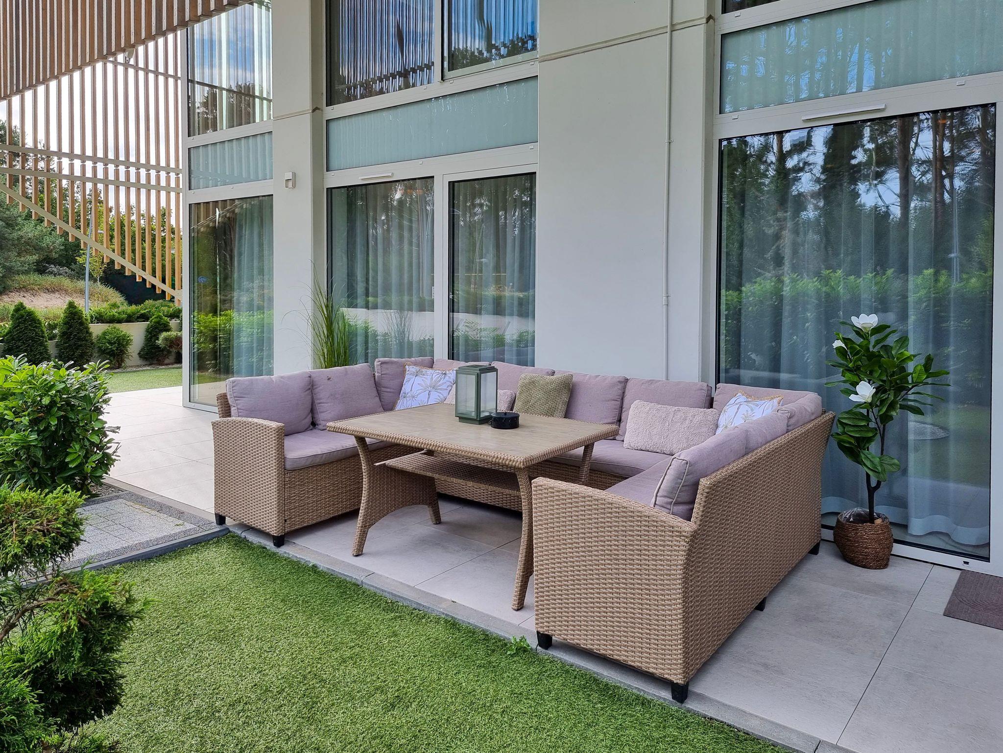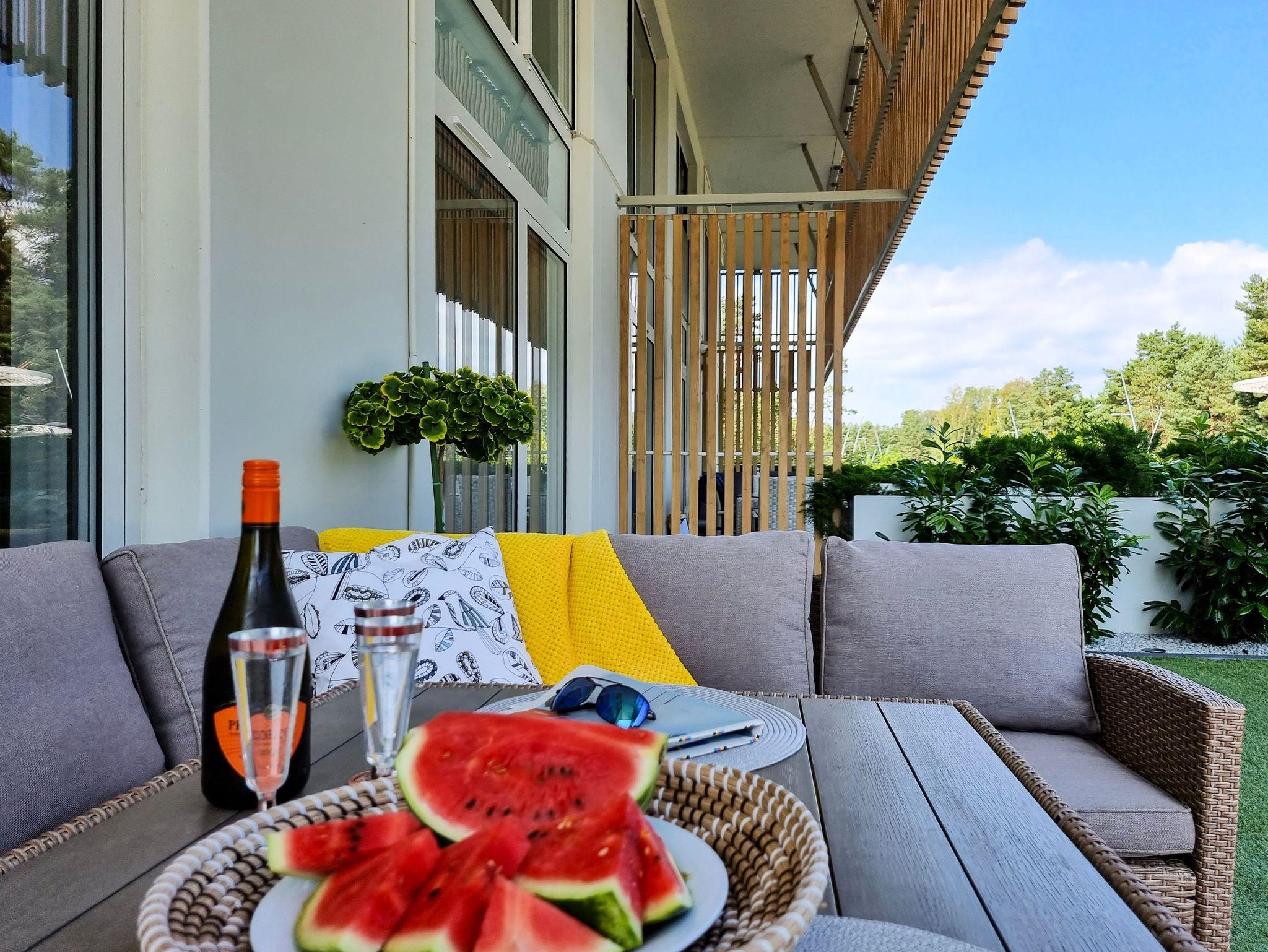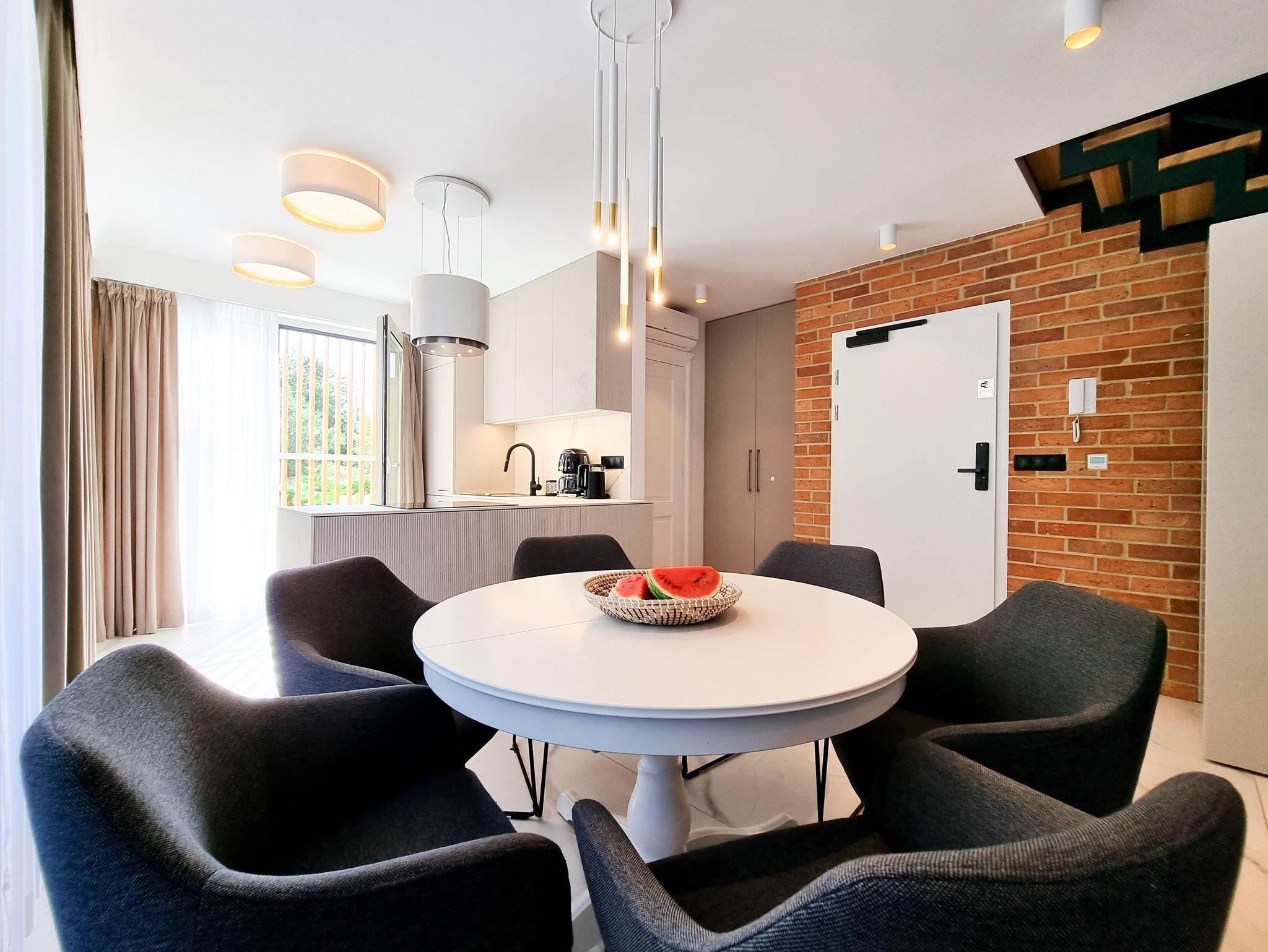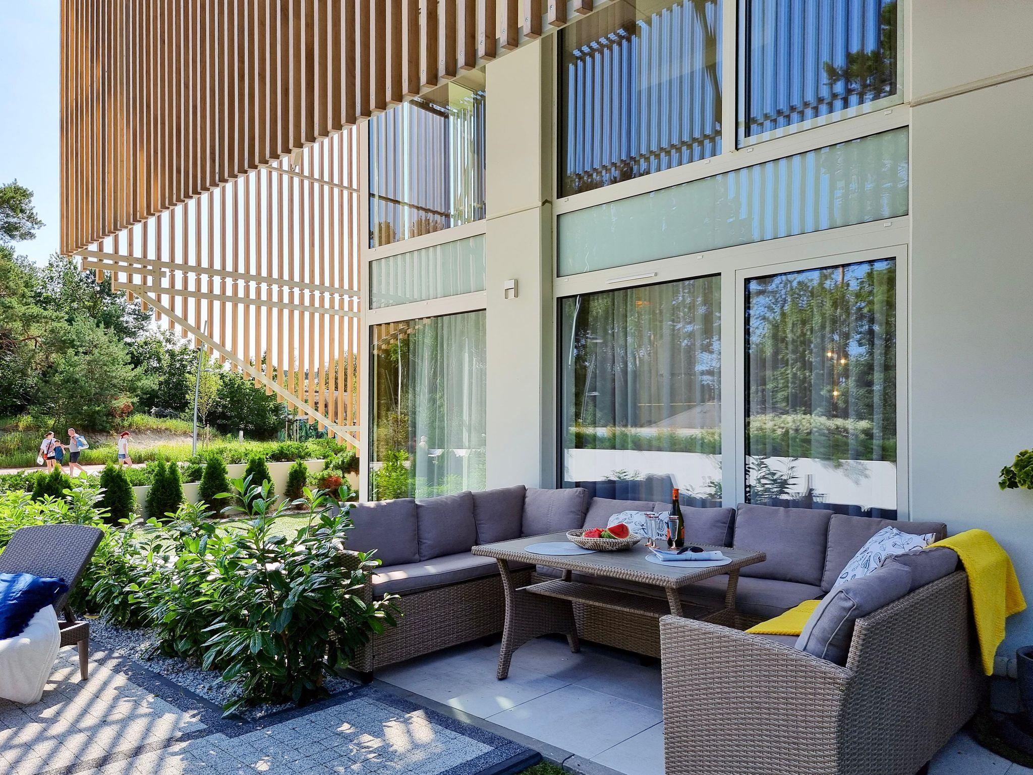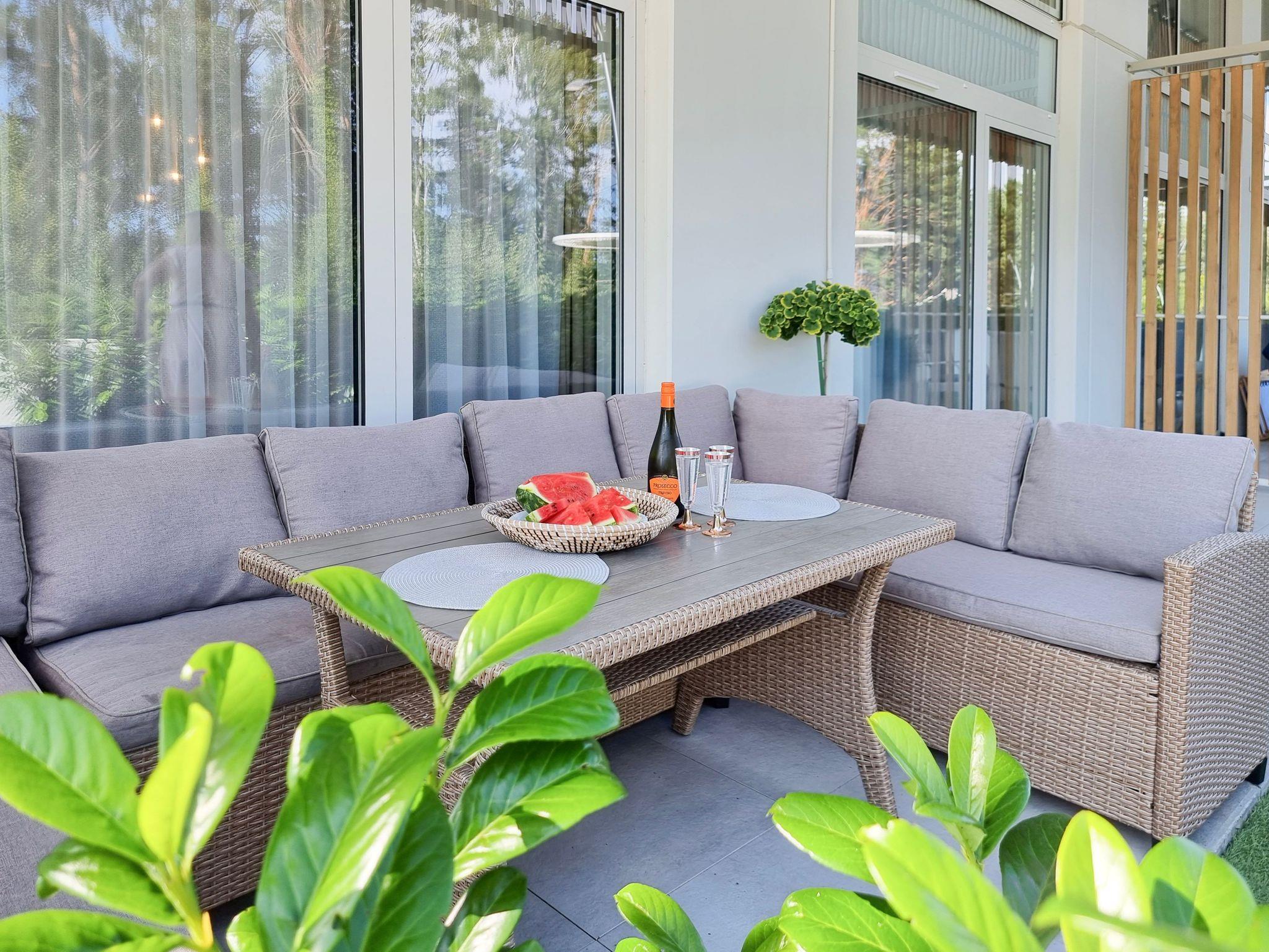 Moderne 2-Ebenen-Wohnung an der Promenade in unmittelbarer Nähe des Strandes. Wohnung mit großer Terrasse, 2 Schlafzimmer, Wohnzimmer mit Kochnische, Toilette im Erdgeschoss und Bad im Erdgeschoss.
