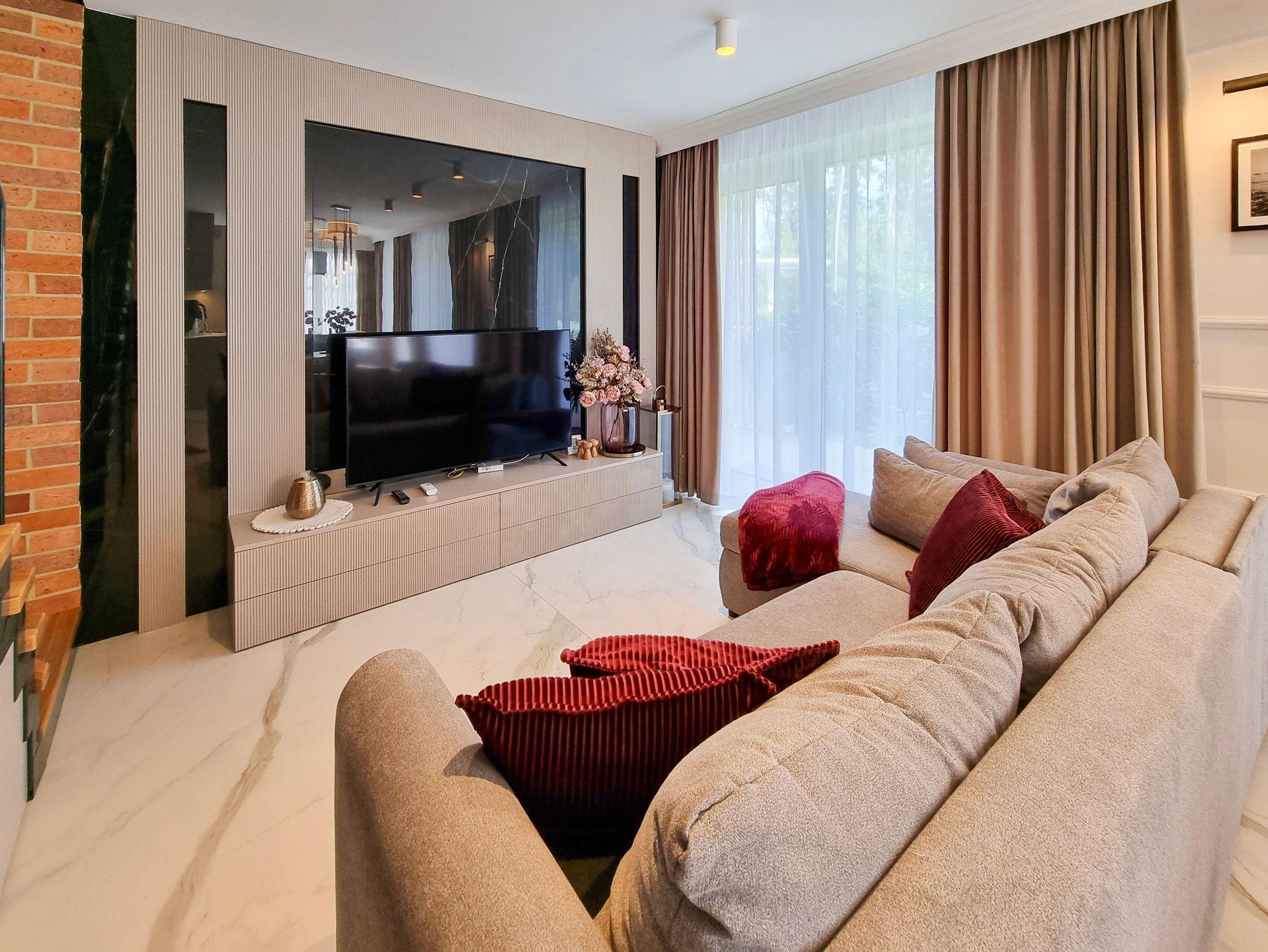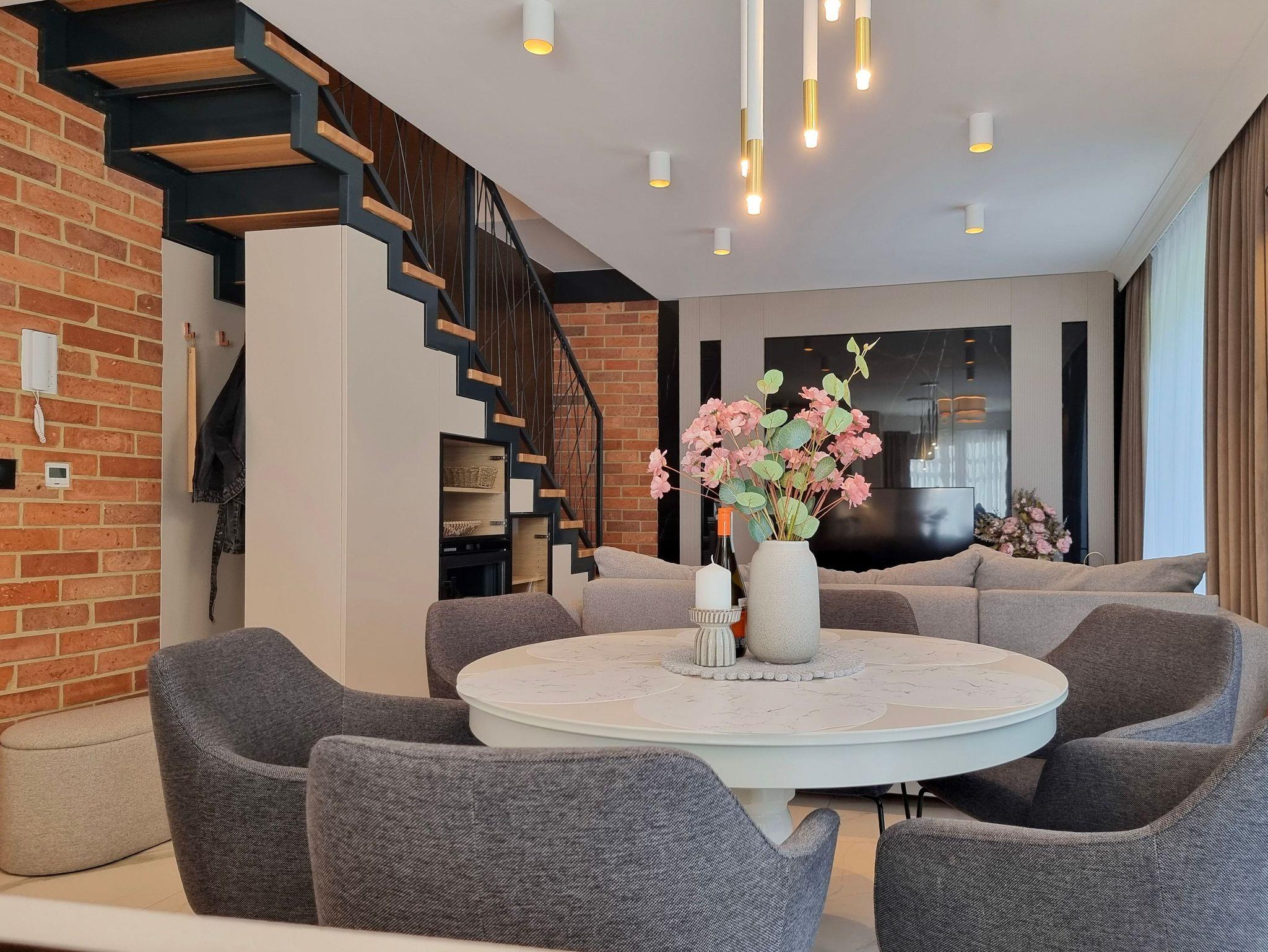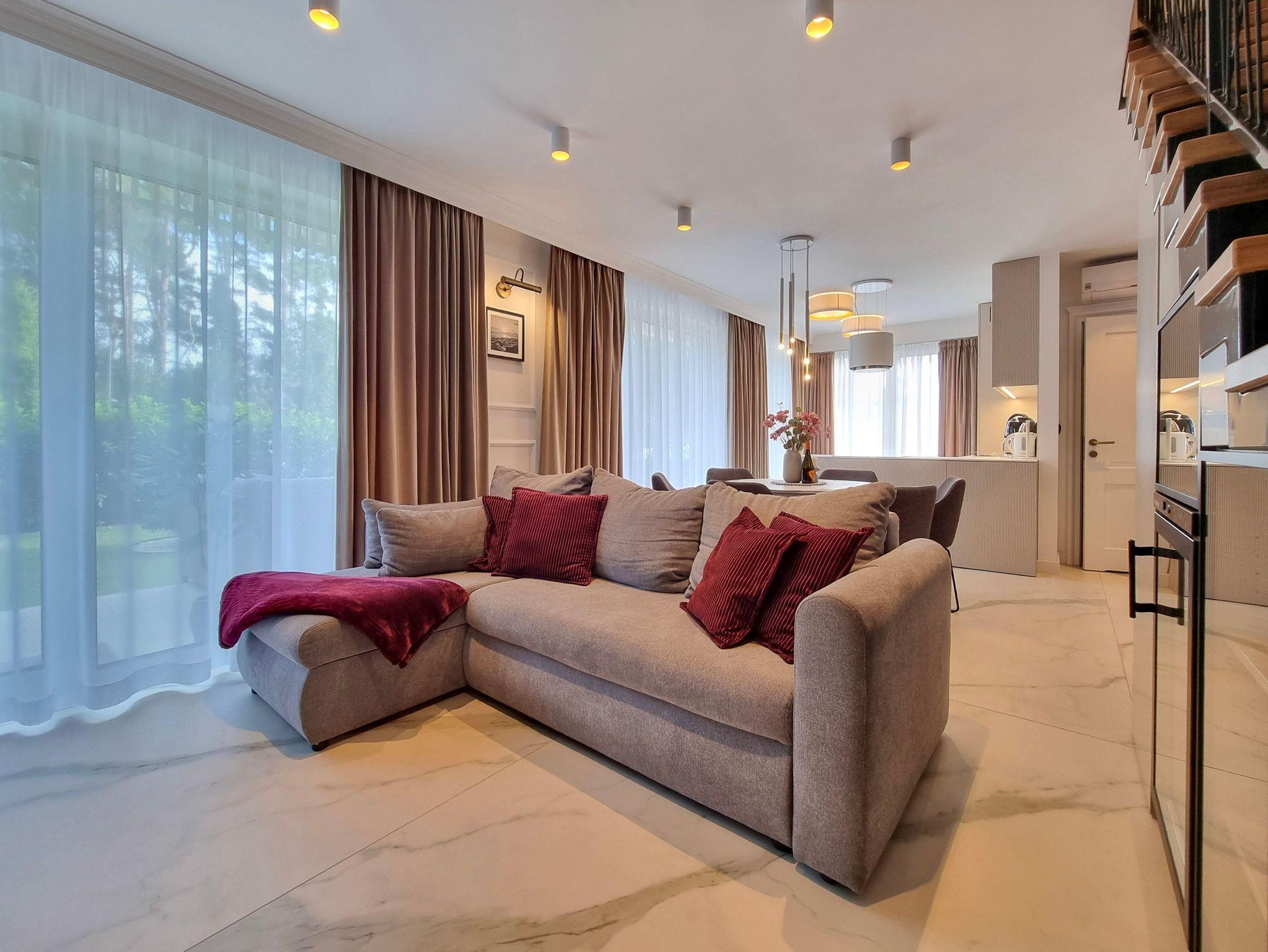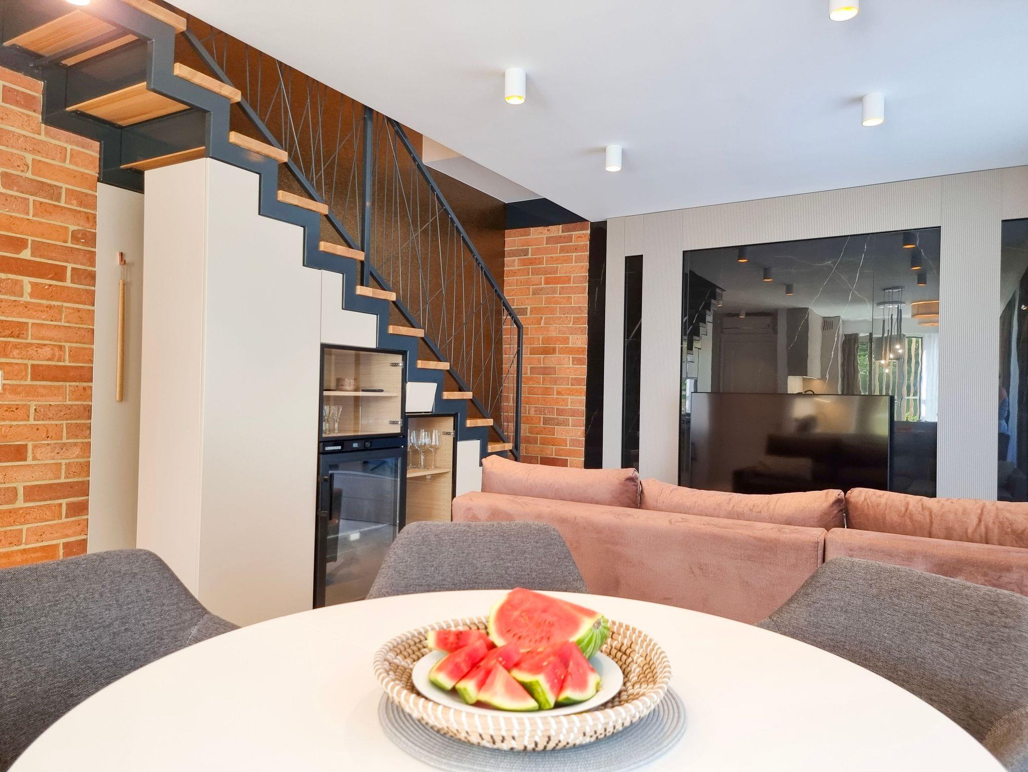Im Erdgeschoss der Wohnung gibt es ein geräumiges Wohnzimmer mit Zugang zur 145m2 Terrasse, eine voll ausgestattete Küchenzeile: 4-Flammen-Herd, Backofen, Mikrowelle, Toaster, Kaffeemaschine. Der Wohnbereich verfügt über ein Schlafsofa und TV.