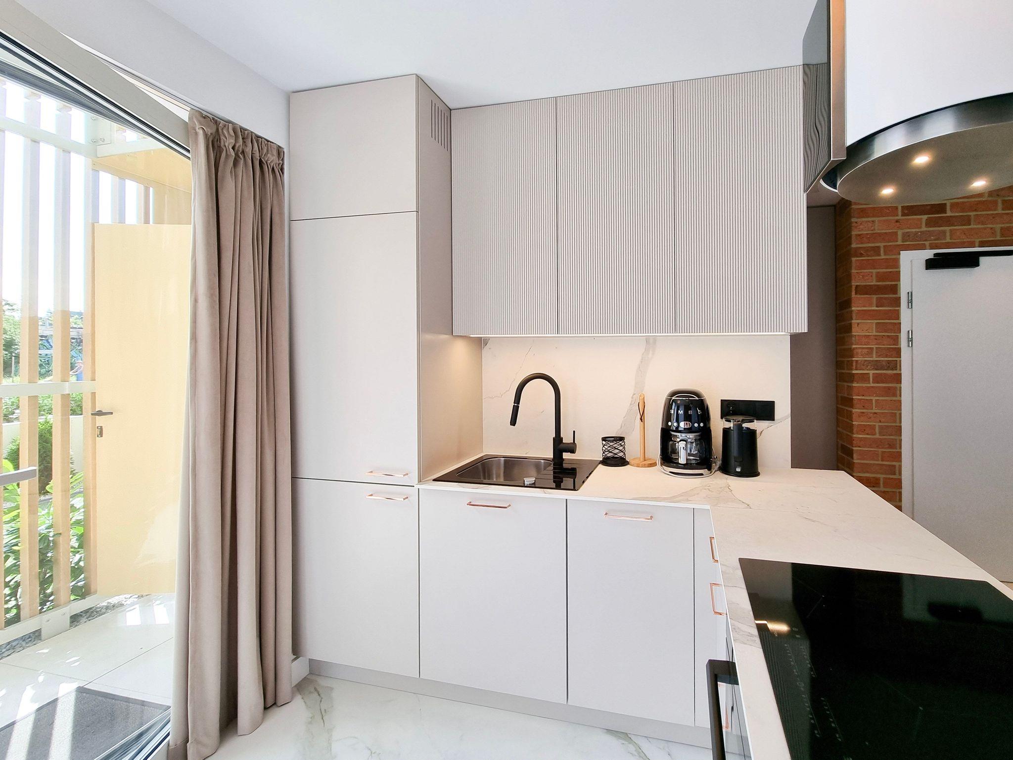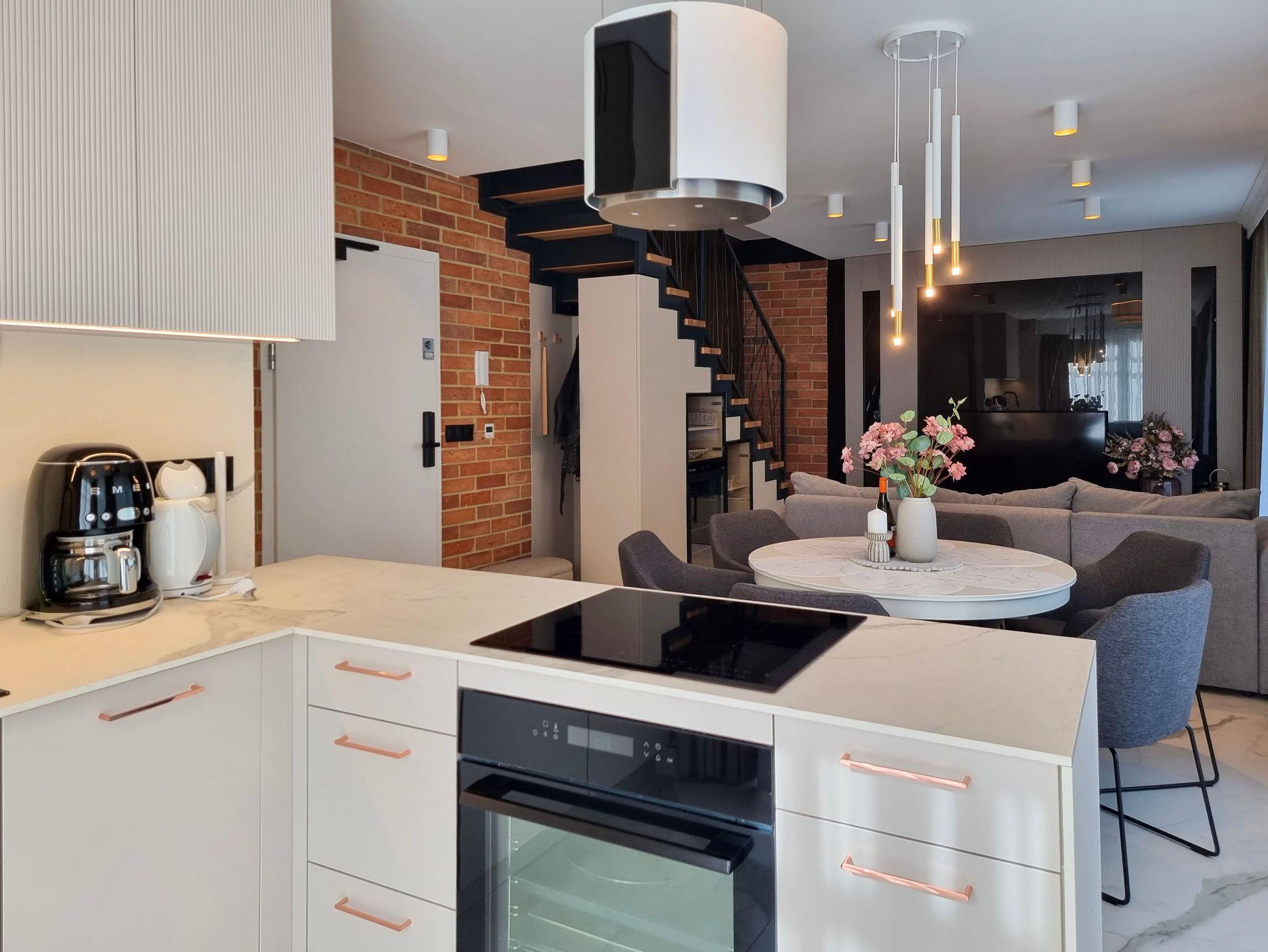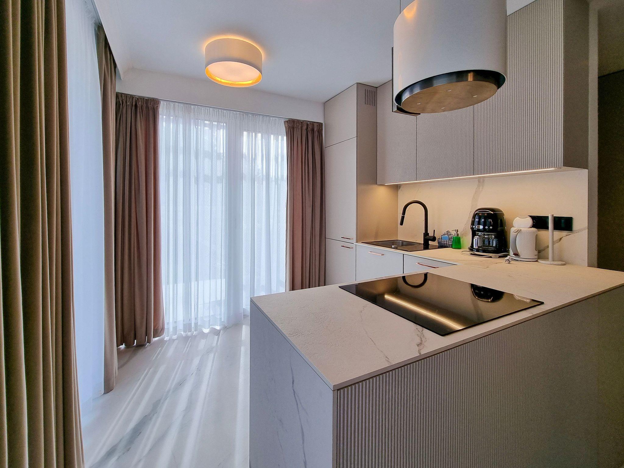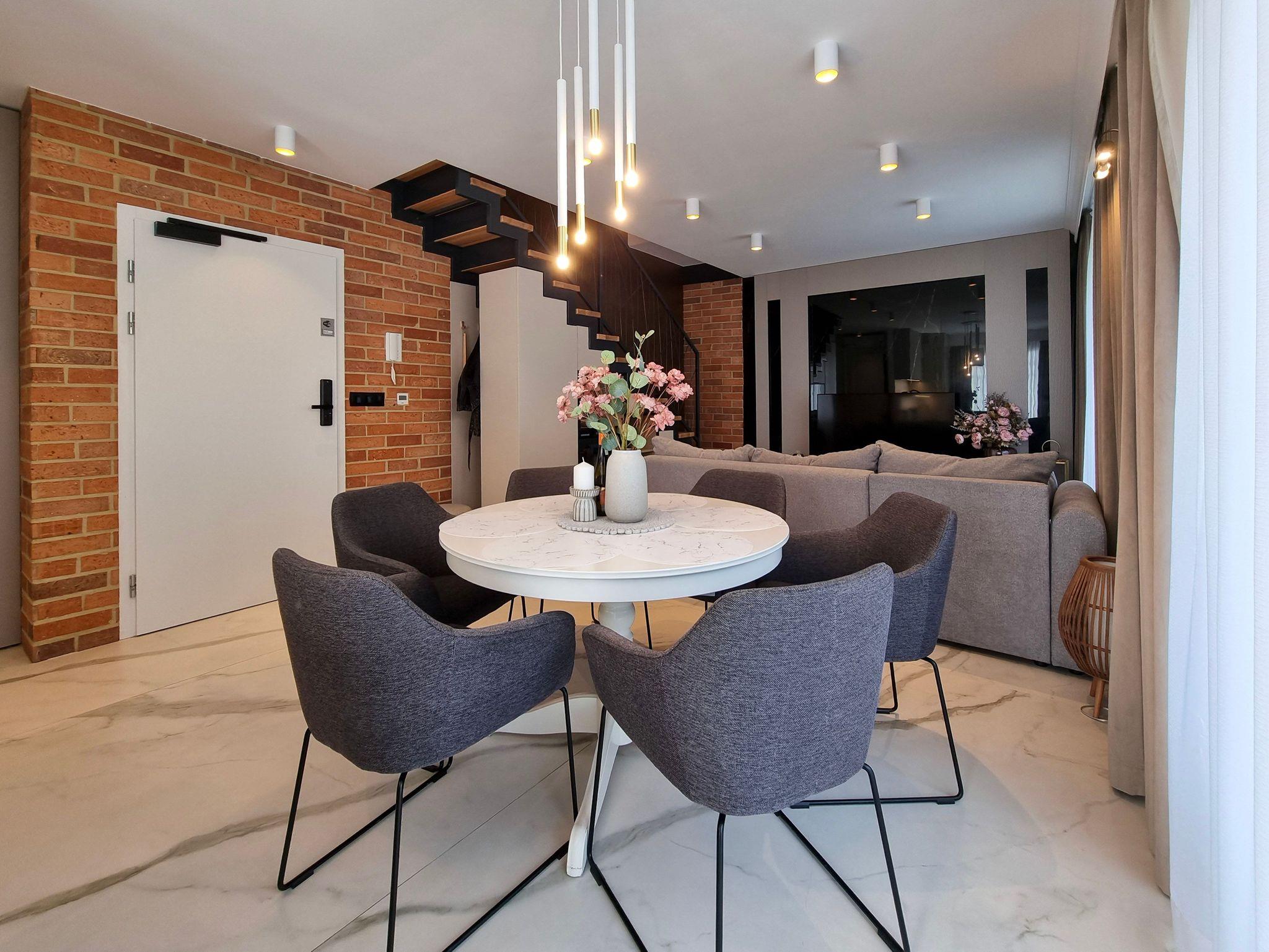 Im Erdgeschoss der Wohnung gibt es ein geräumiges Wohnzimmer mit Zugang zur 145m2 Terrasse, eine voll ausgestattete Küchenzeile: 4-Flammen-Herd, Backofen, Mikrowelle, Toaster, Kaffeemaschine. Der Wohnbereich verfügt über ein Schlafsofa und TV.