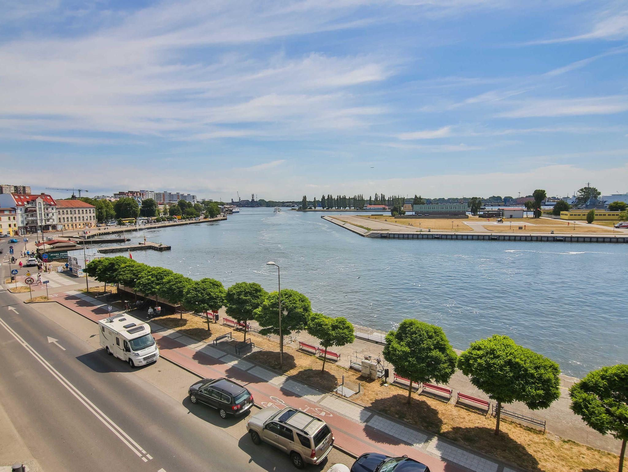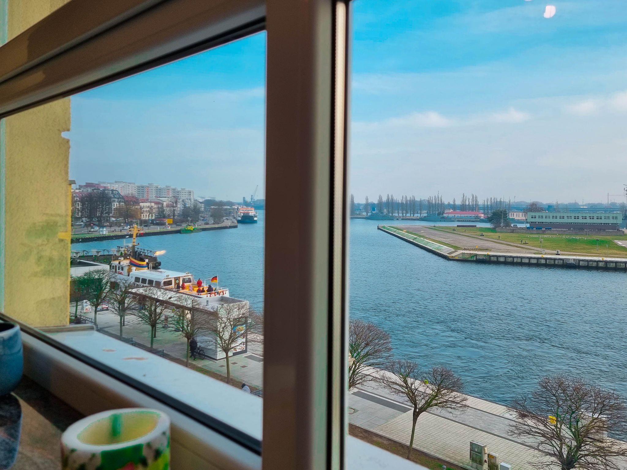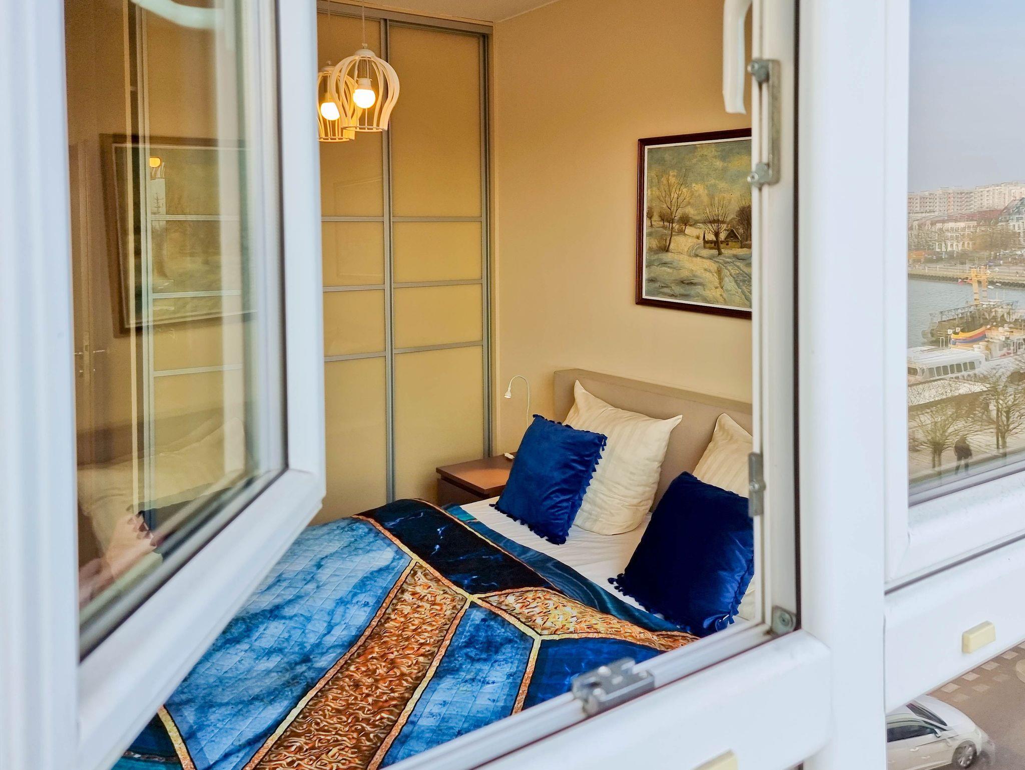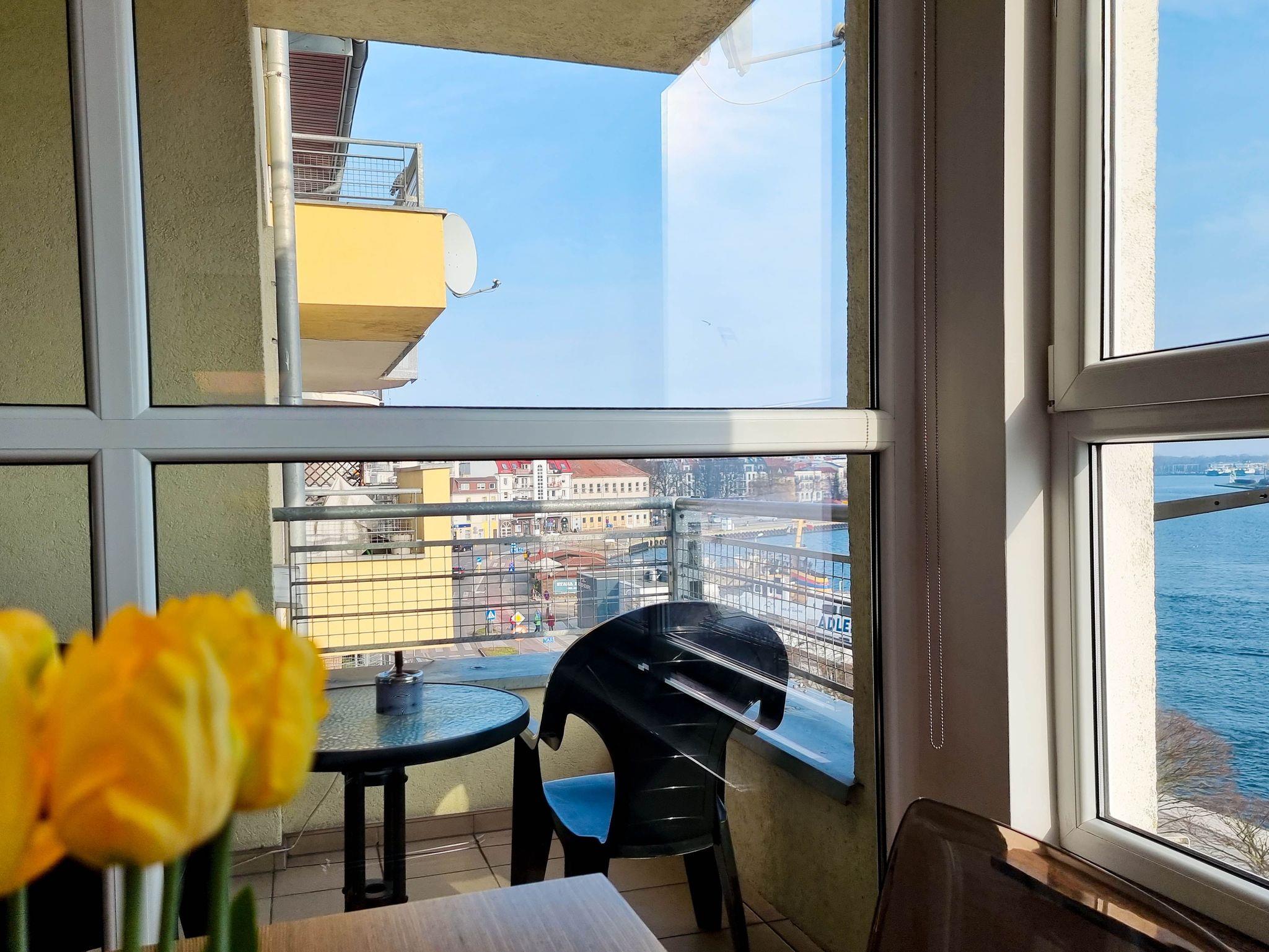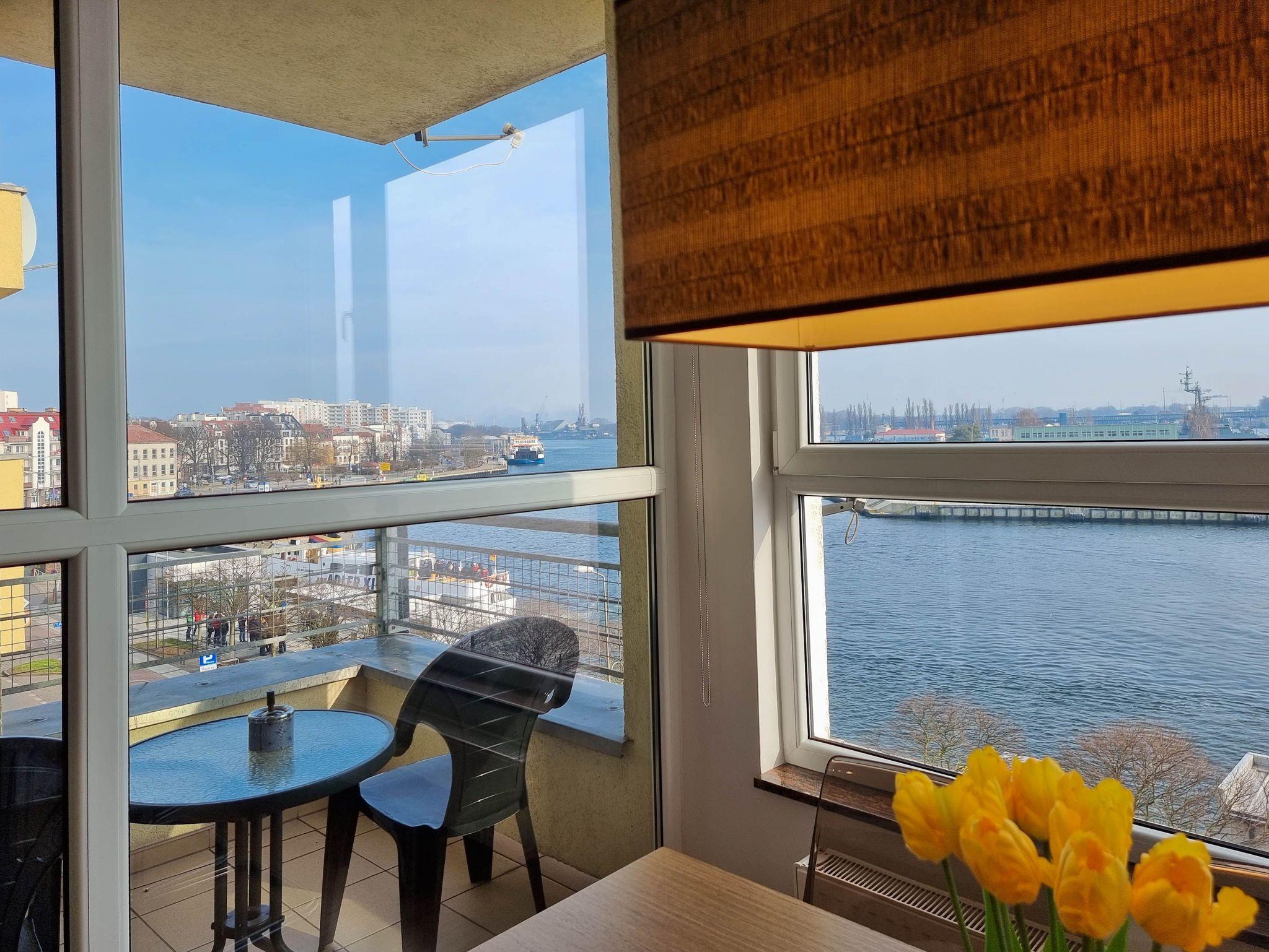 Eine sonnige Zweizimmer- Wohnung im dritten Stock, mit einem Südbalkon von dem sich ein schöner Blick auf die Mündung der Swine und den Hafen ausbreitet. Es besteht aus einem hellen und geräumigen Wohnzimmer verbunden mit einer voll ausgestatteten Küchenzeile (Kühlschrank, Geschirrspüler, Backofen, 4-Platten- Elektroherd, elektrischer Wasserkocher, Kaffeemaschine, Toaster) einem Schlafzimmer mit Ehebett und einem großem Kleiderschrank und einem Badezimmer mit Badewanne, WC und Waschmaschine. Vom Wohnzimmer aus, das eine gemütliche Sofa 140x210cm, einen Esstisch mit vier Stühlen, einen Couchtisch, Fernseher und einen TV- Regal beinhaltet, kann man auf einen möblierten Balkon rausgehen. Die Fenster sind nach Süden gerichtet. Zur Verfügung der Gäste WLAN.