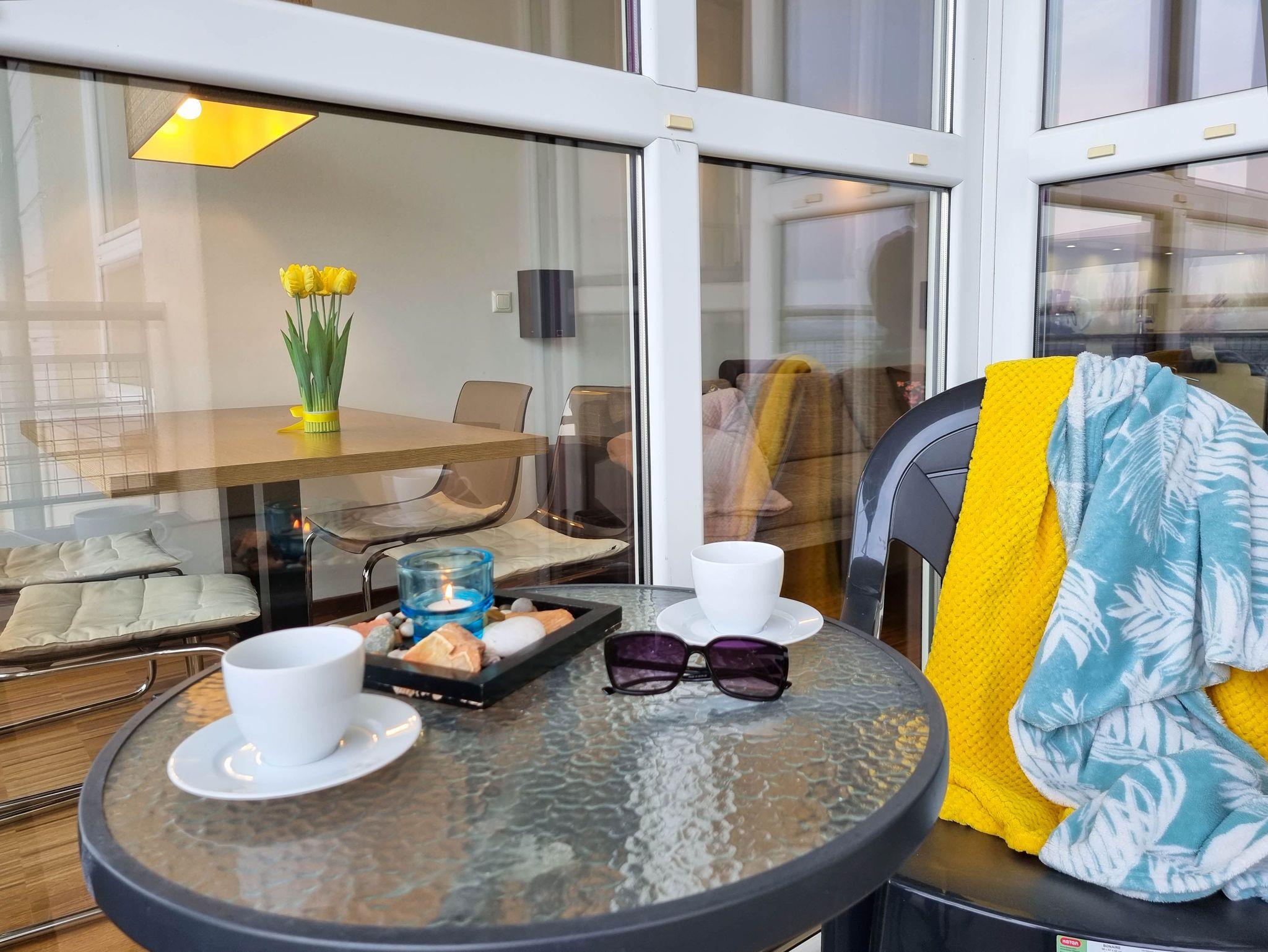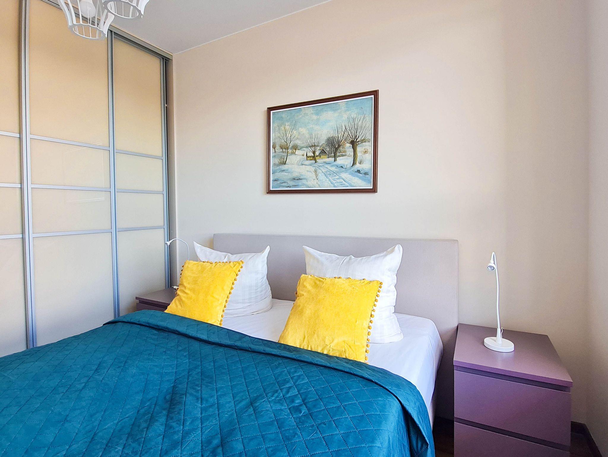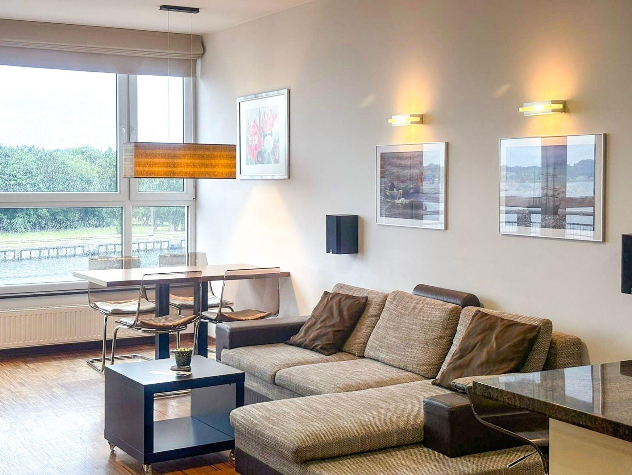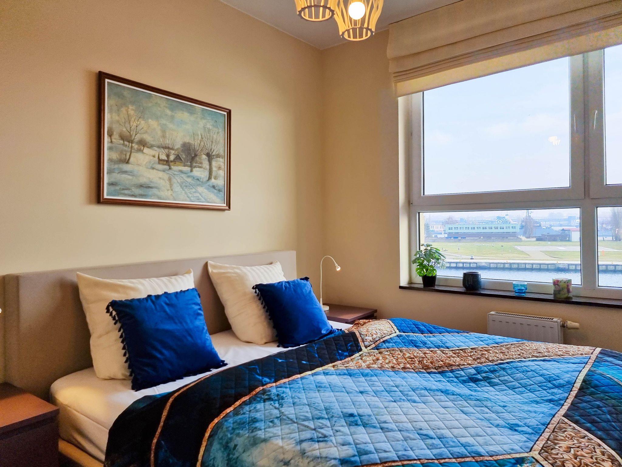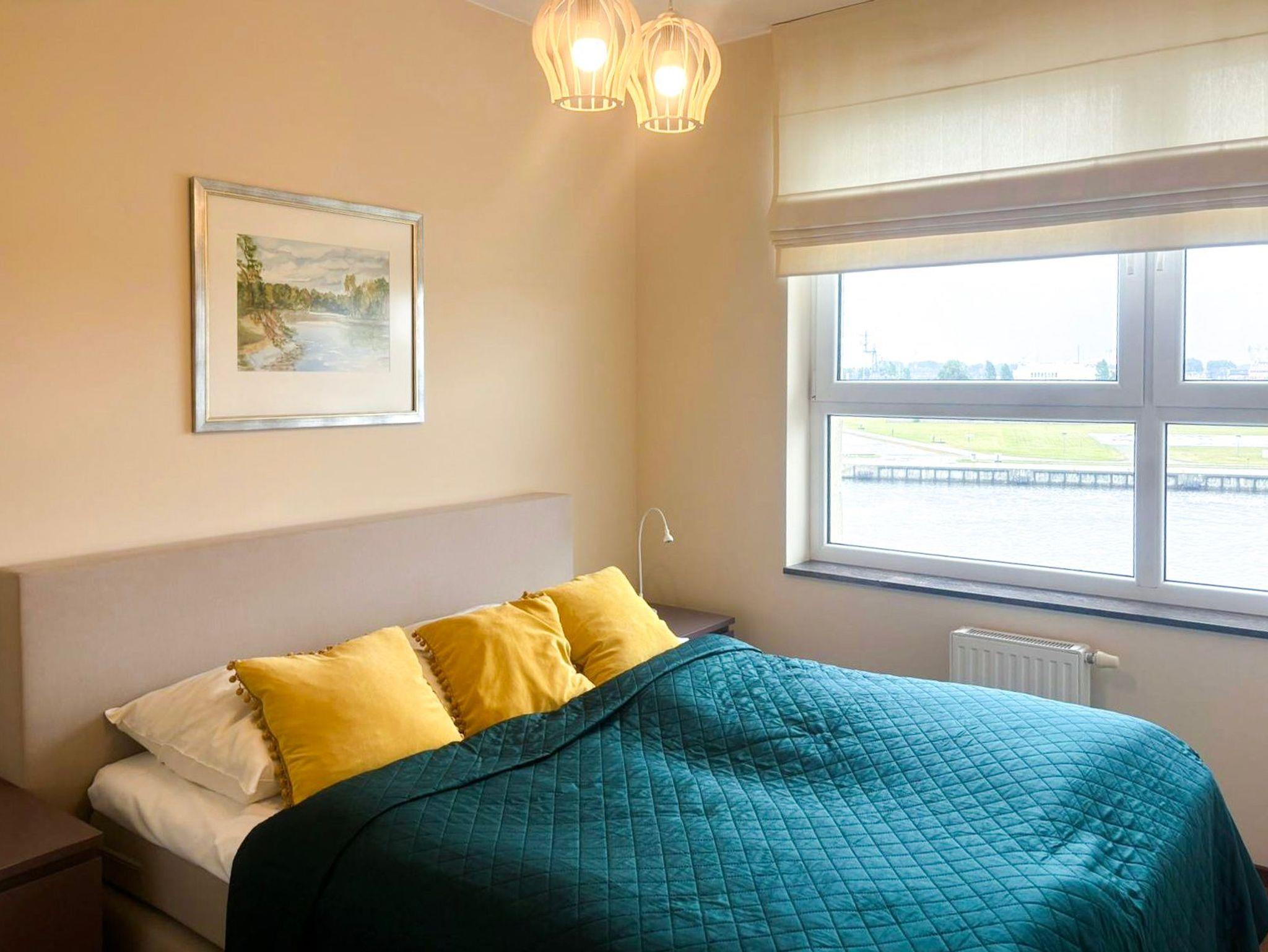 Eine sonnige Zweizimmer- Wohnung im dritten Stock, mit einem Südbalkon von dem sich ein schöner Blick auf die Mündung der Swine und den Hafen ausbreitet. Es besteht aus einem hellen und geräumigen Wohnzimmer verbunden mit einer voll ausgestatteten Küchenzeile (Kühlschrank, Geschirrspüler, Backofen, 4-Platten- Elektroherd, elektrischer Wasserkocher, Kaffeemaschine, Toaster) einem Schlafzimmer mit Ehebett und einem großem Kleiderschrank und einem Badezimmer mit Badewanne, WC und Waschmaschine. Vom Wohnzimmer aus, das eine gemütliche Sofa 140x210cm, einen Esstisch mit vier Stühlen, einen Couchtisch, Fernseher und einen TV- Regal beinhaltet, kann man auf einen möblierten Balkon rausgehen. Die Fenster sind nach Süden gerichtet. Zur Verfügung der Gäste WLAN.