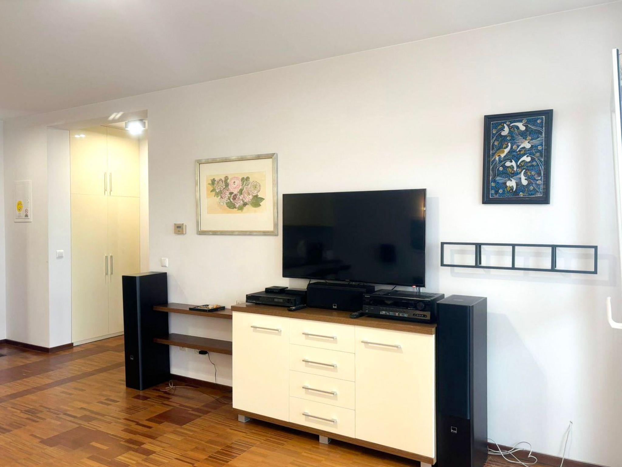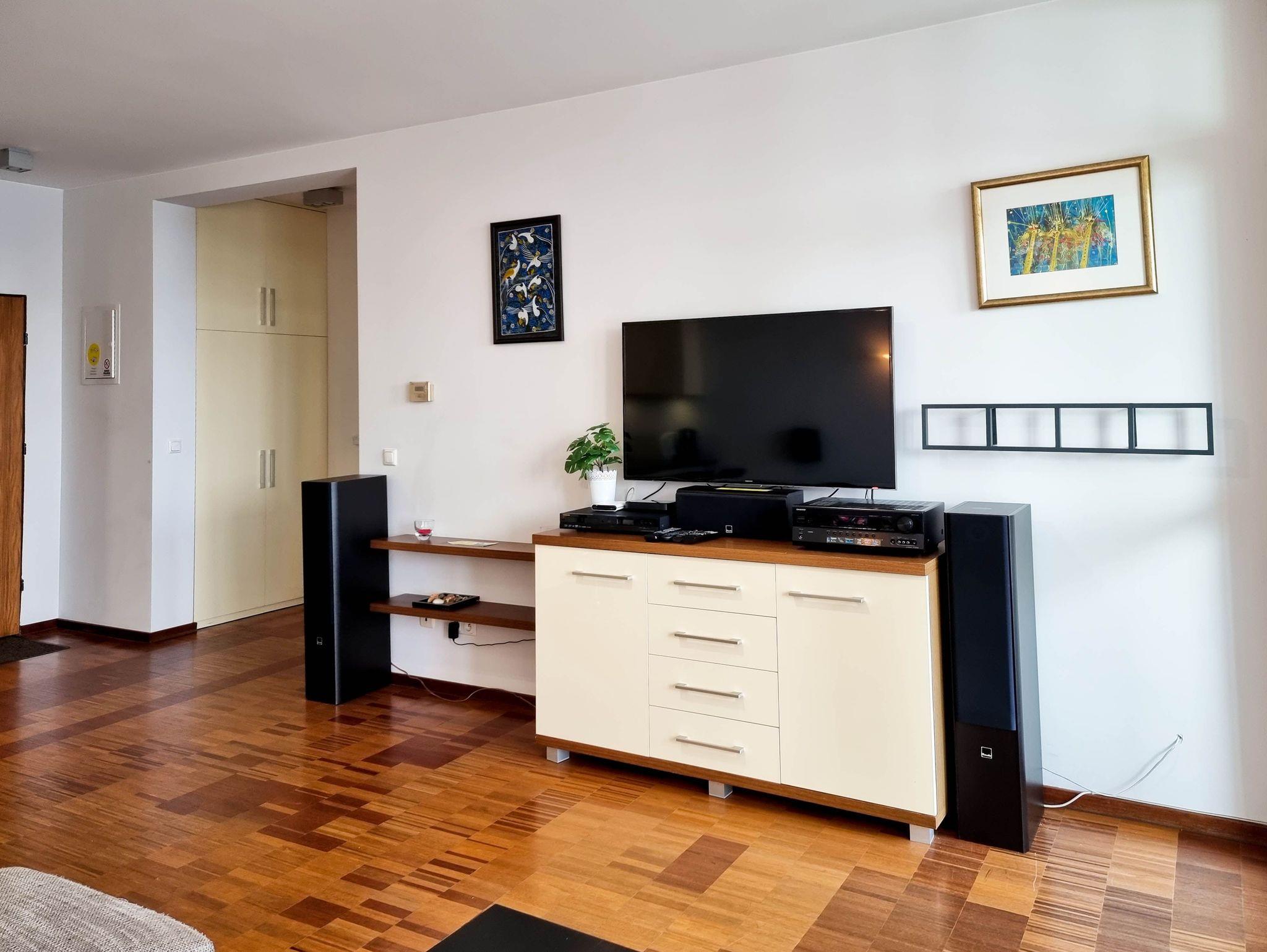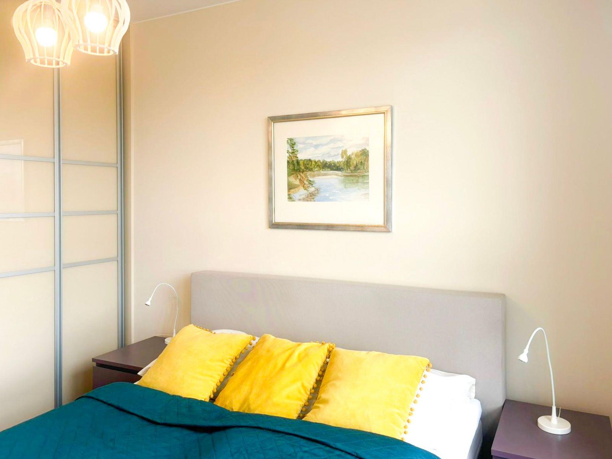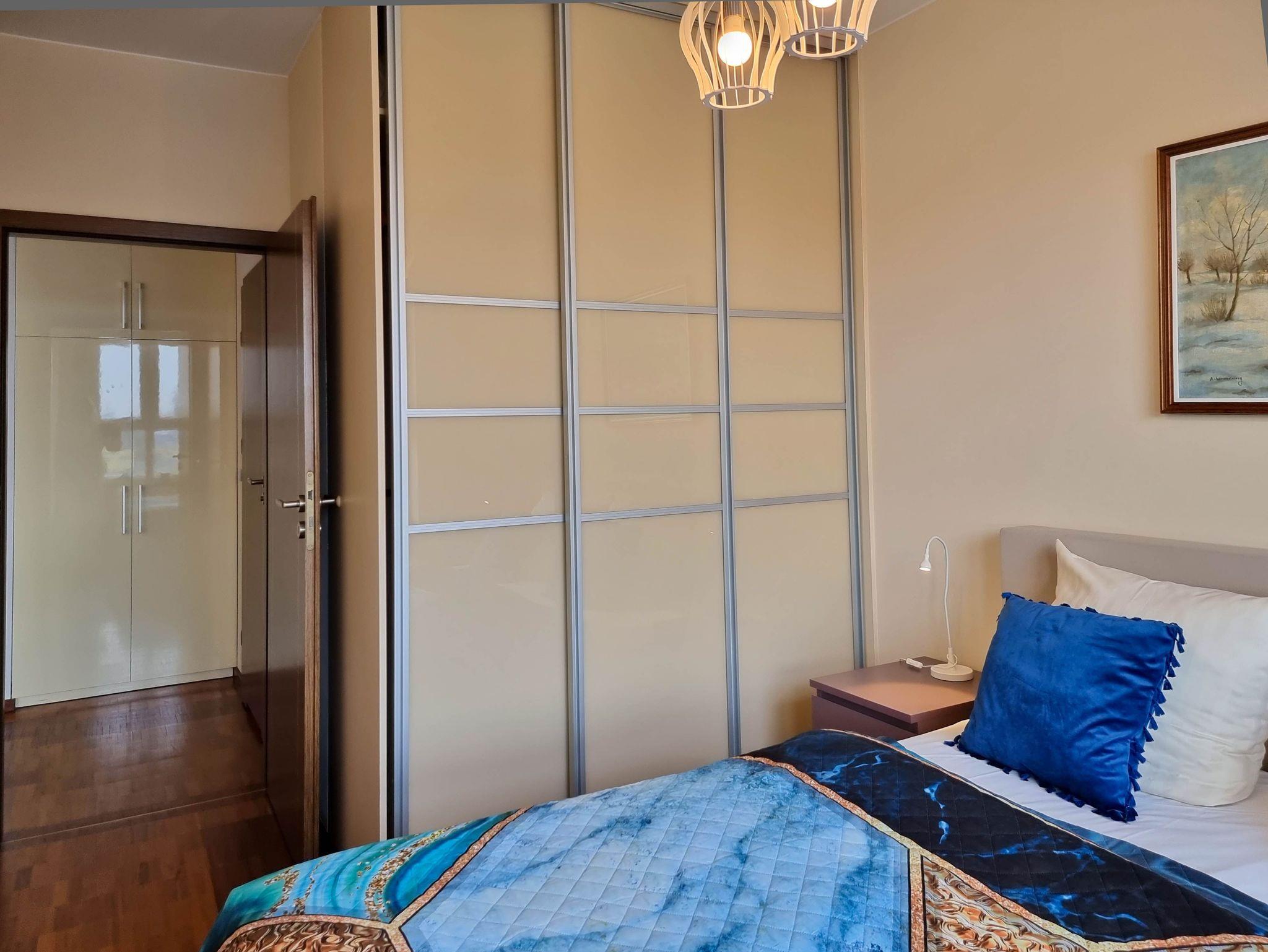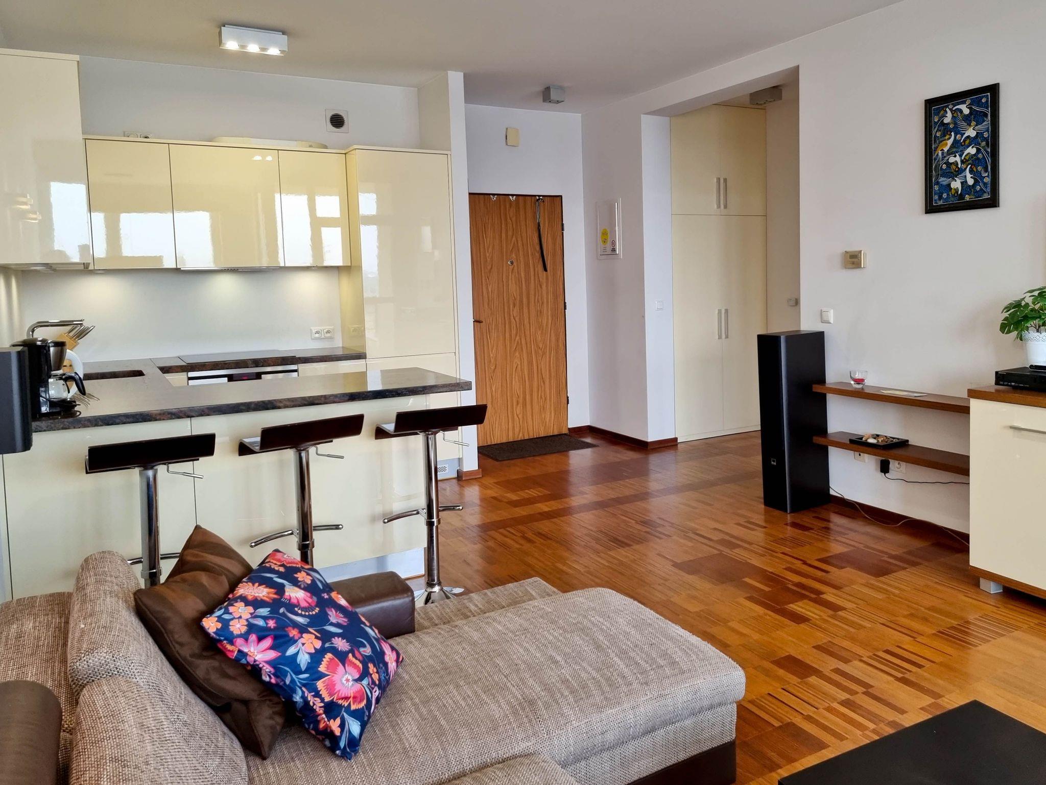 Eine sonnige Zweizimmer- Wohnung im dritten Stock, mit einem Südbalkon von dem sich ein schöner Blick auf die Mündung der Swine und den Hafen ausbreitet. Es besteht aus einem hellen und geräumigen Wohnzimmer verbunden mit einer voll ausgestatteten Küchenzeile (Kühlschrank, Geschirrspüler, Backofen, 4-Platten- Elektroherd, elektrischer Wasserkocher, Kaffeemaschine, Toaster) einem Schlafzimmer mit Ehebett und einem großem Kleiderschrank und einem Badezimmer mit Badewanne, WC und Waschmaschine. Vom Wohnzimmer aus, das eine gemütliche Sofa 140x210cm, einen Esstisch mit vier Stühlen, einen Couchtisch, Fernseher und einen TV- Regal beinhaltet, kann man auf einen möblierten Balkon rausgehen. Die Fenster sind nach Süden gerichtet. Zur Verfügung der Gäste WLAN.