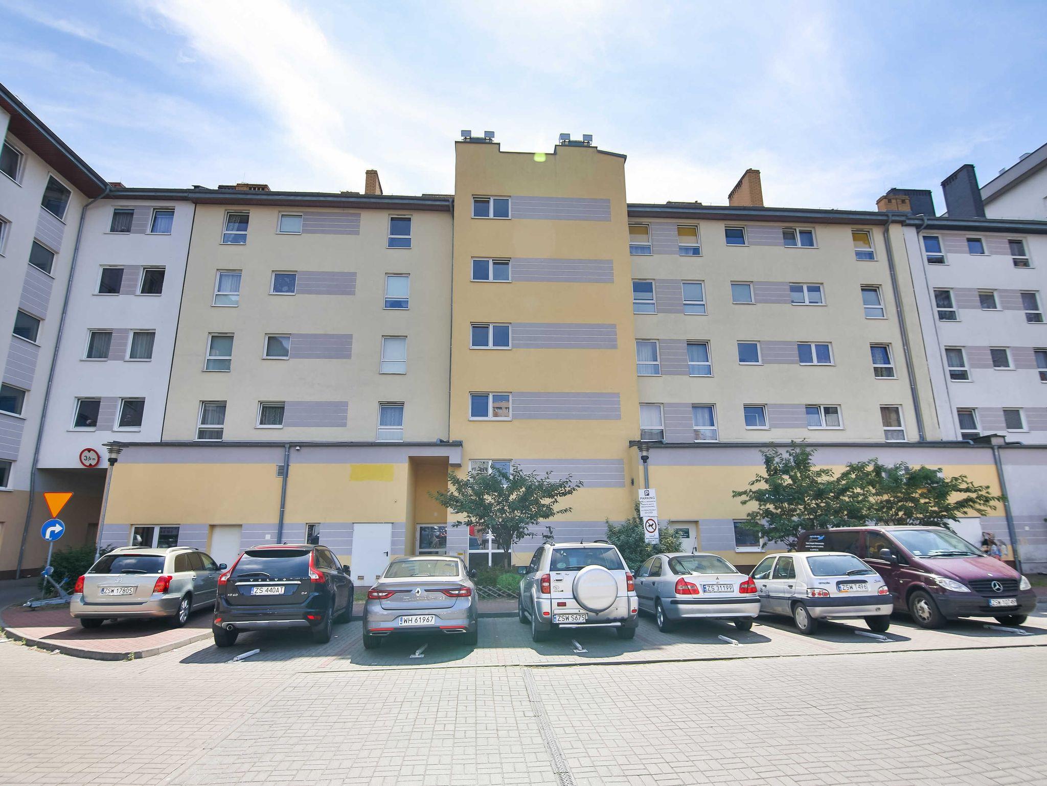 Grunwaldzka Straße, d.h. zum Zentrum von Swinemünde. Alle Wohnungen sind so entworfen, so dass die effektive Verglasung und Balkone zur Südseite mit Blick auf die Mündung der Swine und den Hafen gerichtet sind. Das Erdgeschoss hat eine Handels- und Dienstleistungsfunktion (Solarium, Restaurant, Supermarkt, etc.). Das Gebäude verfügt über einen Aufzug, Kabel-TV und die Parkplätze befinden sich auf der Rückseite des Gebäudes.