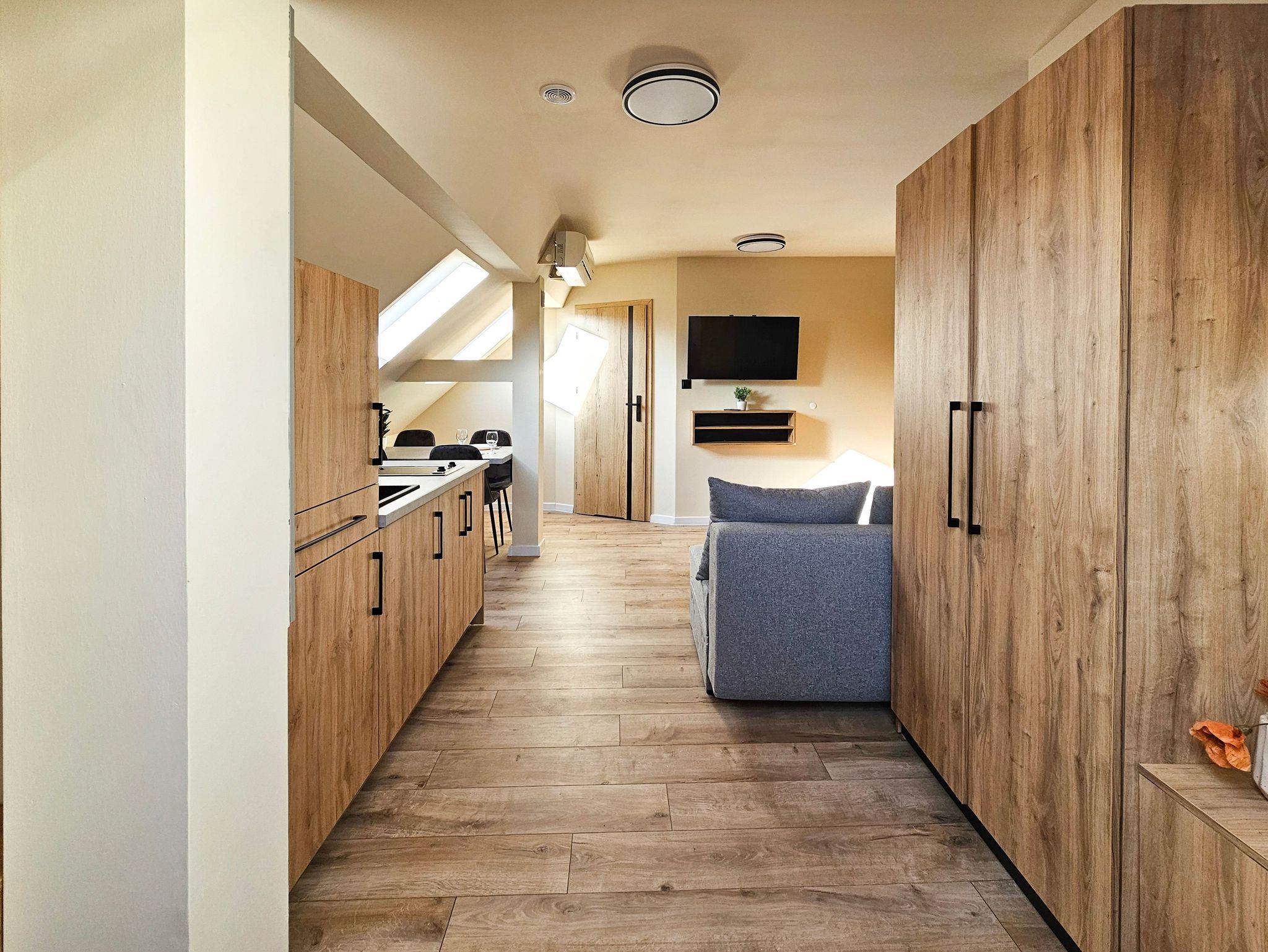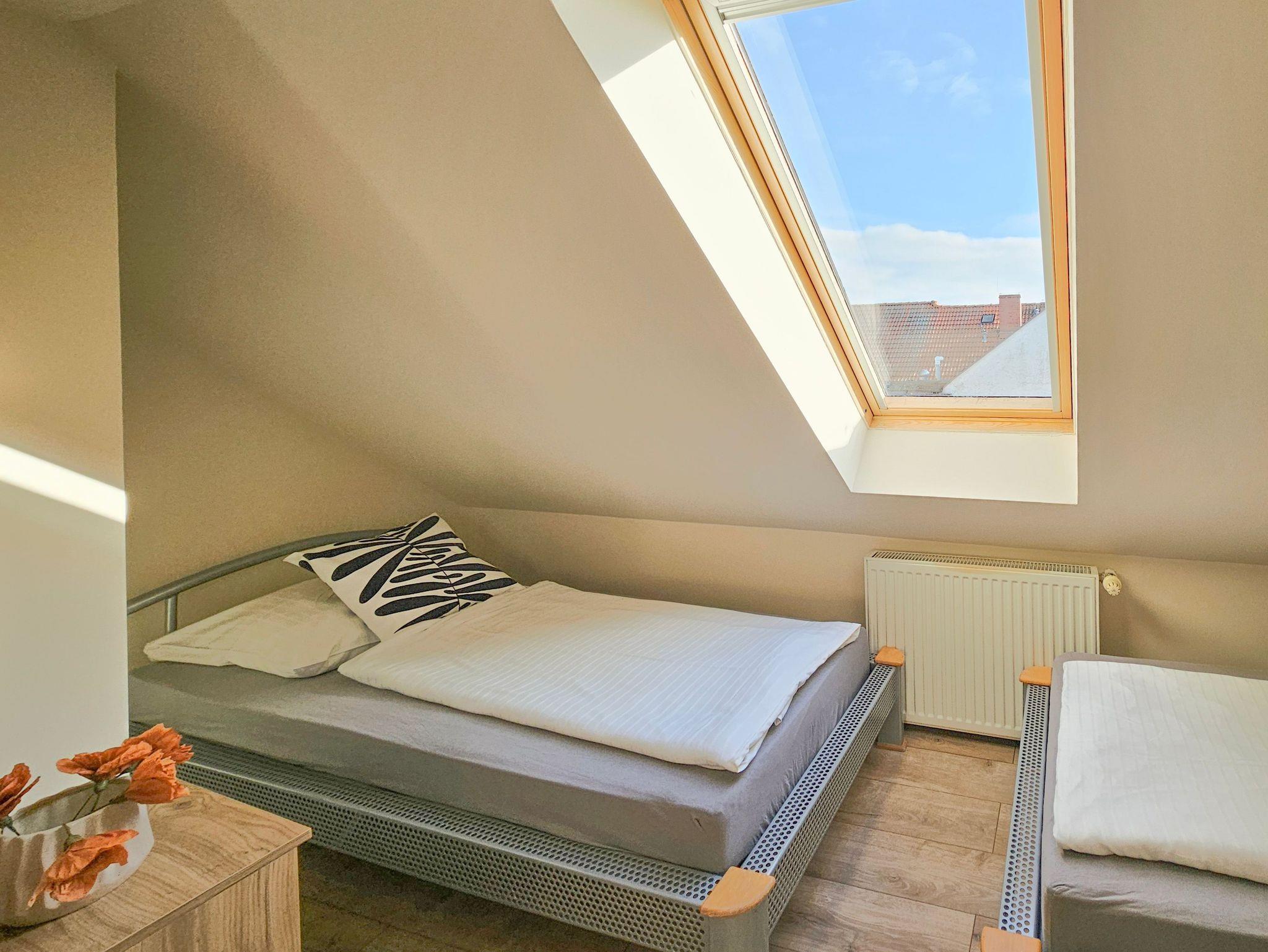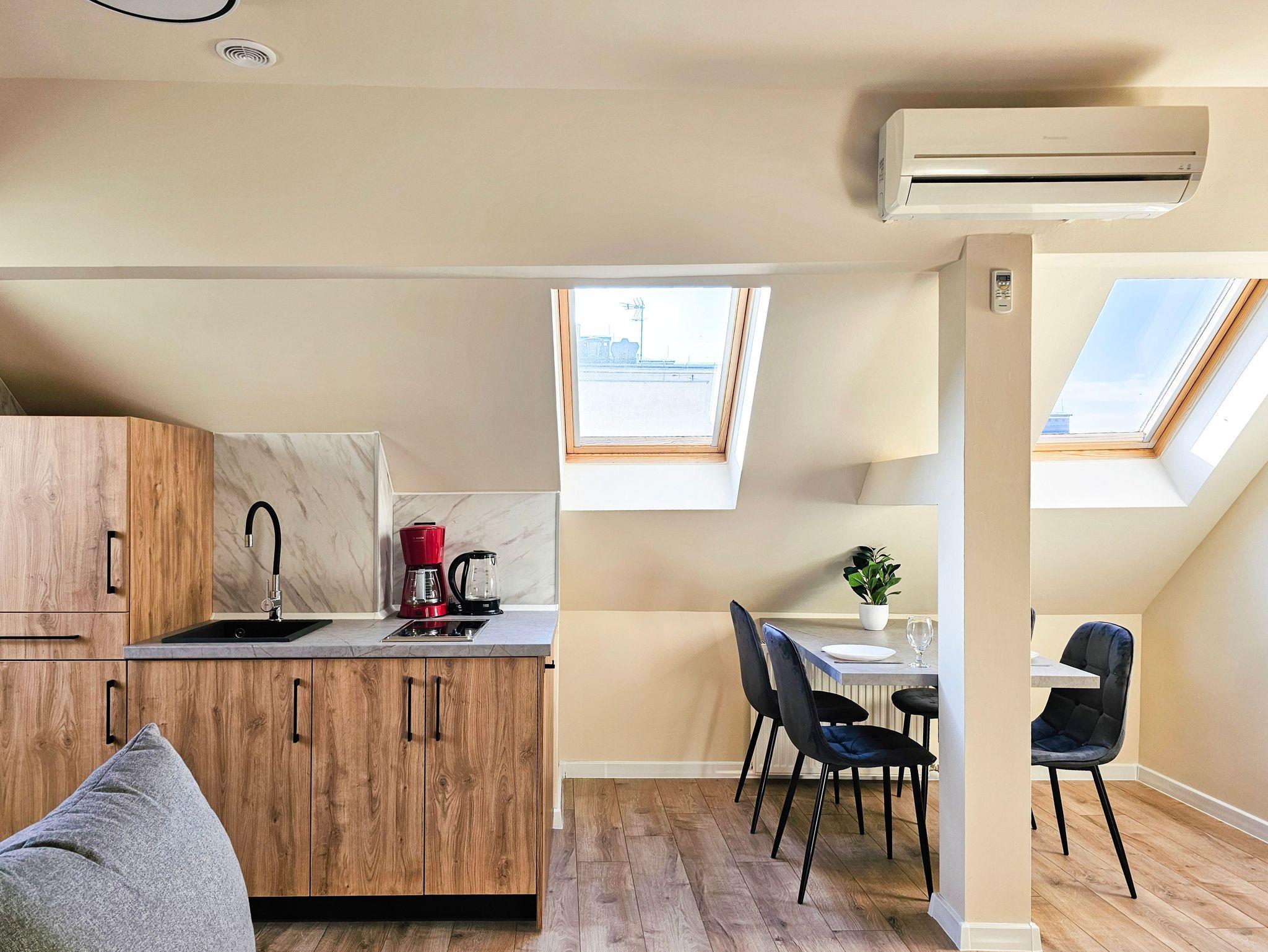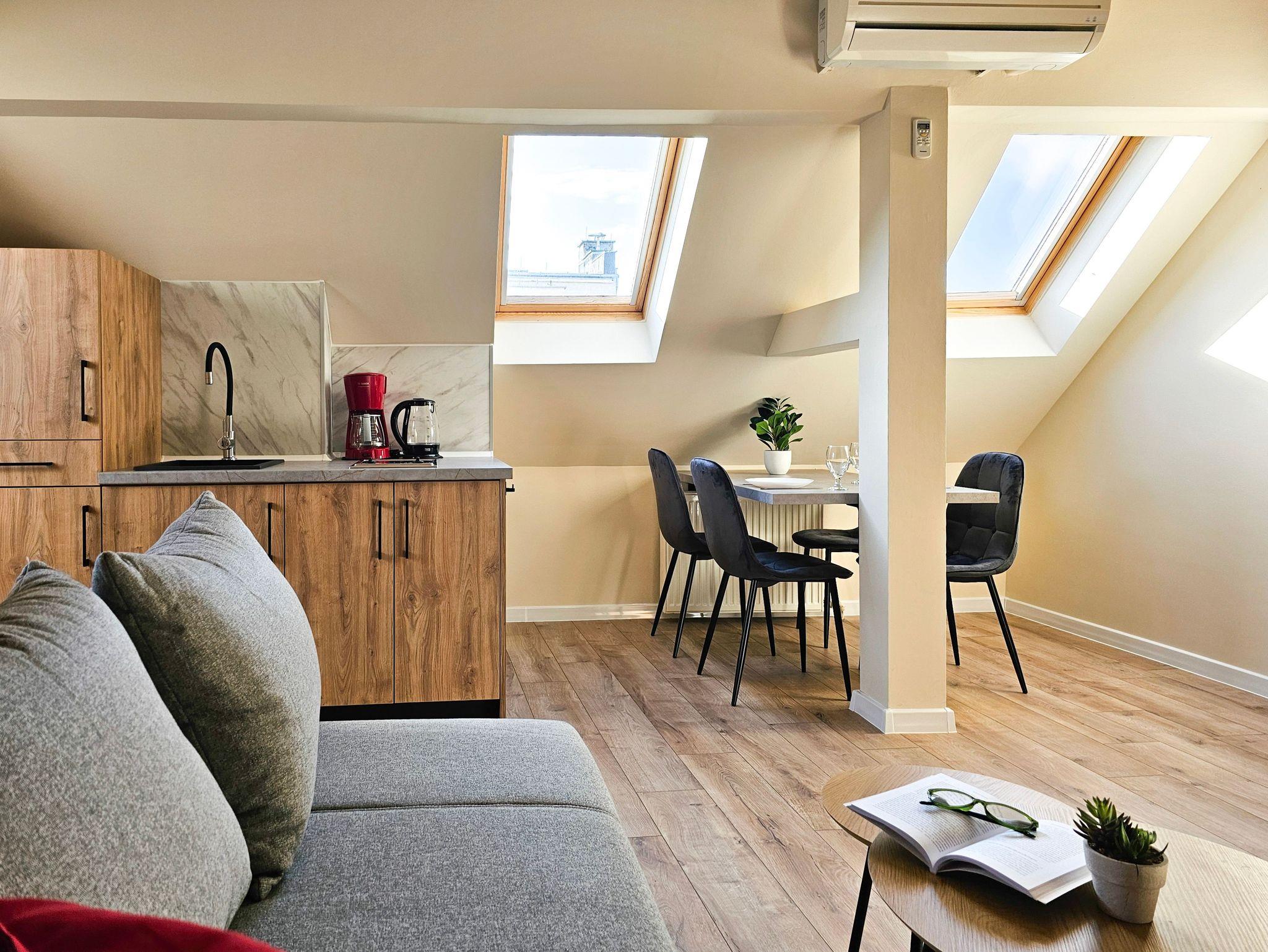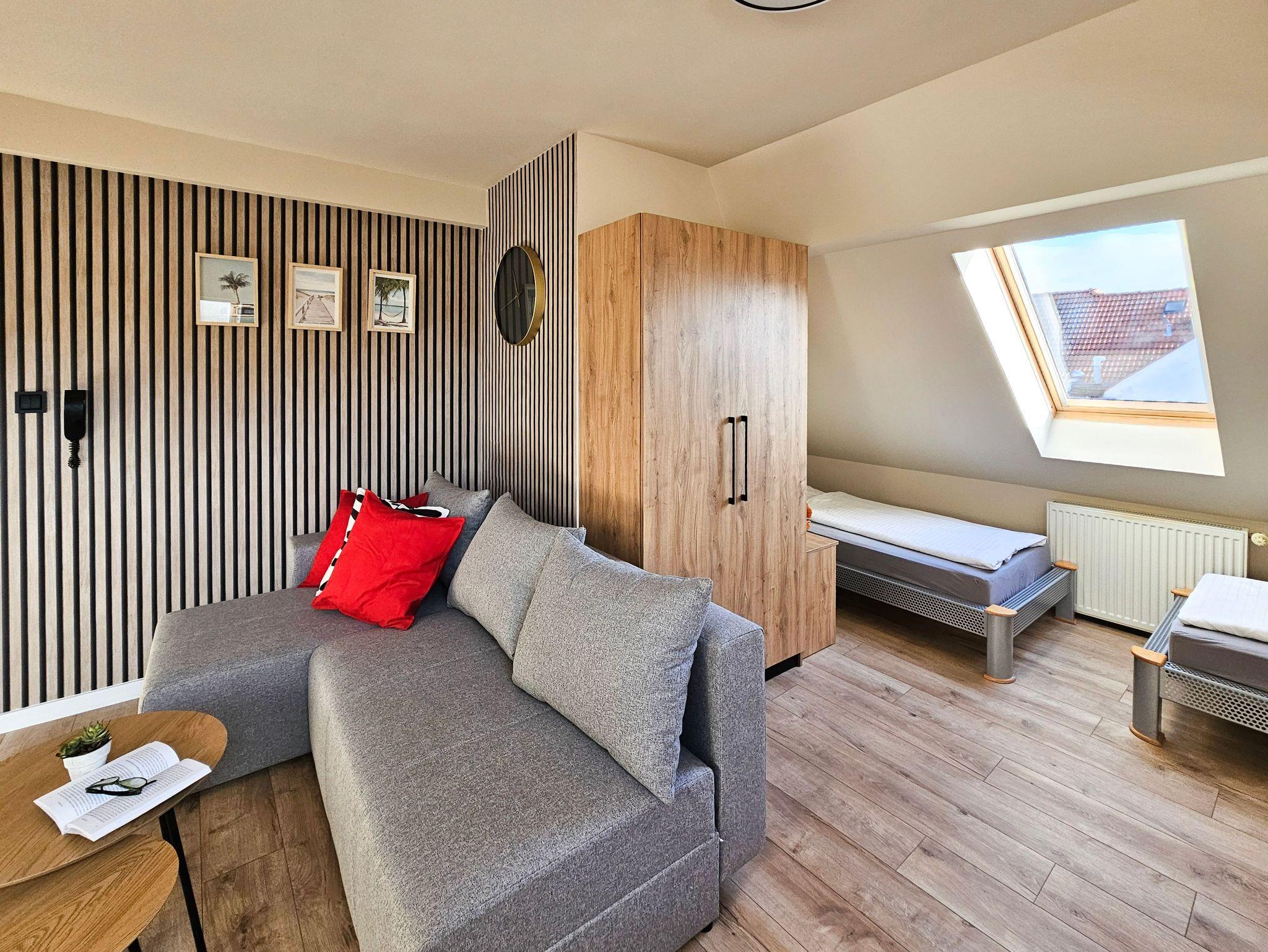 Das Studio-Apartment (32 m² mit Schrägen) befindet sich im 4. Stock (Dachgeschoss) eines mit einem Fahrstuhl ausgestatteten Gebäudes. Der Fahrstuhl fährt bis zum dritten Stock, für die eine Etage muss man die Treppe nutzen, um zu der Wohnung zu gelangen. Sie besteht aus einem Raum mit Küchenzeile und einem Badezimmer mit WC und Dusche. Den Gästen stehen zwei Einzelbetten, welche sich an den Schrägen befinden, mit Matratzen (90x200cm) und ein Klappsofa (140x190cm nach dem Ausklappen) zur Verfügung. Die Wohnung besitzt ebenfalls ein Esstisch mit 3 Stühlen, ein Couchtisch, eine Kommode, ein Fernseher, einen kleinen Kleiderschrank und eine Klimaanlage. Die im Zimmer vorhandenen Dachfenster sind mit Jalousien ausgestattet und nach Südosten gerichtet, während das Badezimmerfenster nach Westen gerichtet ist. WLAN ist verfügbar. Der Parkplatz ist nicht garantiert.Das Auto kann man auf der Straße parken, gebührenpflichtig (ganzjährig kostenpflichtige Parkzone). Ein bewachter, kostenpflichtiger Parkplatz ist etwa 350m von der Wohnung entfernt. Haustiere sind nicht erlaubt.