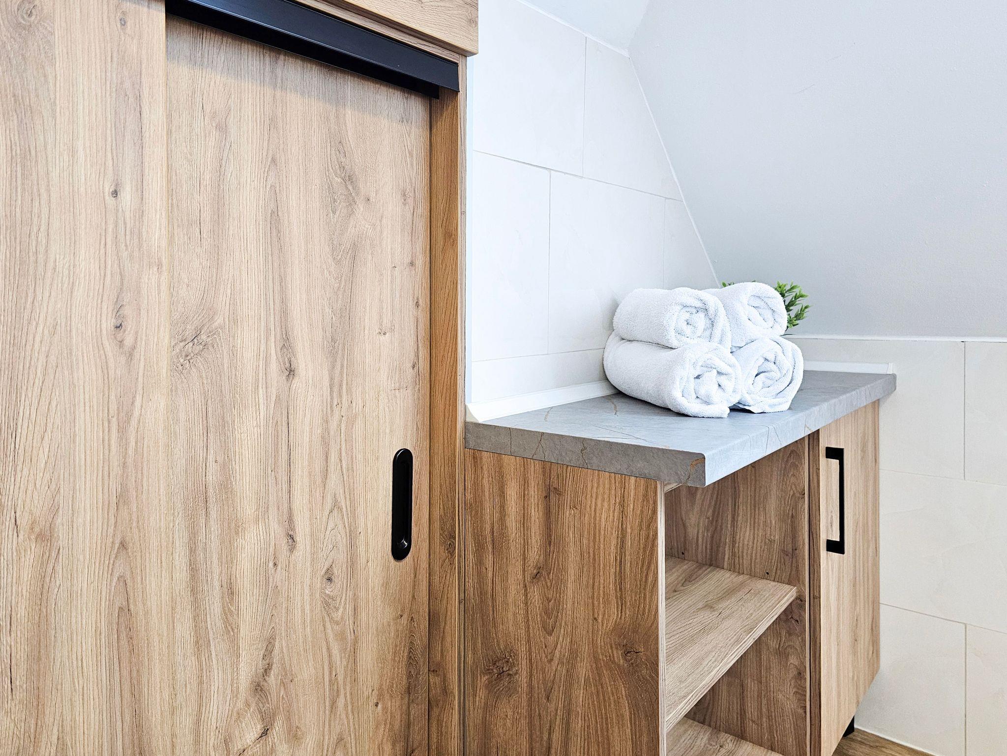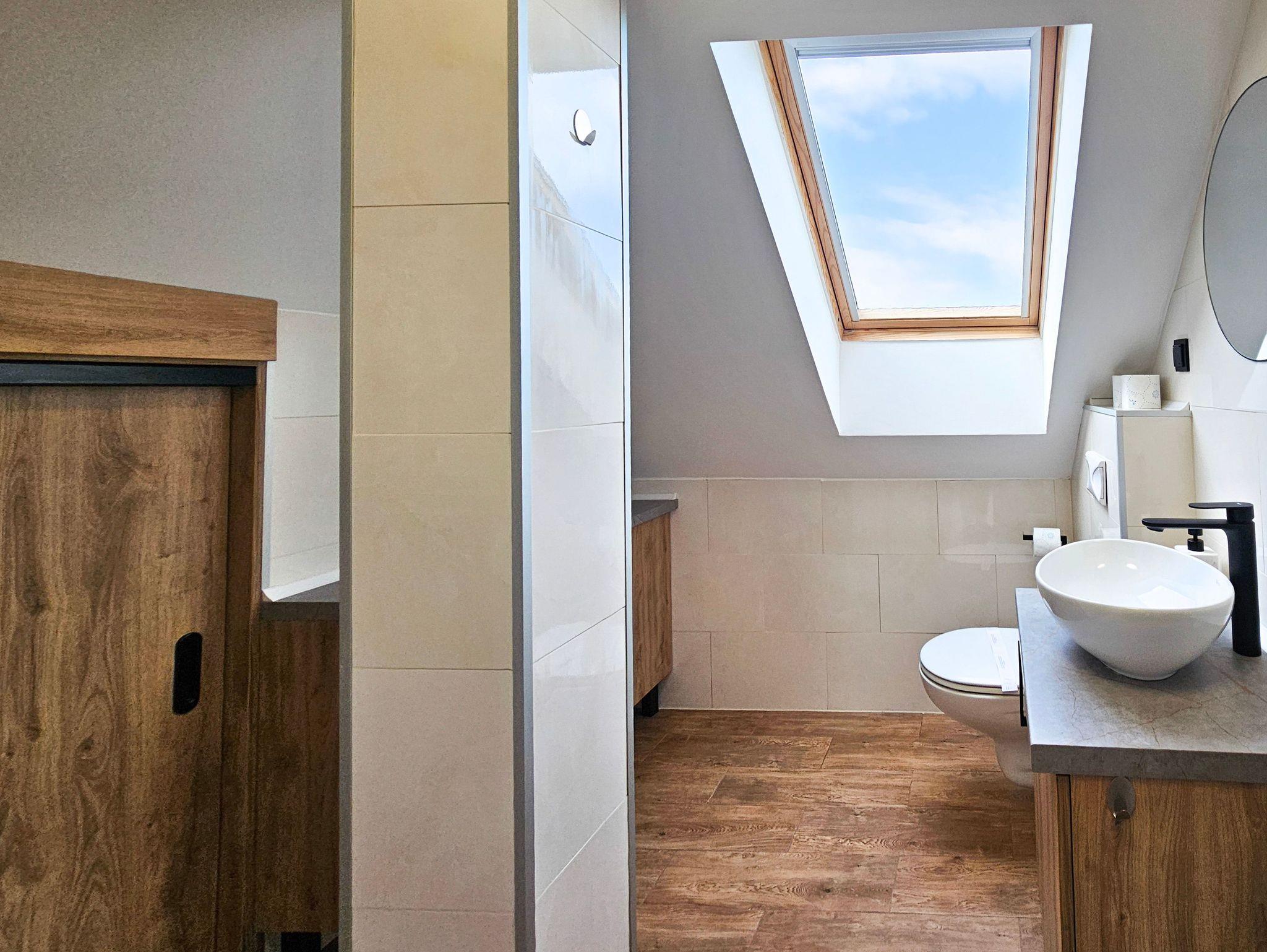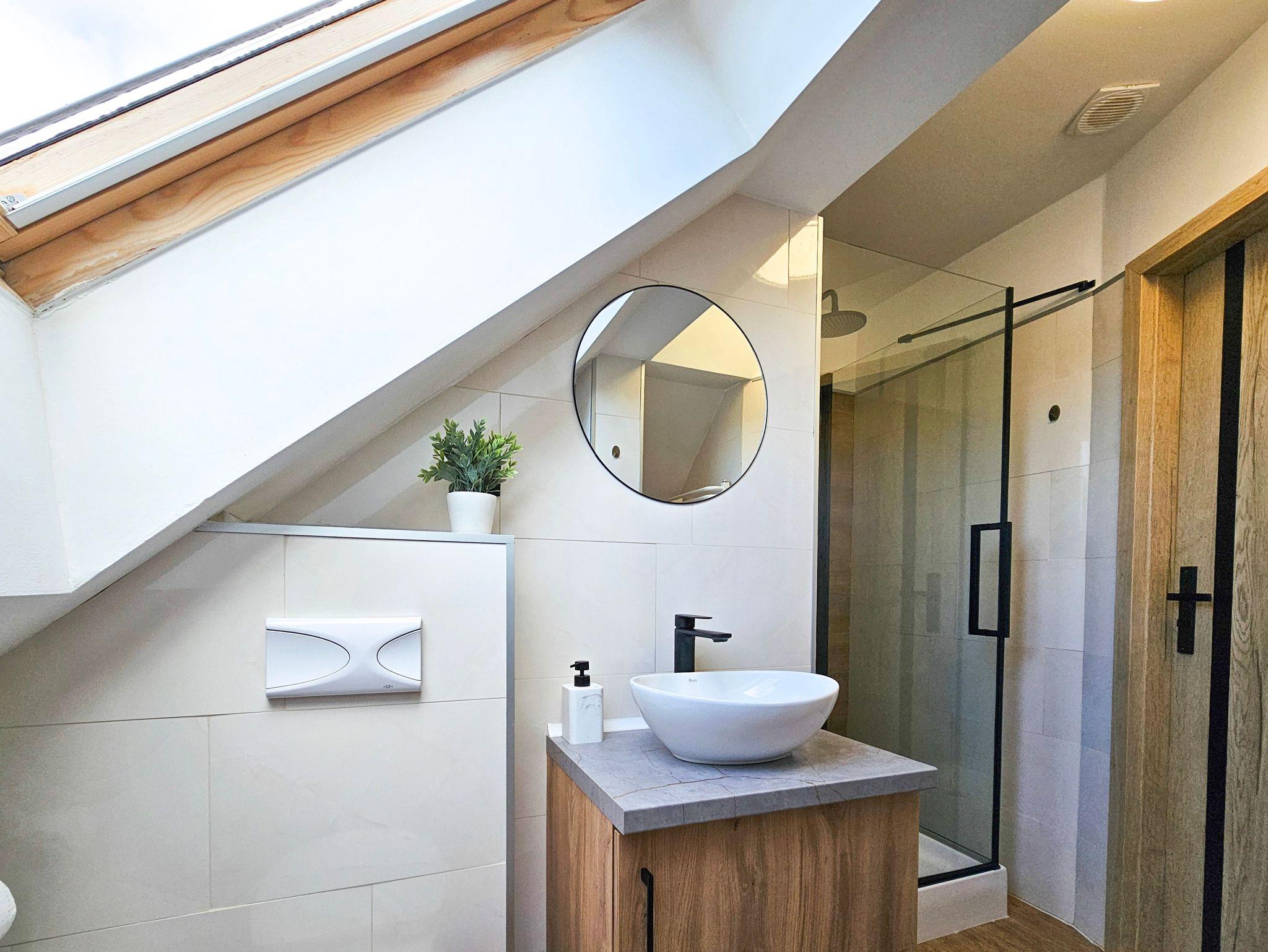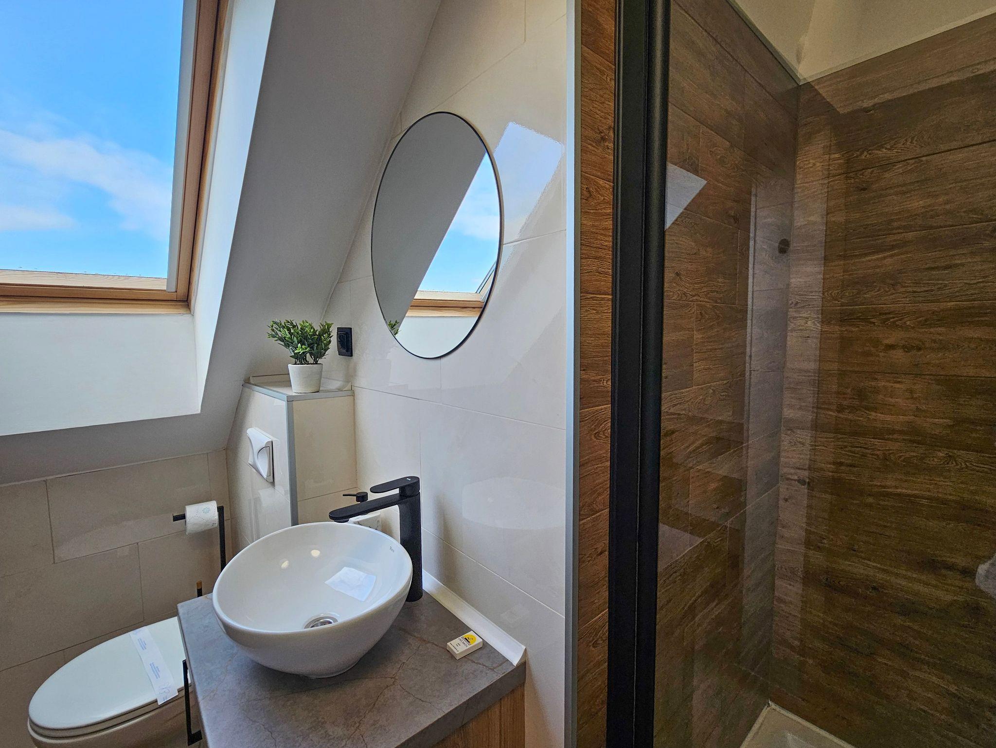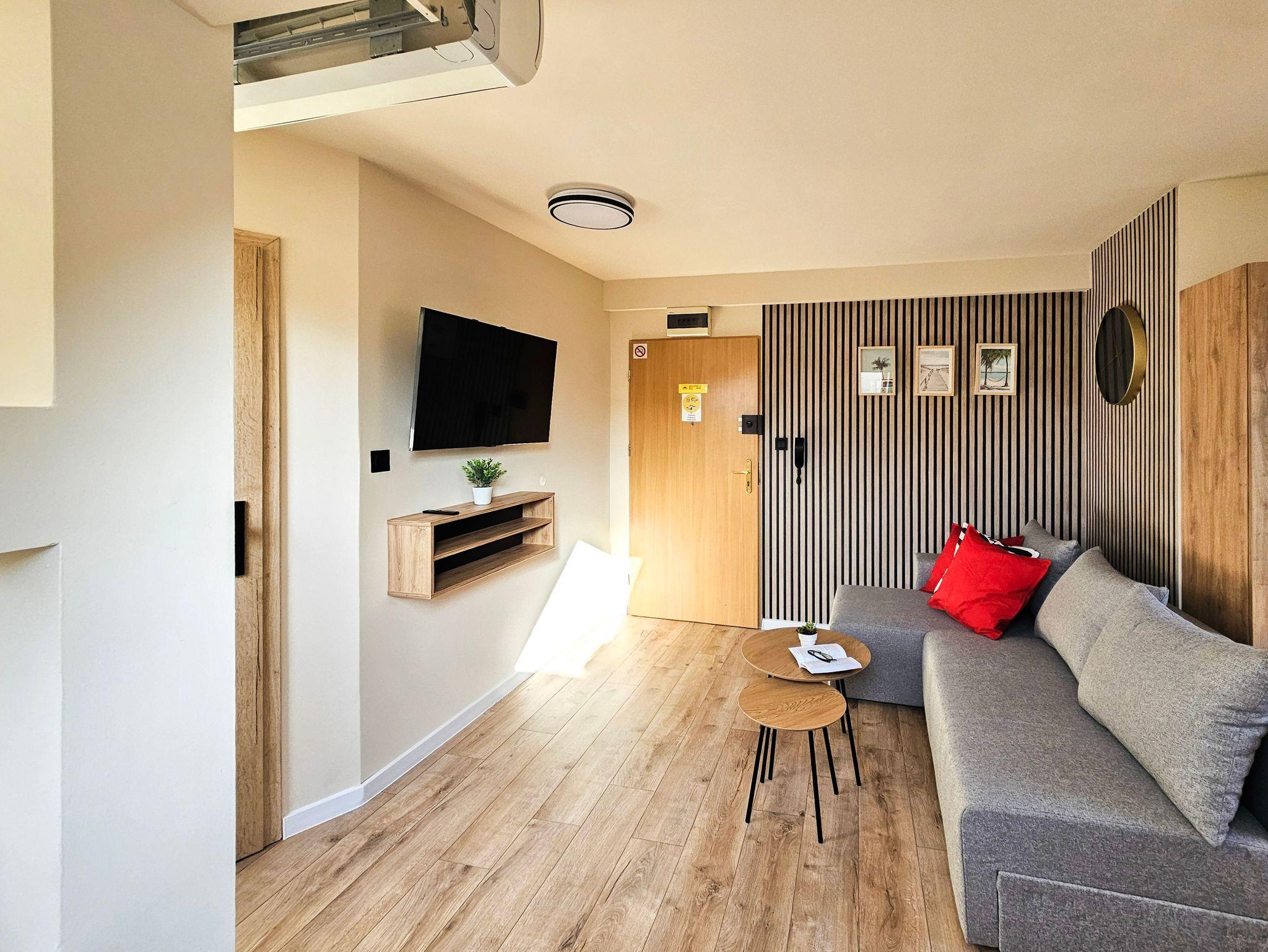 Das Studio-Apartment (32 m² mit Schrägen) befindet sich im 4. Stock (Dachgeschoss) eines mit einem Fahrstuhl ausgestatteten Gebäudes. Der Fahrstuhl fährt bis zum dritten Stock, für die eine Etage muss man die Treppe nutzen, um zu der Wohnung zu gelangen. Sie besteht aus einem Raum mit Küchenzeile und einem Badezimmer mit WC und Dusche. Den Gästen stehen zwei Einzelbetten, welche sich an den Schrägen befinden, mit Matratzen (90x200cm) und ein Klappsofa (140x190cm nach dem Ausklappen) zur Verfügung. Die Wohnung besitzt ebenfalls ein Esstisch mit 3 Stühlen, ein Couchtisch, eine Kommode, ein Fernseher, einen kleinen Kleiderschrank und eine Klimaanlage. Die im Zimmer vorhandenen Dachfenster sind mit Jalousien ausgestattet und nach Südosten gerichtet, während das Badezimmerfenster nach Westen gerichtet ist. WLAN ist verfügbar. Der Parkplatz ist nicht garantiert.Das Auto kann man auf der Straße parken, gebührenpflichtig (ganzjährig kostenpflichtige Parkzone). Ein bewachter, kostenpflichtiger Parkplatz ist etwa 350m von der Wohnung entfernt. Haustiere sind nicht erlaubt.