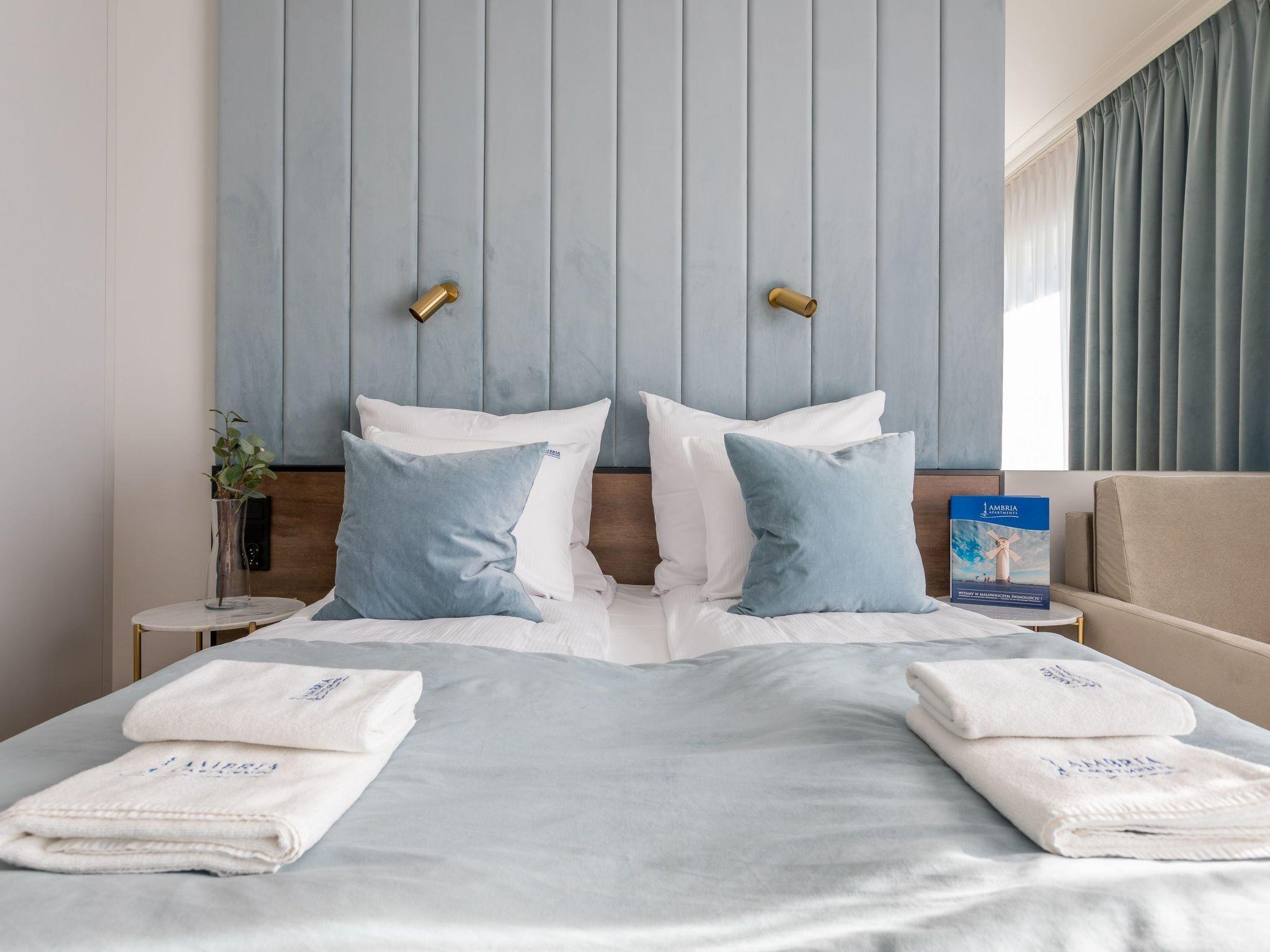"Lividus 303" in Swinoujscie is a very elegant, sunny flat in an exclusive apartment building from 2021 with a restaurant, café and SPA. It consists of a living, dining and sleeping area, a fully equipped kitchenette and a spacious bathroom with a total area of 31m2. An additional advantage is the balcony, which is a practical and functional extension of the flat and allows moments of relaxation in the fresh air, and for car drivers a free parking space in the underground car park. Good equipment guarantees a pleasant stay, both for private and business purposes. The interior is charming, tasteful and cosy: full of bright, warm tones that, together with modern furniture and elegant accessories, create an exquisite yet minimalist whole where you can rest and actively indulge your interests and passions. A beautiful decoration on the wall, just behind the headboard, emphasises the charm of this place and ... ignites the senses.