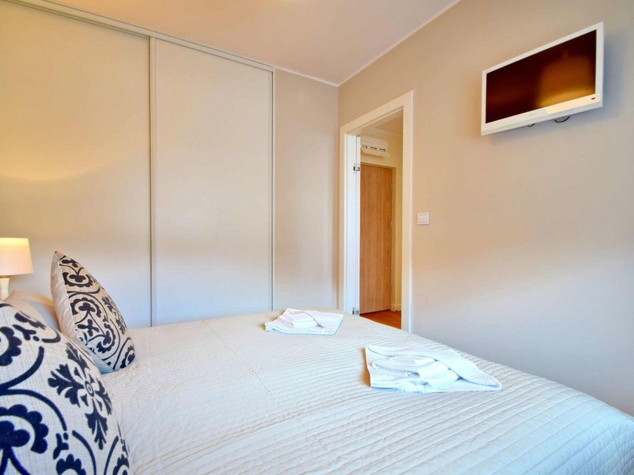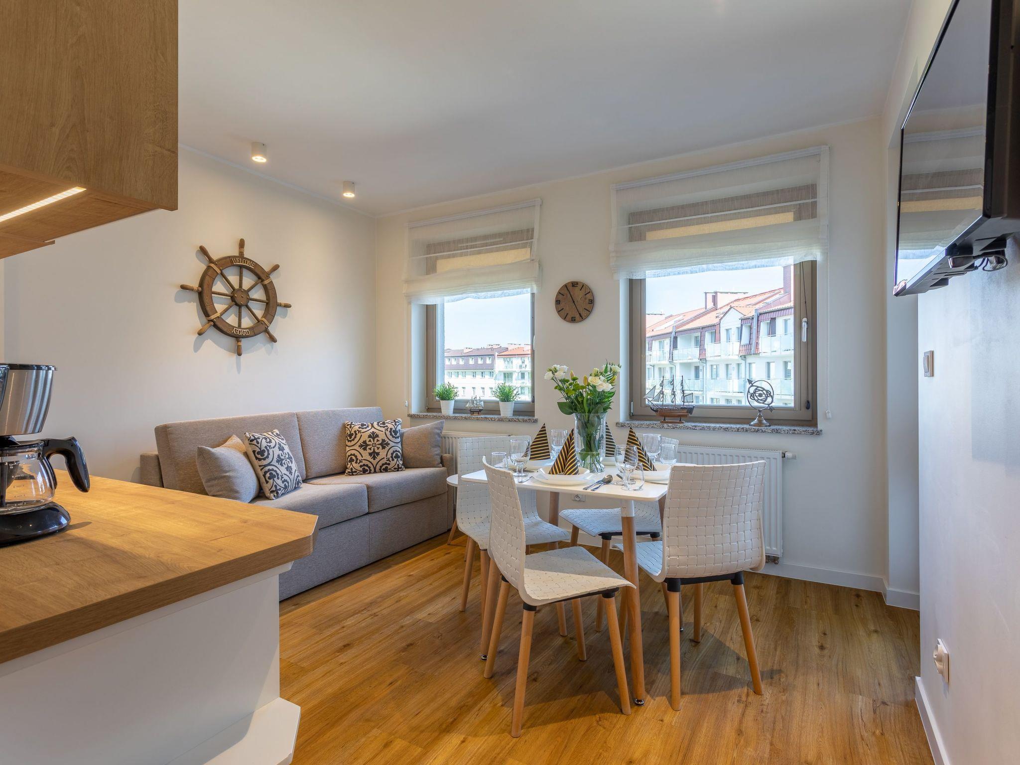 It is a flat with very spacious bedrooms, living room with well-equipped kitchenette, dining area and modern bathroom with total area of 29 m2. A very comfortable double bed in the bedroom and a sofa with a sleeping function and an Italian folding frame ensure a good night's sleep, and it is a very functional, comfortable and bright flat. White, grey and light wood tones dominate, warming up the room and giving it a cosier character. The interior is also characterised by harmony, simplicity, moderation and classic proportions that create a timeless decor. Perfect for people who appreciate tradition and simplicity with a touch of rigour, like on board a ship setting off on a longed-for voyage.