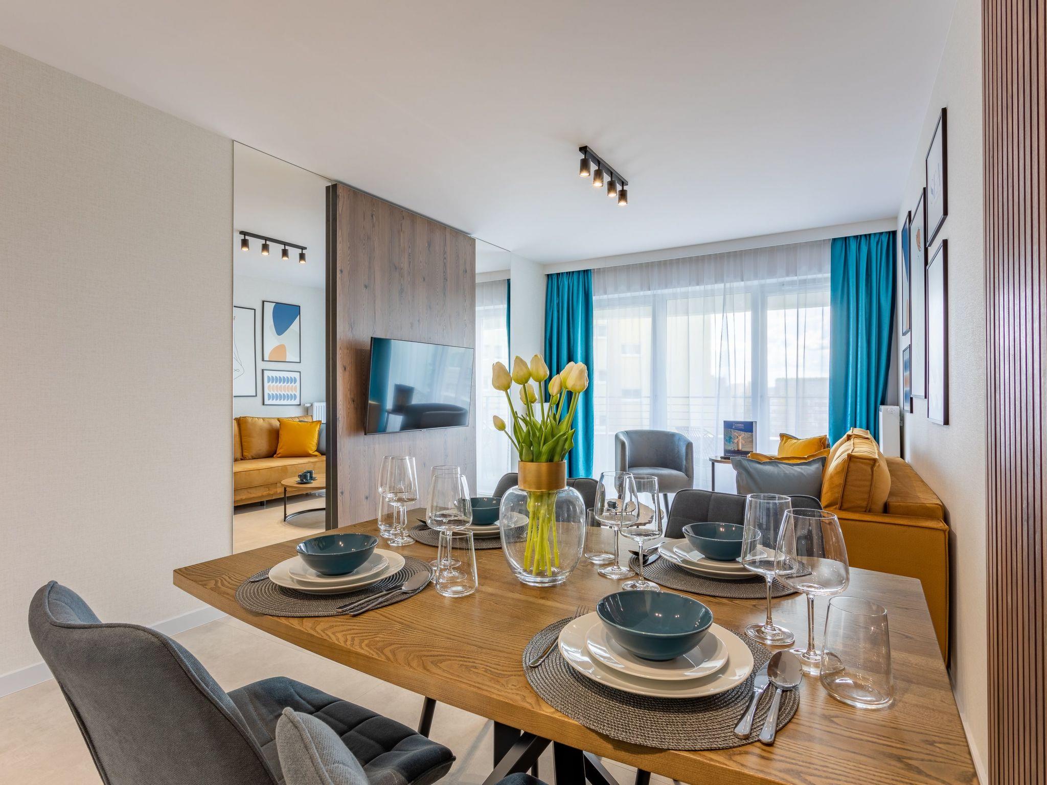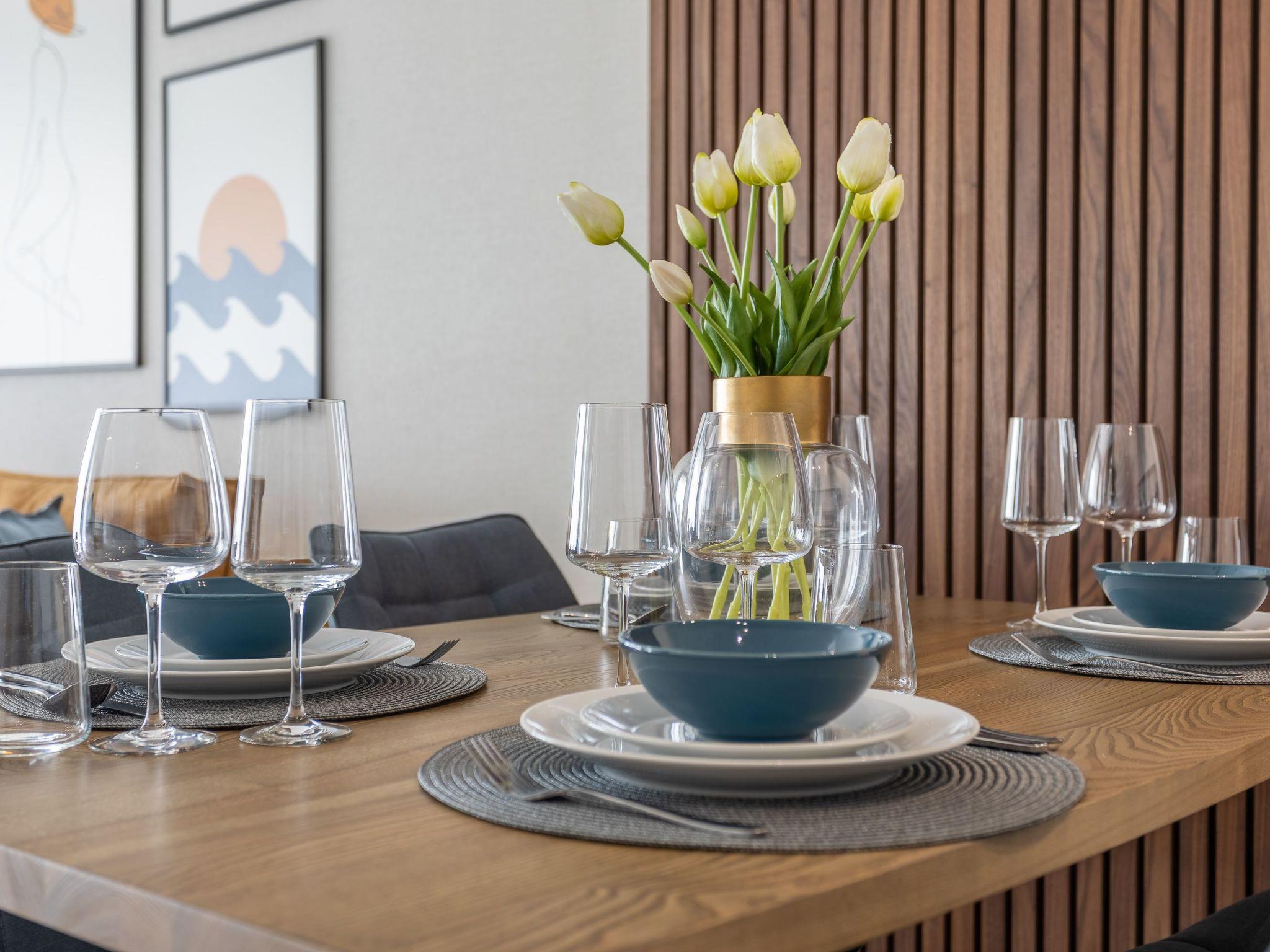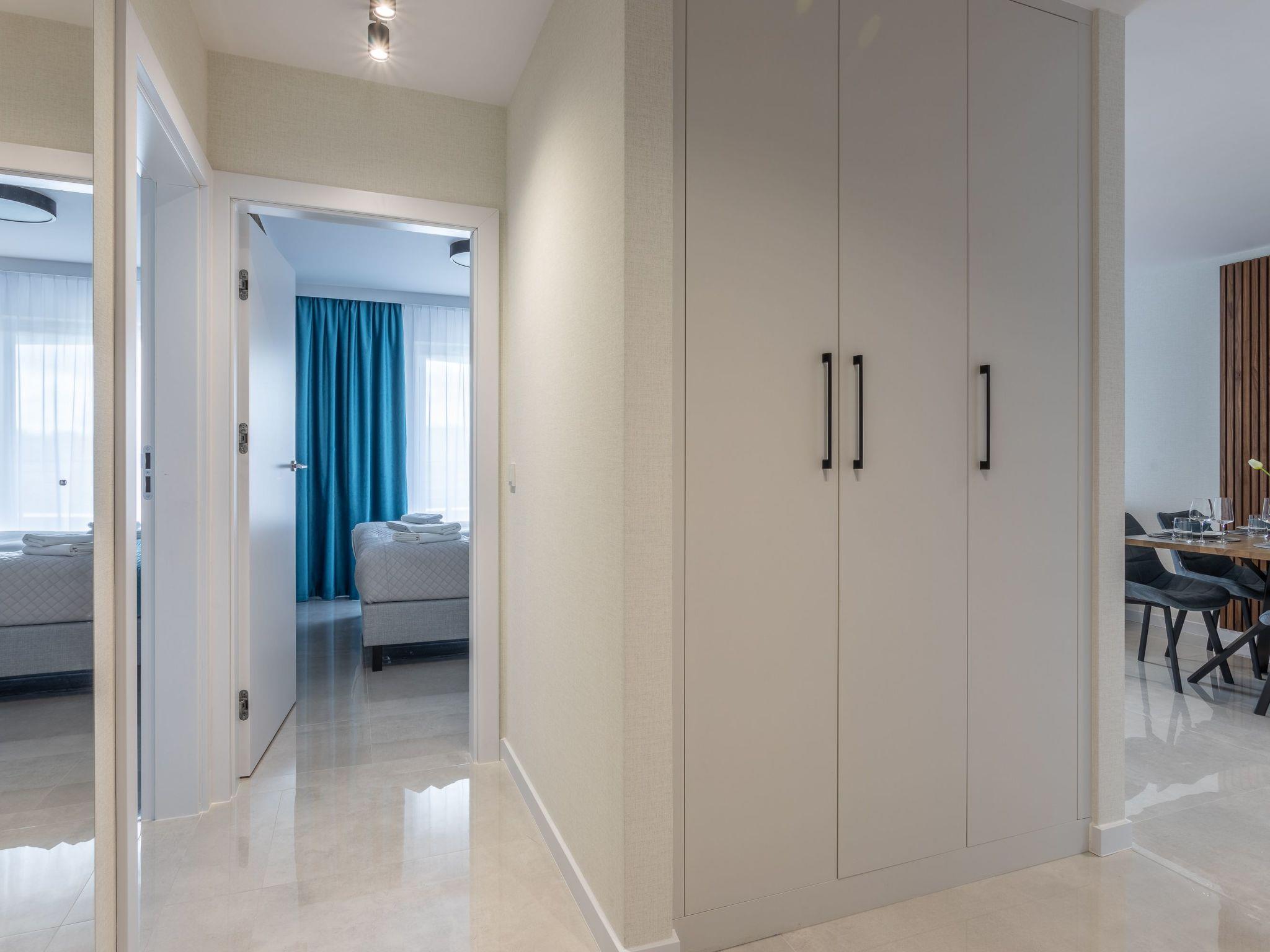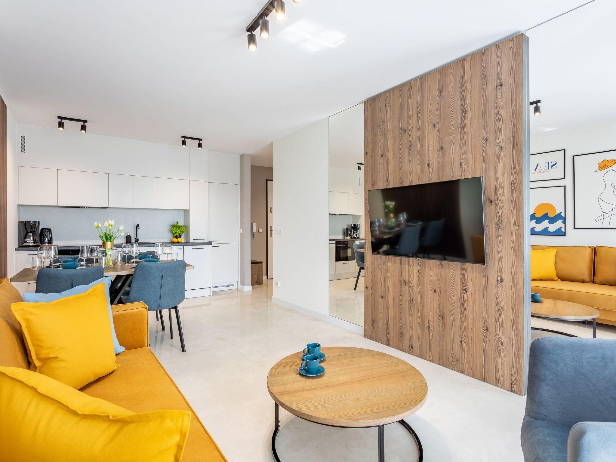 It is a very spacious and luxurious flat with two bedrooms, living room with well-equipped kitchenette and bathroom. Its total area is 55 m2. The usable area is extended by the balcony, where you can spend pleasant moments with a cup of freshly brewed coffee or a glass of your favourite wine. The interior is very originally designed, dominated by shades of grey and white, broken with a deep shade of blue and yellow, as well as beautiful wooden details discreetly smuggled into modern furniture or accessories that warm up the interior and delight with their texture and unconventional look. In addition, thanks to the large and numerous glazed areas, plenty of daylight enters the interior, which also visually enlarges the room and gives it a sense of momentum. Attention is also drawn to expressive and very modern accessories as well as interesting shapes and textures. A private outdoor car park is also available to guests - for a fee - which significantly increases travelling comfort and can be particularly desirable for families with children.