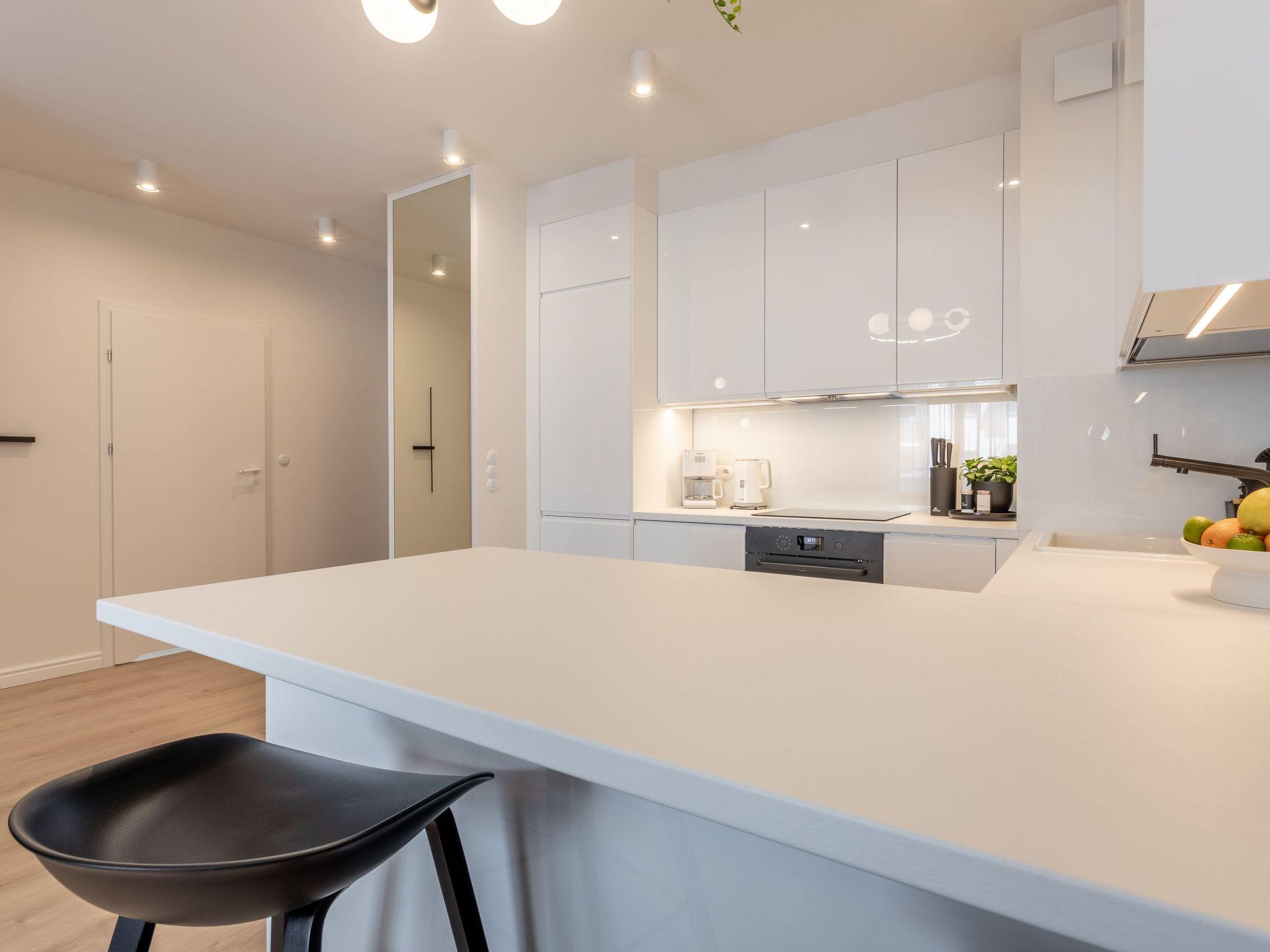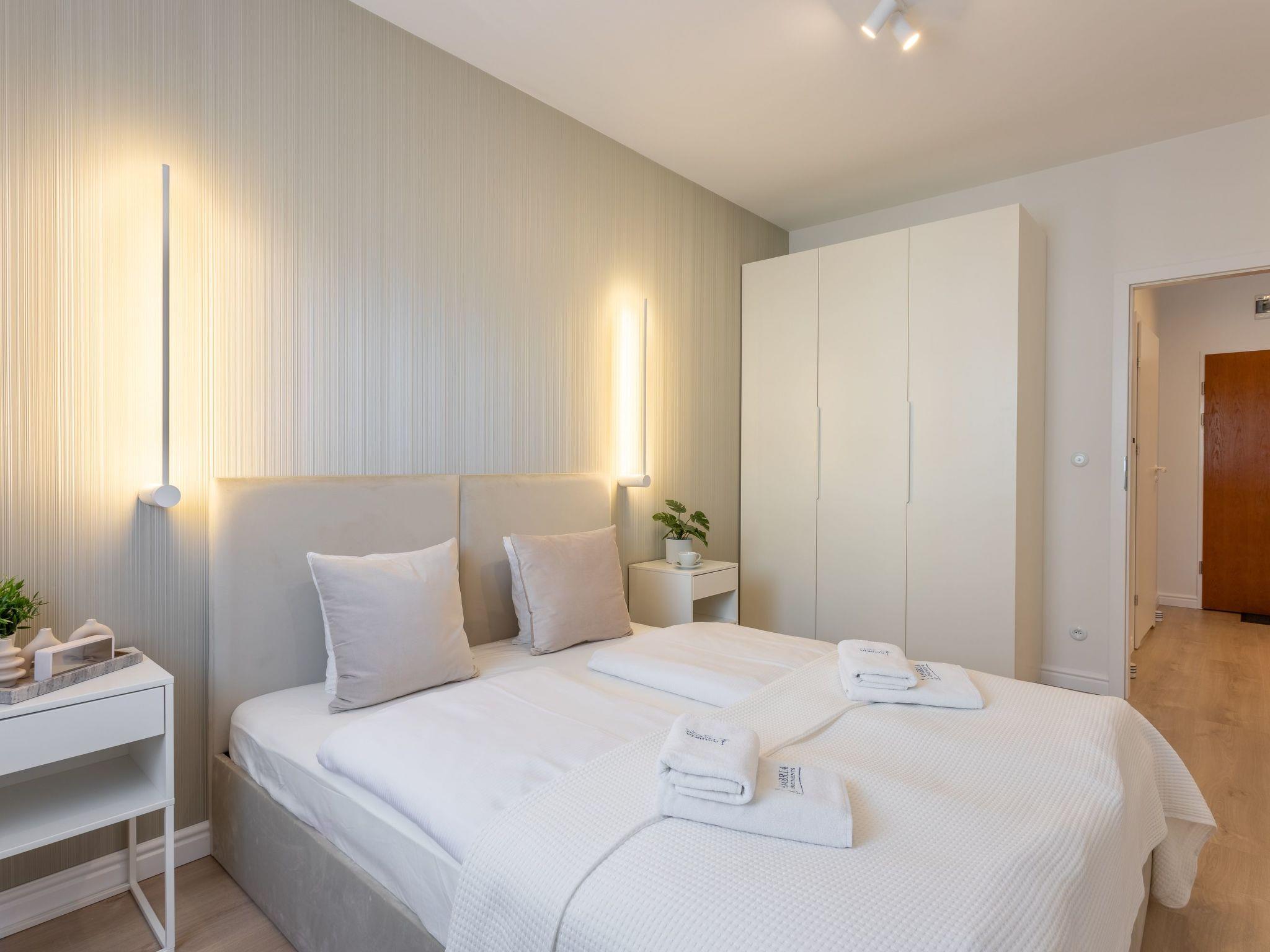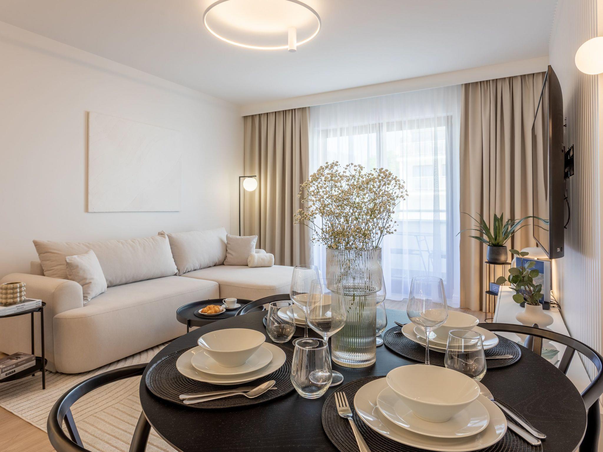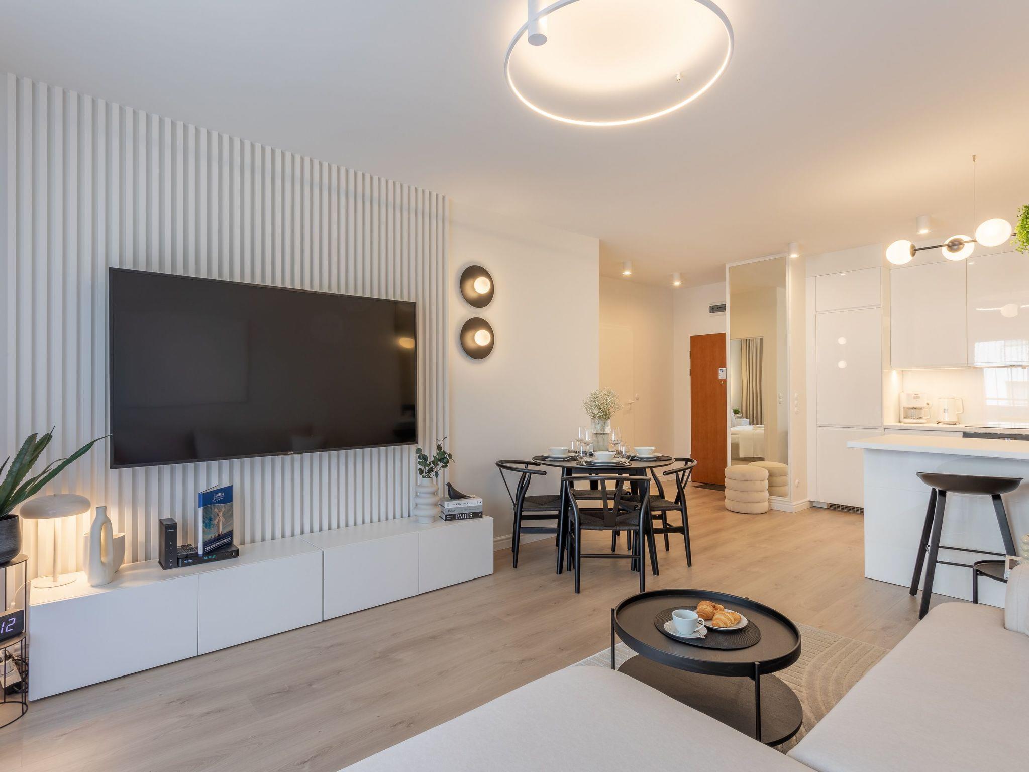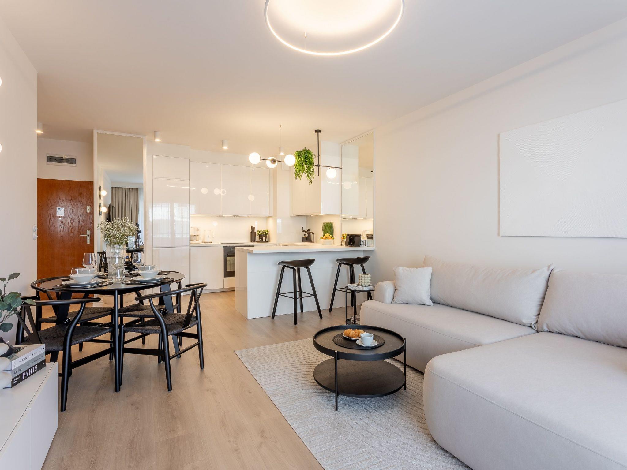 Flat "White Space" in Swinoujscie is a unique place of rest and relaxation, loved by our guests who appreciate luxury and comfort as well as proven modern solutions that facilitate everyday and intuitive functioning. It is a flat with a very spacious bedroom, living room with a well-equipped kitchenette, dining area and modern bathroom with a total area of 52 m2, as well as a balcony, which is a perfect extension of the usable area. The interior is decorated in light colours, dominated by wood, white and beige tones that evoke associations with sand, beach and sun, broken by a deep grey tone and black accessories. The flat is also extremely cosy and is characterised by simple shapes and the highest quality. Numerous textile and decorative accessories complement the room and make you feel at home. It is an ideal offer for people who want to spend some time on the couch with a book during their stay, watch their favourite film on TV as big as in the cinema or have breakfast in an extremely comfortable bed.