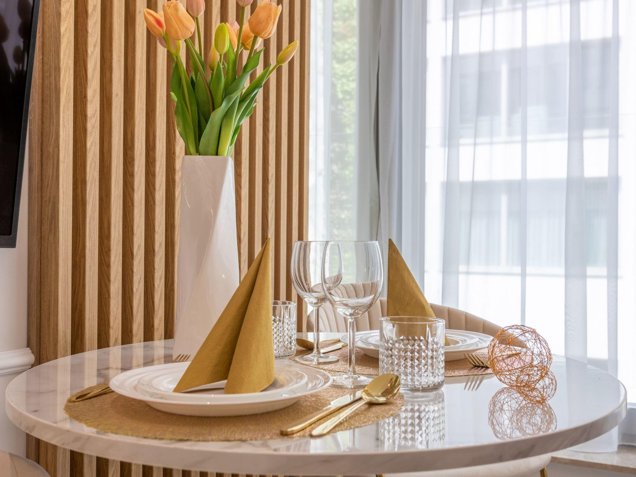 It consists of a living, dining and sleeping area, a fully equipped kitchenette and a spacious bathroom with a total area of 24m2. Good facilities guarantee a pleasant stay, both for private and business purposes. The interior is charming, tasteful and cosy: full of bright, warm tones that, together with modern furniture and elegant accessories, create an exquisite whole where you can rest and actively indulge your interests and passions. A beautiful decoration on the wall, directly behind the headboard, emphasises the charm of this place and ... ignites the senses.