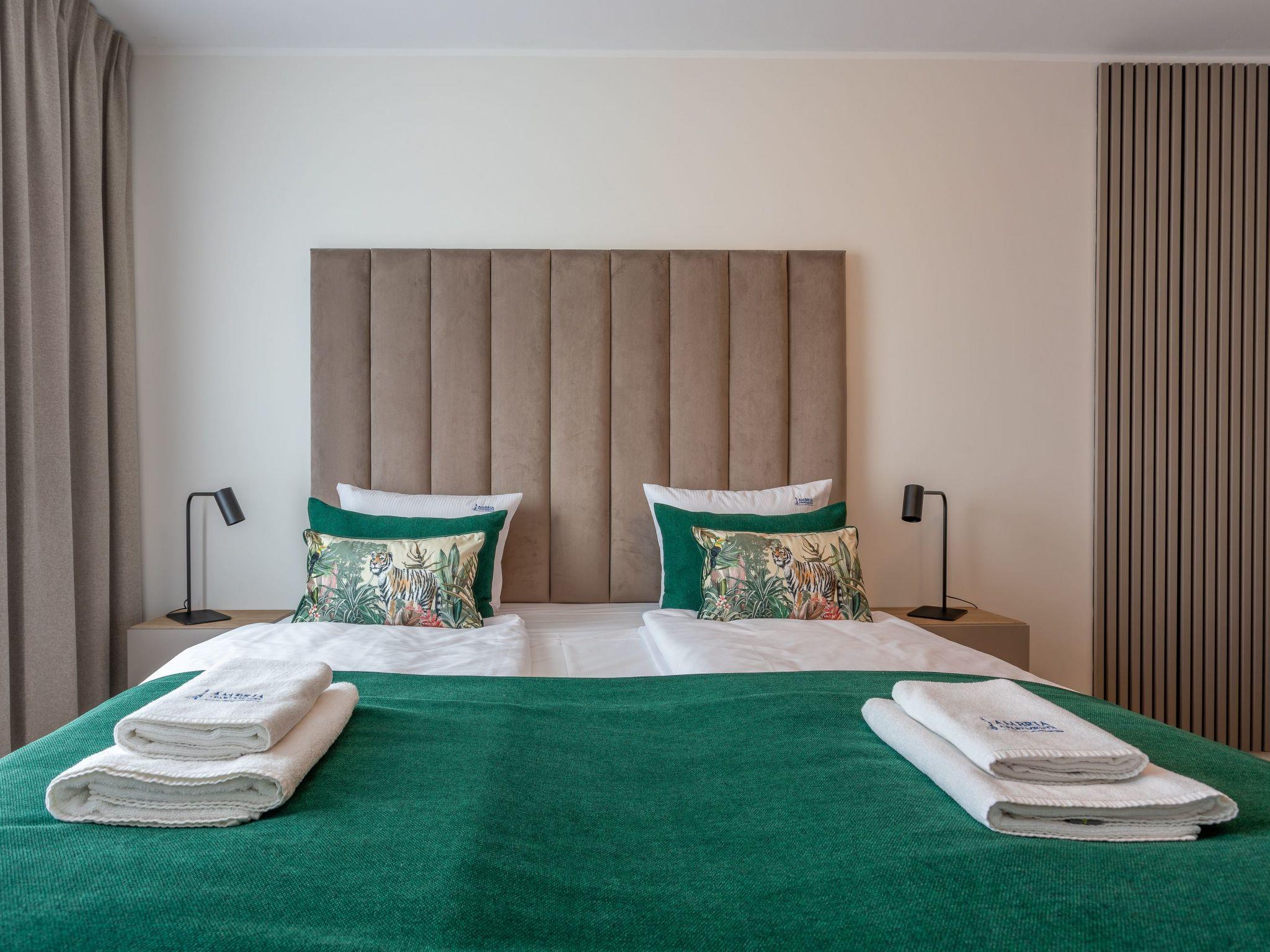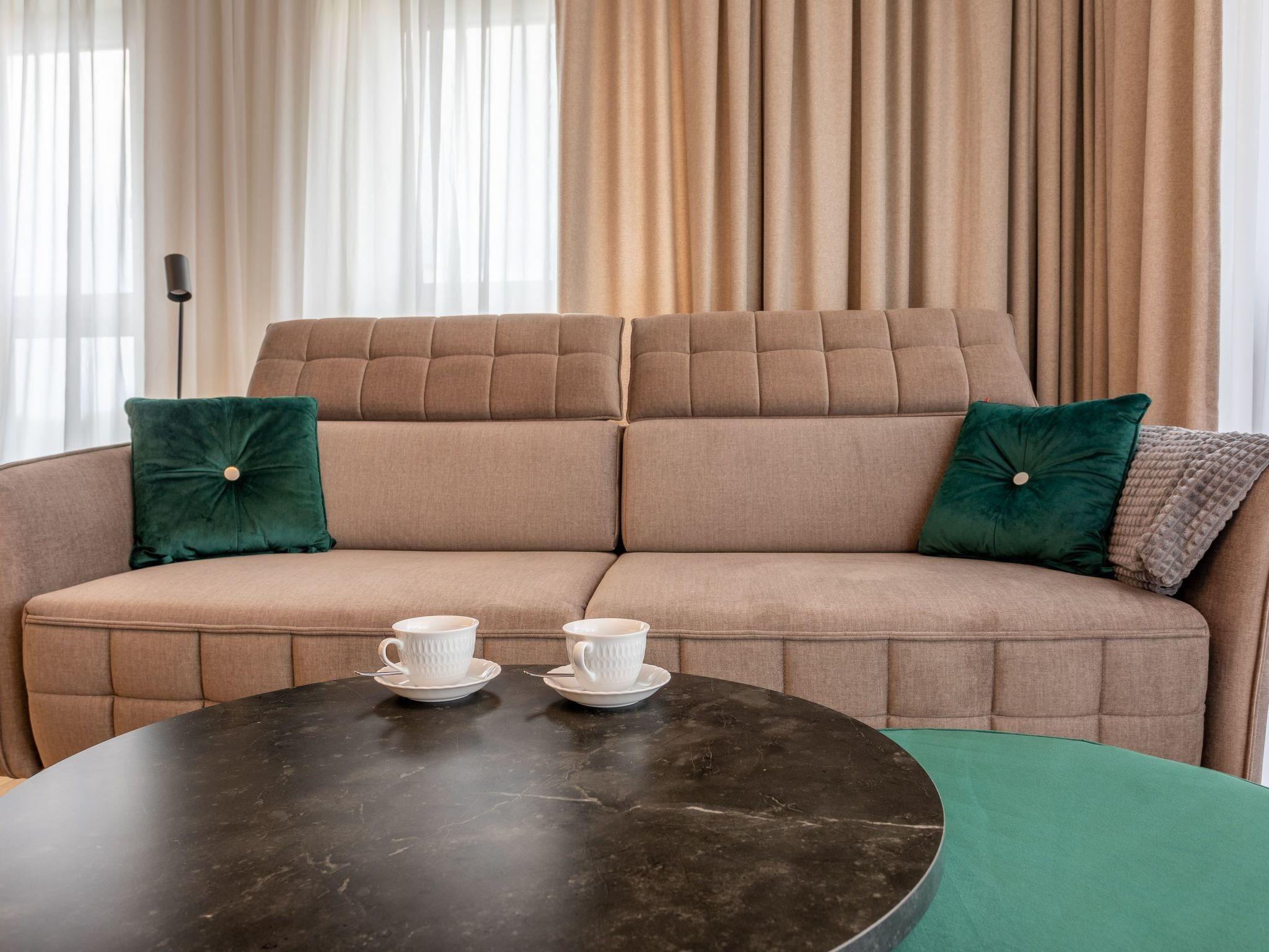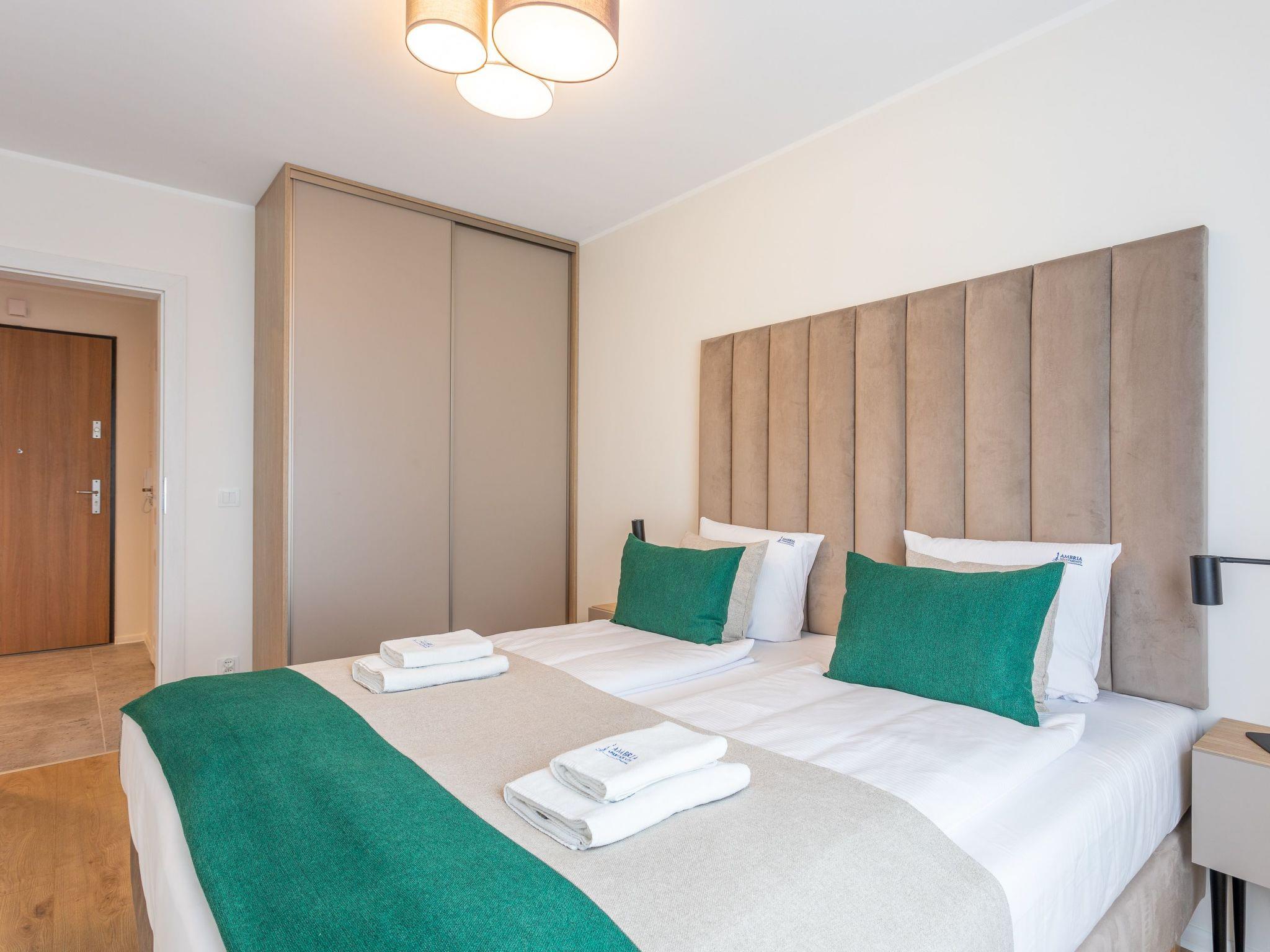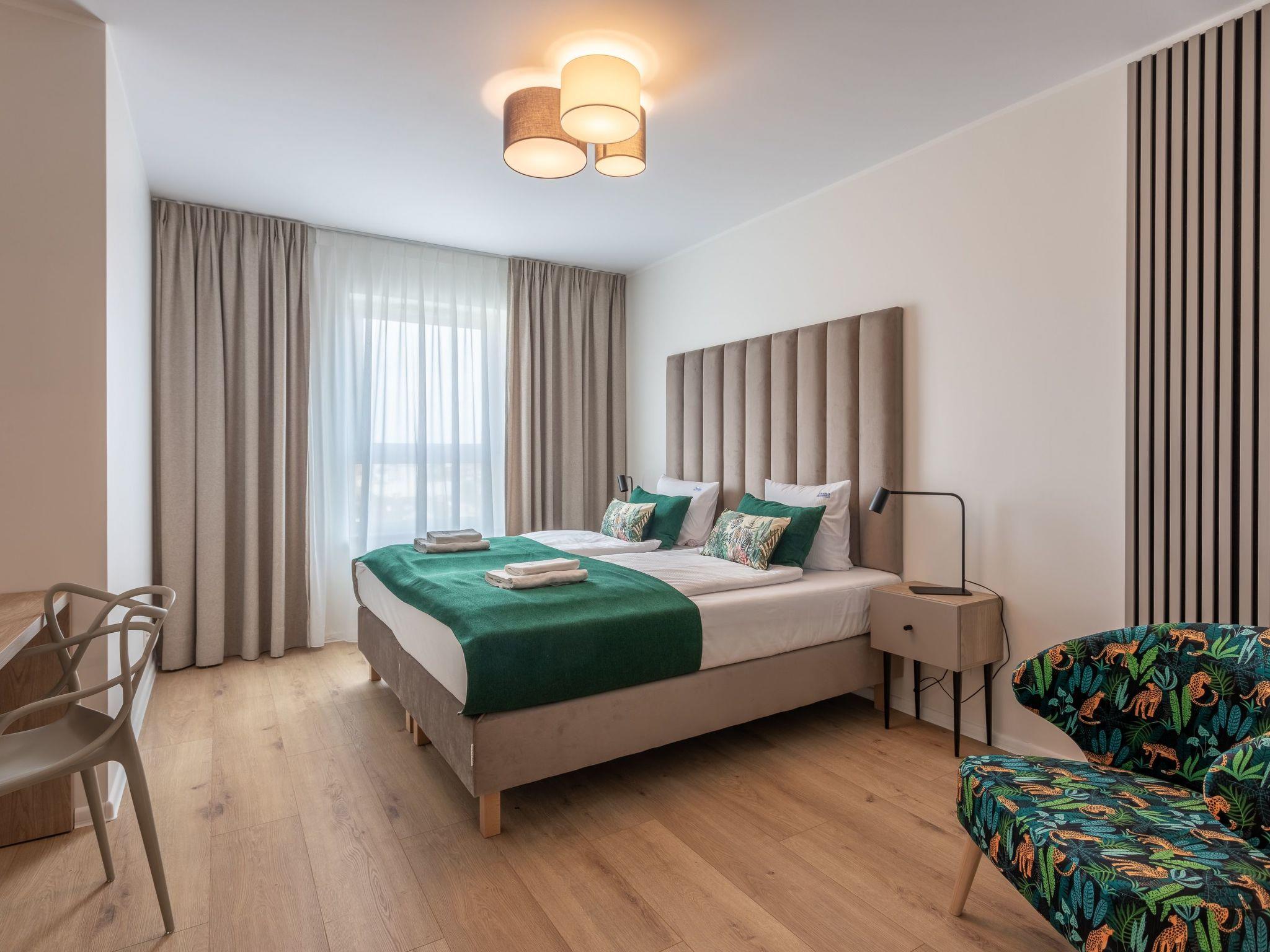 Flat "Sun Towers B107" in Swinoujscie is an elegant flat in a building built in 2022 with two bedrooms, living room with well-equipped kitchenette, dining area and modern bathroom with a total area of 60 m2, as well as a very large balcony, which is a perfect extension of the usable area. Very comfortable double beds in the bedrooms ensure a peaceful night's sleep. A unique interior whose insulated space is filled with earthy colours and creates an extremely cosy character and atmosphere of a mysterious and wild island. It is important to be able to come back after a day of sea activities and relax in a comfortable and high-quality interior. Guests also have access to a parking space in the underground car park - at an extra charge - which significantly increases the comfort of travelling and is particularly desired by families on holiday with children.