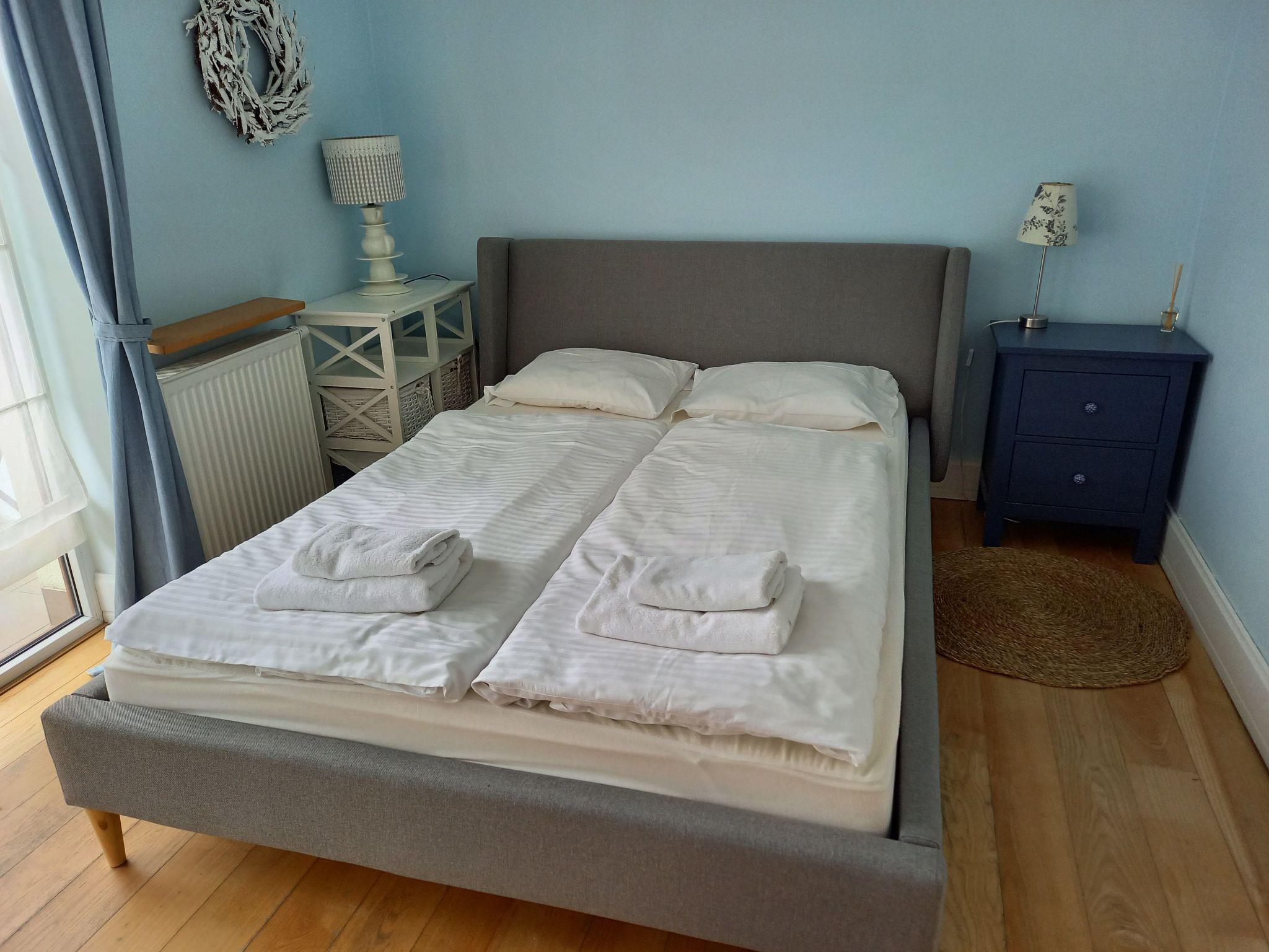 The comfortable, cosy, feel-good holiday flat on the high ground floor is suitable for up to 4 people. It has a floor made of real, warm ash wood. The holiday flat has a separate bedroom with a 2-person bed (new mattress from April 2025), a living room with sofa bed for 2 people and dining table, a fully equipped kitchenette (hotplates, oven, dishwasher, kettle, fridge, coffee machine, toaster) and a bathroom with a large shower (90 x 90 cm) and washing machine. The deep shower tray (with stopper) is suitable as a bathtub for children. By opening the wide double door to the bedroom, you can create more living space if required, e.g. during the day. Our customised, stylish built-in wardrobe between the bedroom and living room provides plenty of storage space. The flat is surrounded on both sides (north and west) by a continuous balcony of 10 m². You can watch several dozen German TV channels via satellite on the 43-inch LED TV with a paid Netflix account. You have free wireless internet access (WLAN). Also at your disposal: iron with ironing board, hairdryer, drying rack and hoover.