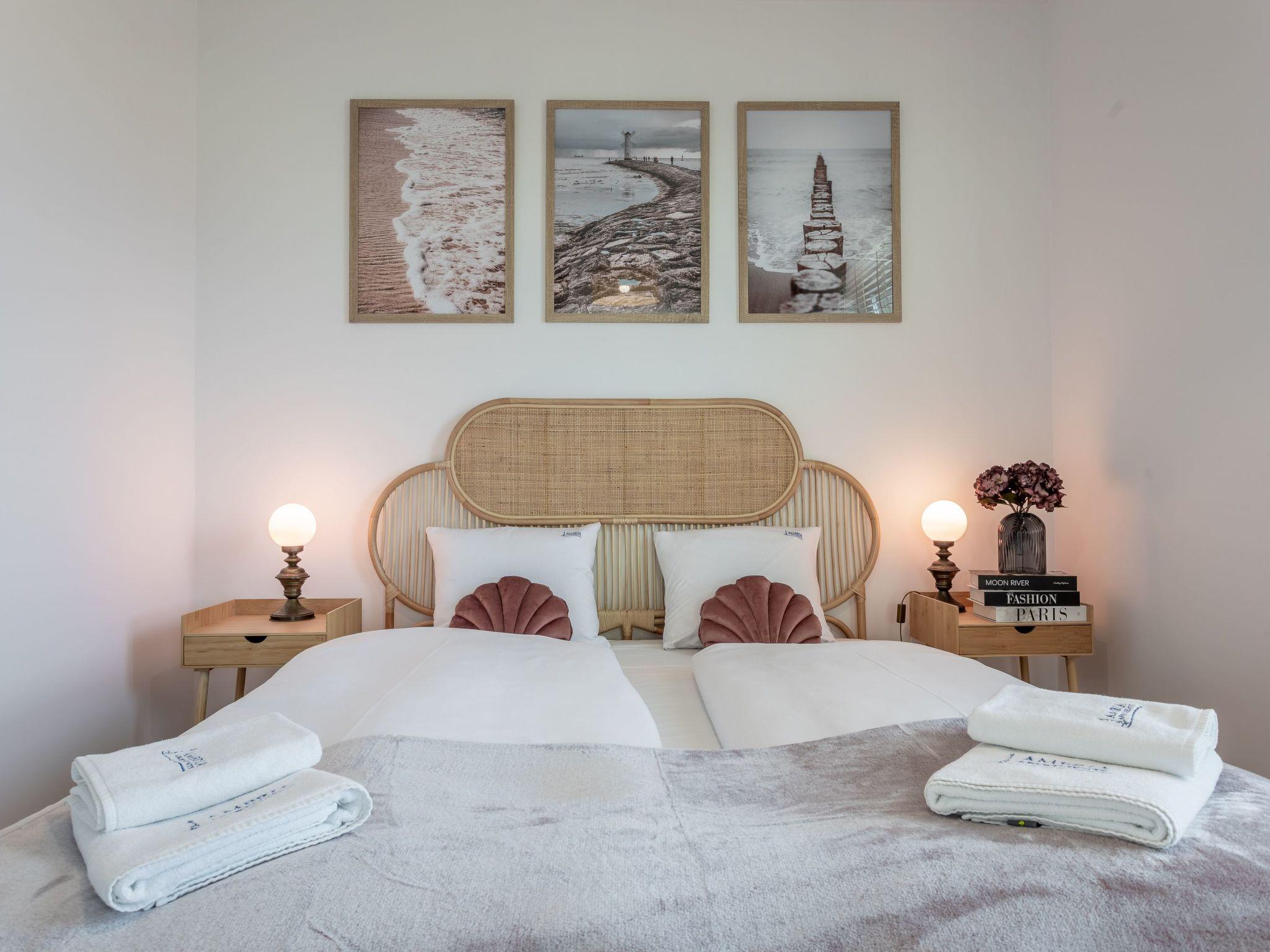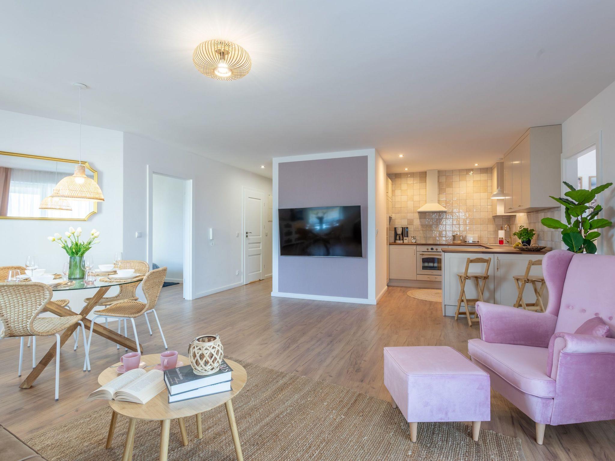 The interior is very originally designed, dominated by wood, white and beige tones that evoke associations with sand, beach and sun, as well as beautiful wooden details smuggled into accessories that warm up the interior and delight with their texture and unconventional look. It's a cosy place for people who want to feel at home alongside the seaside attractions: Spend some time on the sofa watching TV, listening to a good audiobook or reading your favourite book. There is also an underground parking space, which significantly increases travel comfort and can be particularly desirable for families on holiday with children.