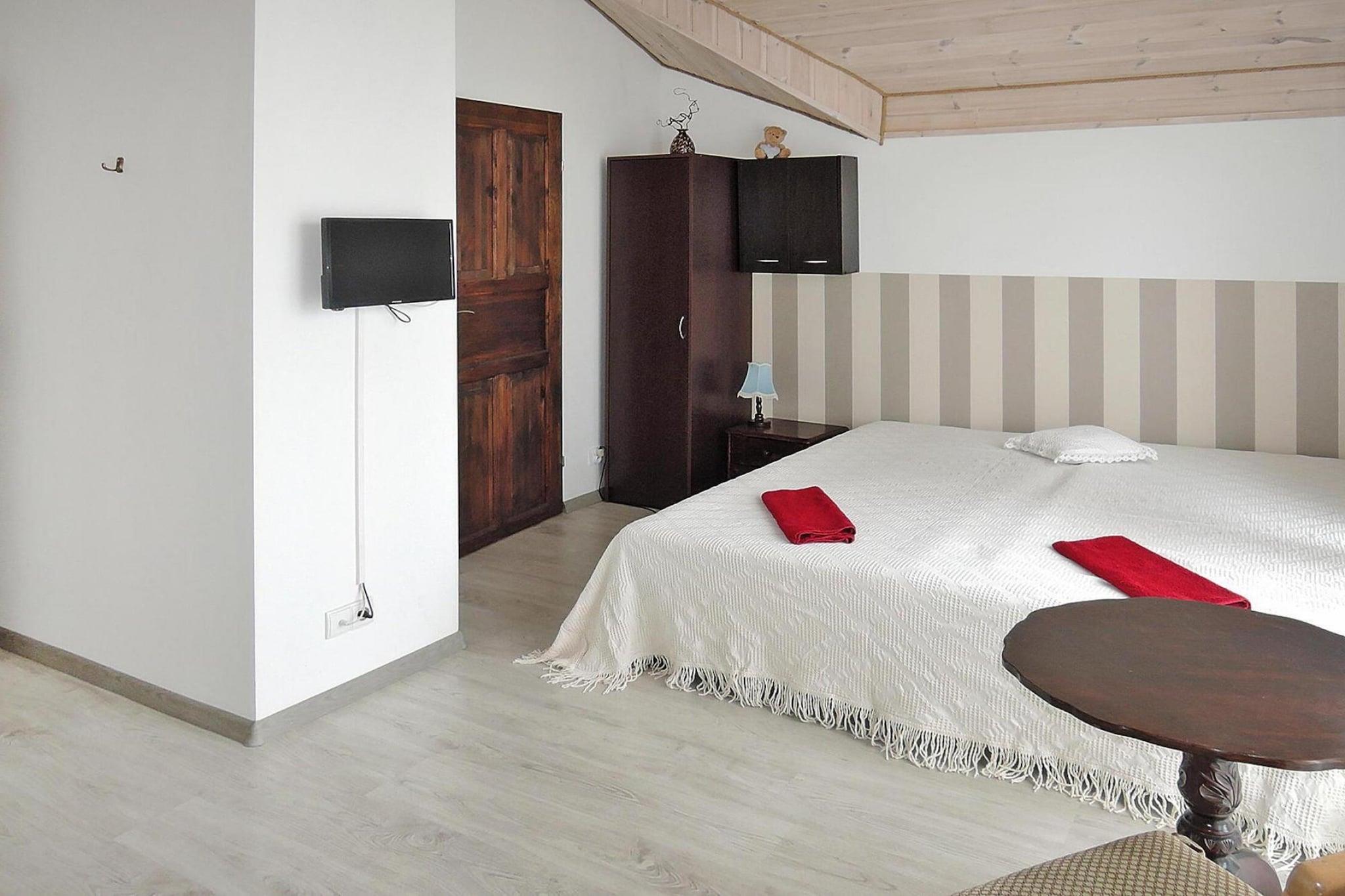 Direkte adgang til søen med naturstrand: XXL dobbelthus med plads til op til 16 personer, kun 100 meter fra den naturlige badestrand! Med sine 7 soveværelser byder det store hus med sit lyse og venlige interiør på masser af plads og retrætemuligheder for alle. På den skønne terrasse kan I spise morgenmad i et sundt klima, grille om aftenen eller bare slappe af og nyde stilheden.To robåde og en kano står gratis til rådighed - ideel til opdagelser på vandet.Dit sommerhus er beliggende i udkanten af den lille landsby Troszyn, kun 7 km fra Wolin.The landsby er et paradis for naturelskere, fiskere, svampe plukkere og hunters.If du ønsker det, kan du købe landbrugsprodukter fra gården på ejendommen. Detaljer: WLAN1 kano2 robåde Aktiviteter i nærheden: I byen Wolin, 7 kilometer væk, er der allerede nogle interessante seværdigheder at opdage: markedet med det lokalhistoriske museum, vikingernes friluftsmuseum, den hollandske vindmølle eller Galgenberg med sine trillebøre fra det 11. århundrede. Så kan du selvfølgelig, udover at besøge bisonindhegningen i nationalparken, tage på smukke cykelture eller gåture på de imponerende klipper eller starte mod fuglereservaterne ved Szczecin-lagunen. Og til meget afslappede dage tager du til en af de smukke badebyer med deres fine, brede strande Ikke egnet til personer med nedsat mobilitet