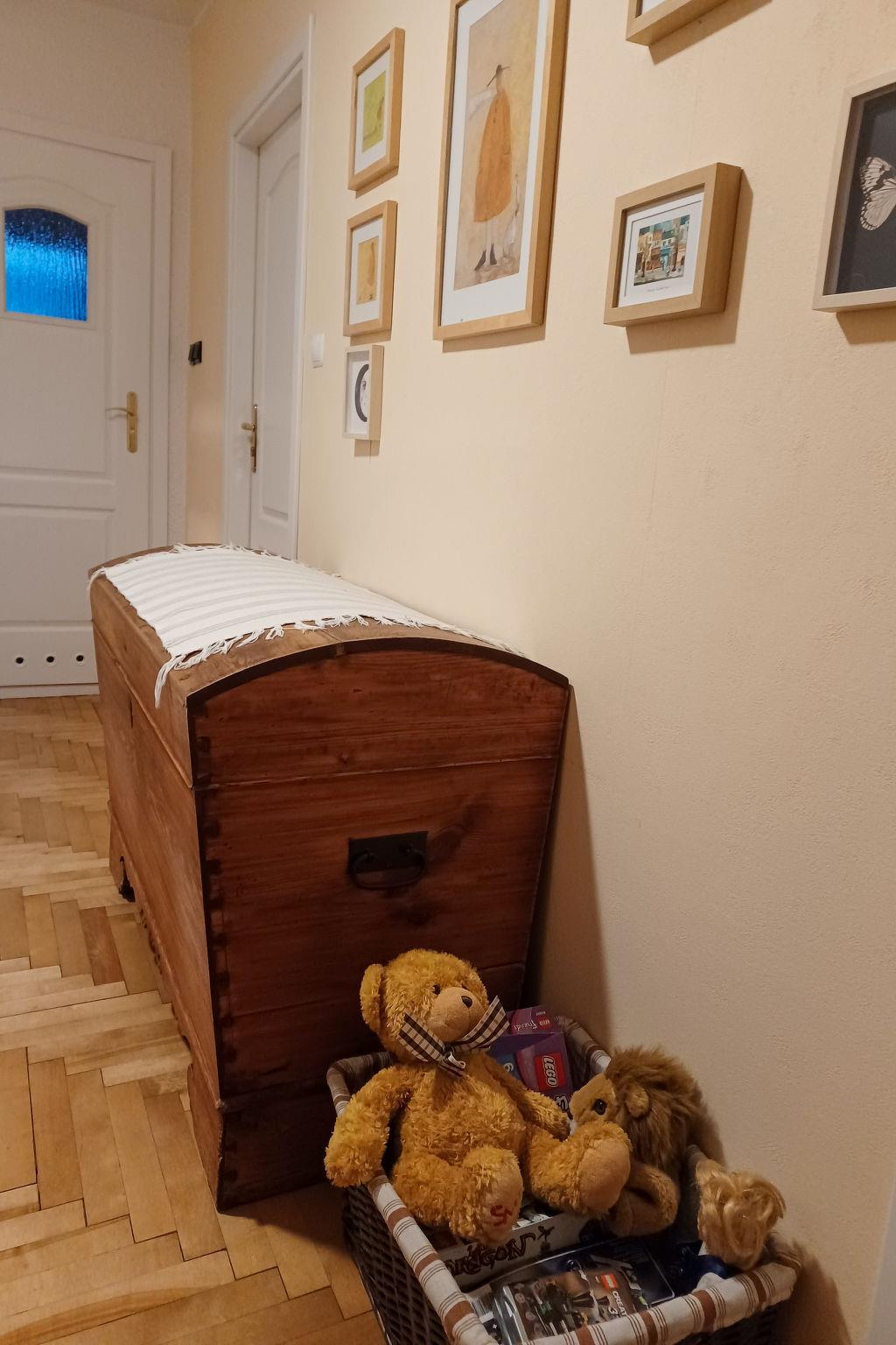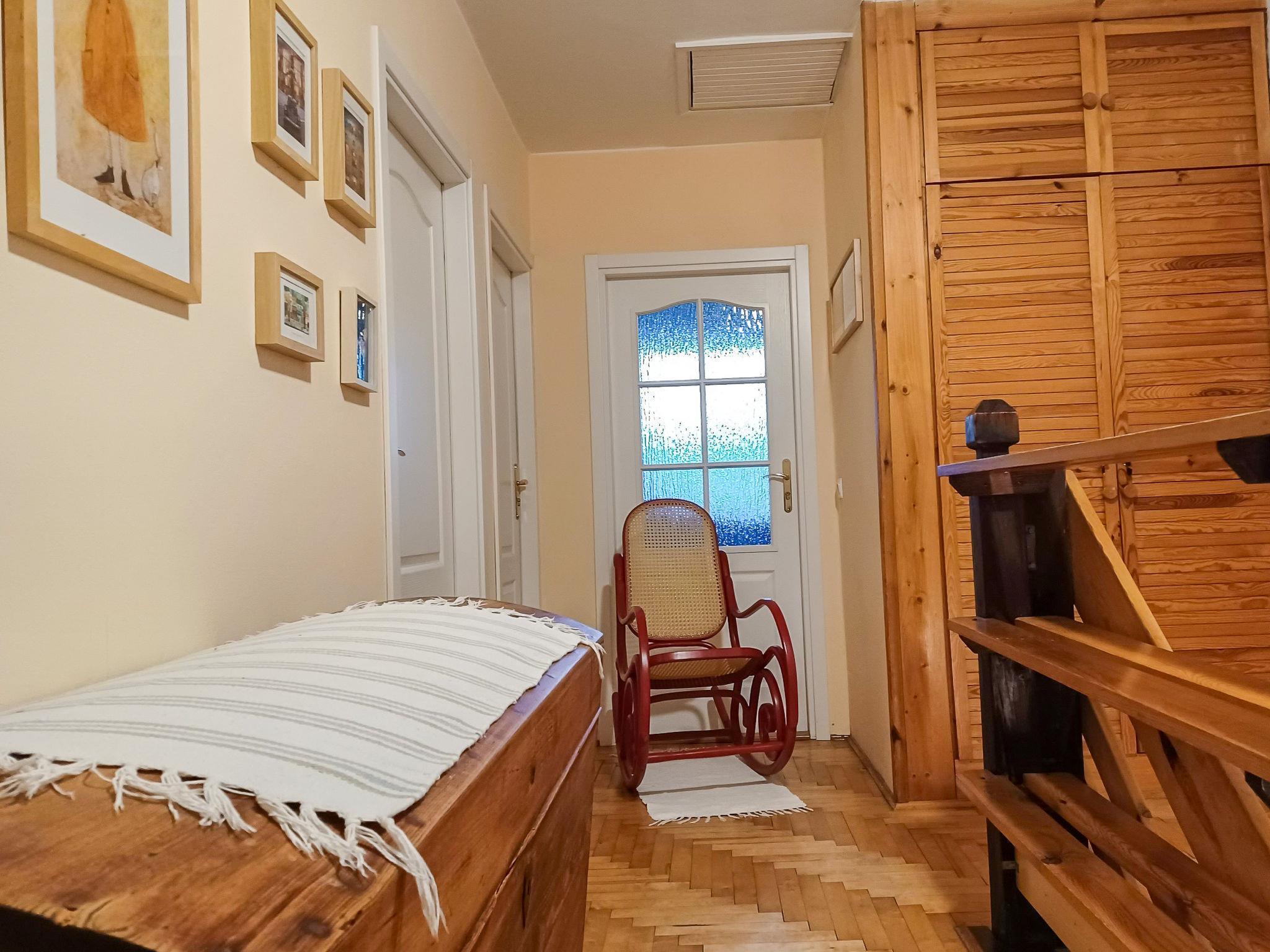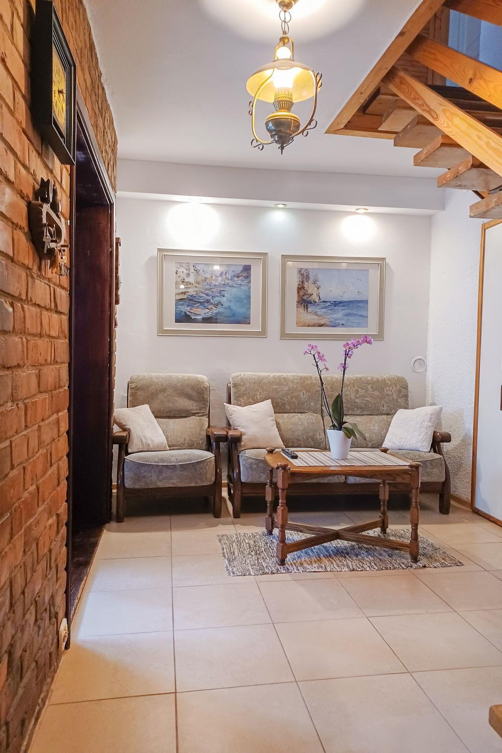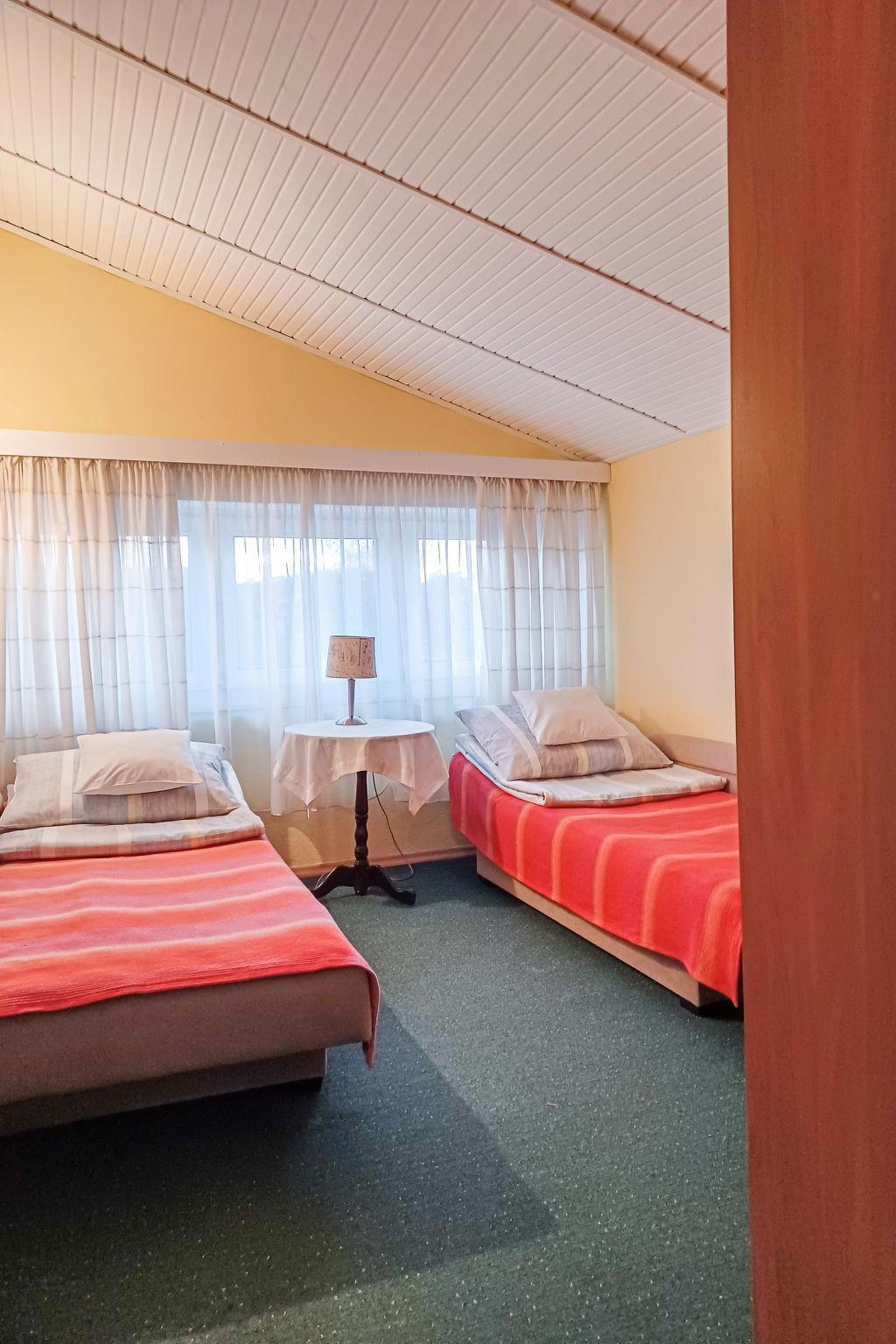 4-room apartment 105 m2 on 2 levels. Entrance hall with 1 sofabed, satellite TV and radio. Exit to the garden. Kitchen (oven, dishwasher, electric coffee machine) with dining nook. Shower/WC. Upper floor: 1 room 13 m2 with 1 french bed (180 cm, length 200 cm). Exit to the balcony. 1 room 10 m2 with 1 french bed (160 cm, length 200 cm). 1 room 12 m2 with 2 beds (80 cm, length 200 cm). 1 room 10 m2 with 2 beds (80 cm, length 200 cm). Shower/WC, bath/shower/WC. Gas heating, solar energy heating, boiler (300 litres). Balcony 8 m2. Facilities: children's high chair. Internet (WiFi, free). Parking (2 cars). Please note: non-smokers only. Private entrance. The kitchen has a dining table for 8 people.