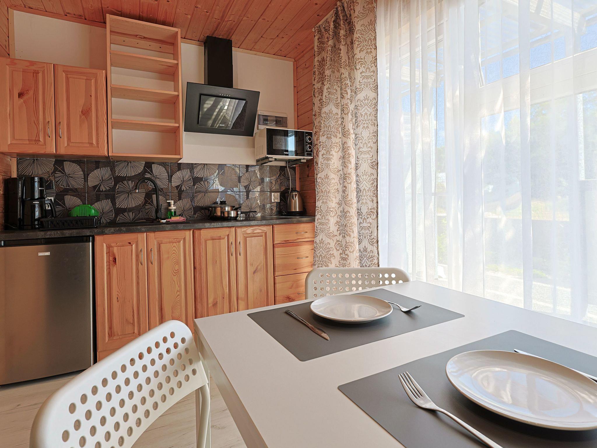 Room with kitchenette (fridge, microwave,coffee maker, sink, ceramic hob, extractor hood, kettle, set of pots, dishes and cutlery and table and chairs )