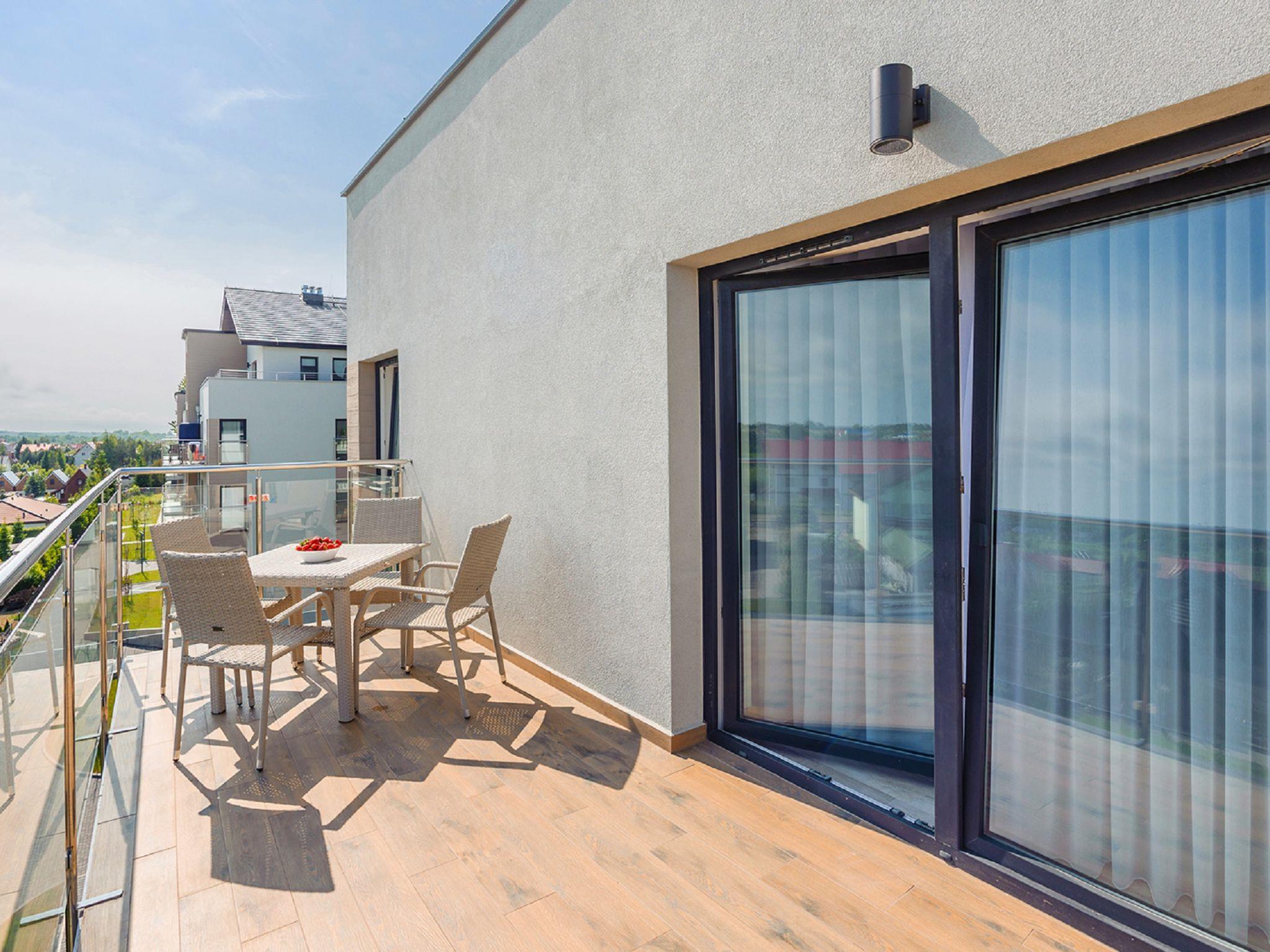 Modern, cosy apartment block "Piec Mórz". In a quiet, sunny position, from the sea, 300 m from the beach. For shared use: indoor pool (pool opening hours: 11:00-14:30 and 15:00-19:00). Terrace. Private: children's playground. In the house: WiFi, sauna, central heating system. Parking (limited number of spaces, extra) at the house on the premises. Bus stop 3 km, railway station 11.4 km. Nearby attractions: Ratusz 10 km, Bazylika Mariacka 10 km. Please note: the photograph shows a typical example. Additional accommodations can be booked. The apartment may be on the ground floor, first, second or third floor. Most of the apartments have a parking space, there may be an additional fee (PLN 20 / day in high season and on special dates), 3 apartments do not have assigned / guaranteed places. The child is accepted over the maximum number of people - up to 3 years of age.