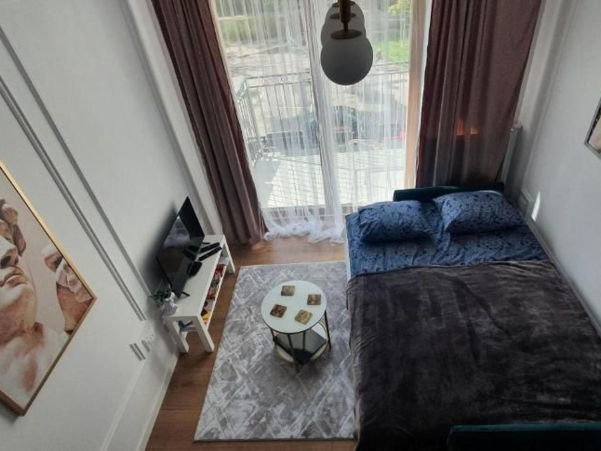 The apartment consists of a living room with a kitchenette, a bedroom and a bathroom.