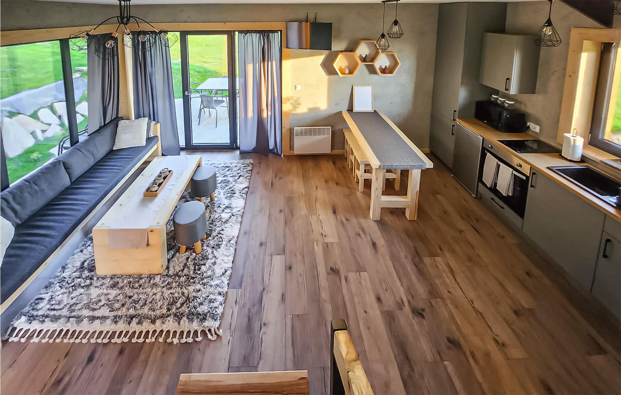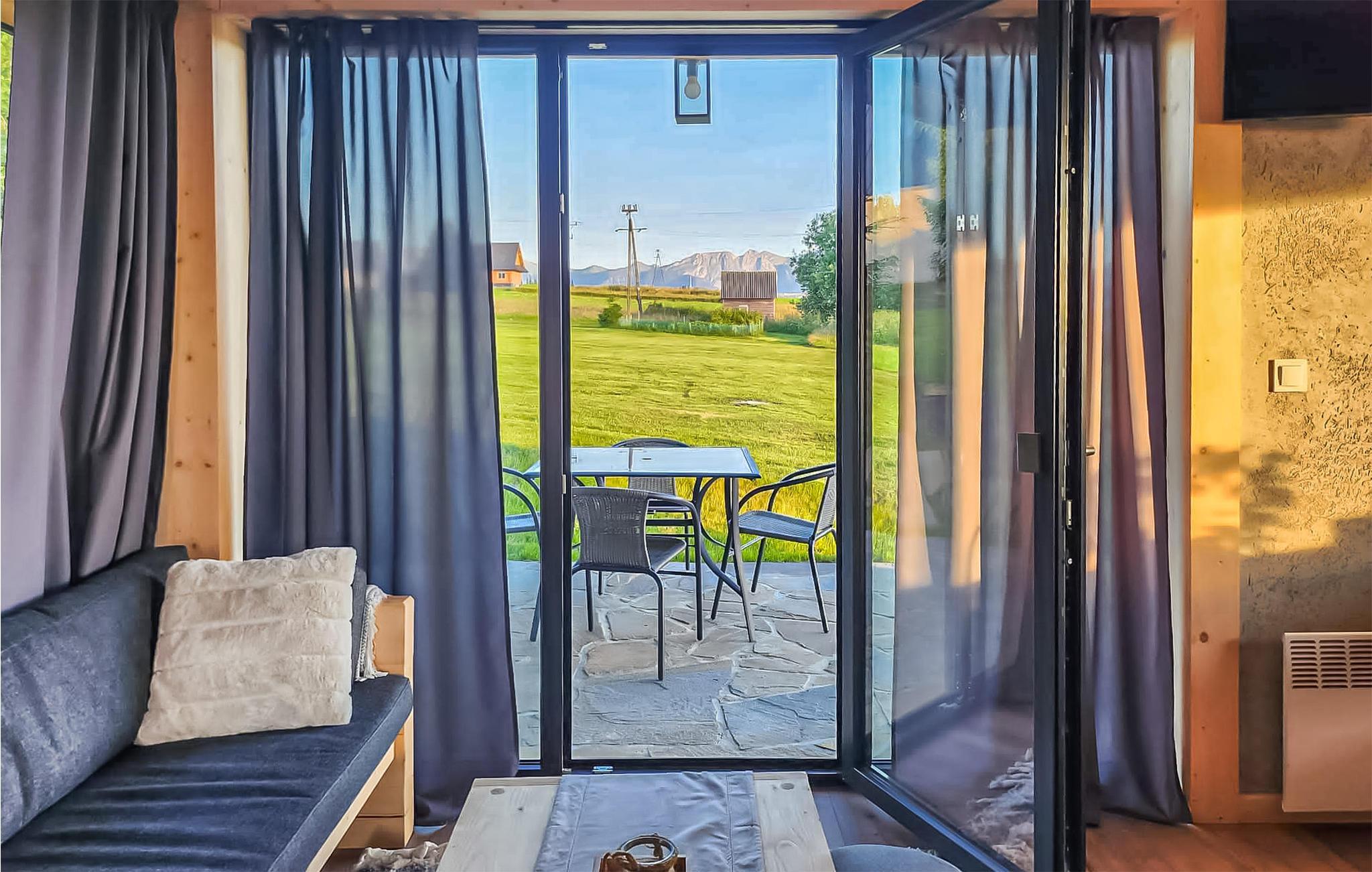 Velkommen til en skøn, lille oase! Træd ind i det lyse feriehus, hvis panoramavinduer forbinder jeres bolig inde med naturen udenfor. Nyd samspillet mellem moderne og rustikke elementer og slap af i de veludstyrede rum. Glæd jer også til timerne udendørs, hvor I kan nyde morgenkaffen i solen og se på bjergtoppene. Børnene kan brænde krudt af i haven og bruge græsplænen som en stor legeplads.