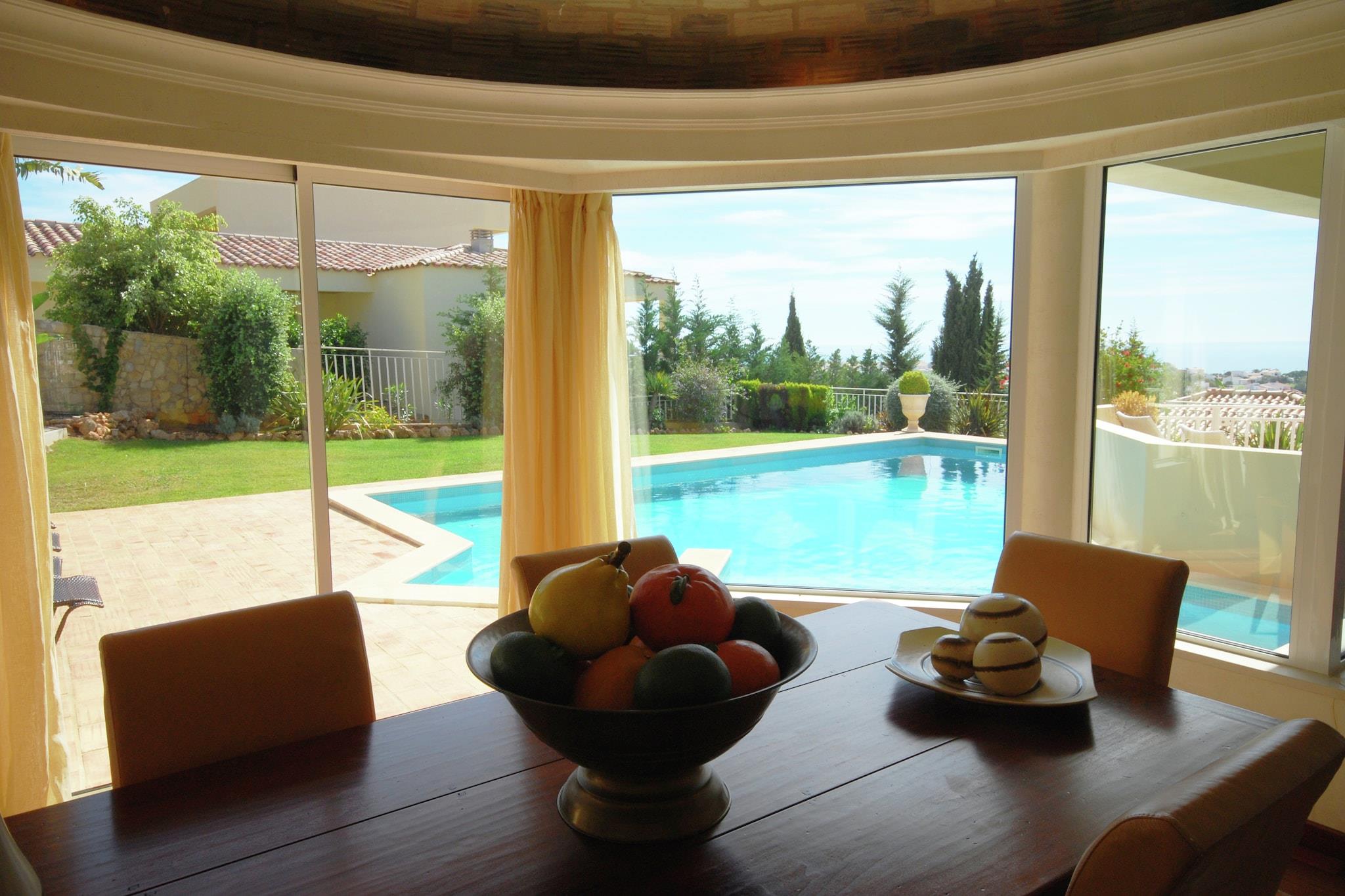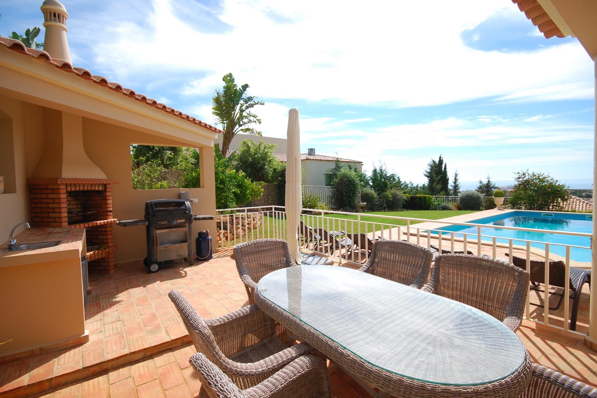 Moderne, fritliggende villa med privat swimmingpool. Du kommer til swimmingpoolen via en af de to lukkede terrasser. Du ser ud over de bakkede omgivelser, Albufeira og havet. For at gøre det komplet er der også en dejlig græshave, hvor børnene kan boltre sig. Albufeira ligger kun 3 km væk. Det er en hyggelig badeby med mange butikker, restauranter, terrasser og barer. Den gamle del har bygninger fra en svunden tid i smalle gader og hyggelige pladser. Byens strand ligger allerede 3,5 km væk, men du har valget mellem strande. Der er mange skjulte bugter langs den smukke kyst. Rart at tage en tur i bil for en dag og lave forskellige ting. De idylliske bugter Praia de São Rafael og Coelha, for eksempel (begge 5 km). Du kan selvfølgelig også bare vælge en og blive der hele dagen. For virkelig at lære denne del af Algarve at kende, bør du forlade kysten. En smuk køretur fører dig til de maleriske landsbyer Paderne (20 km) og Alte (30 km). Begge landsbyer ligger op mod en bakke, og tiden ser ud til at have stået stille her.