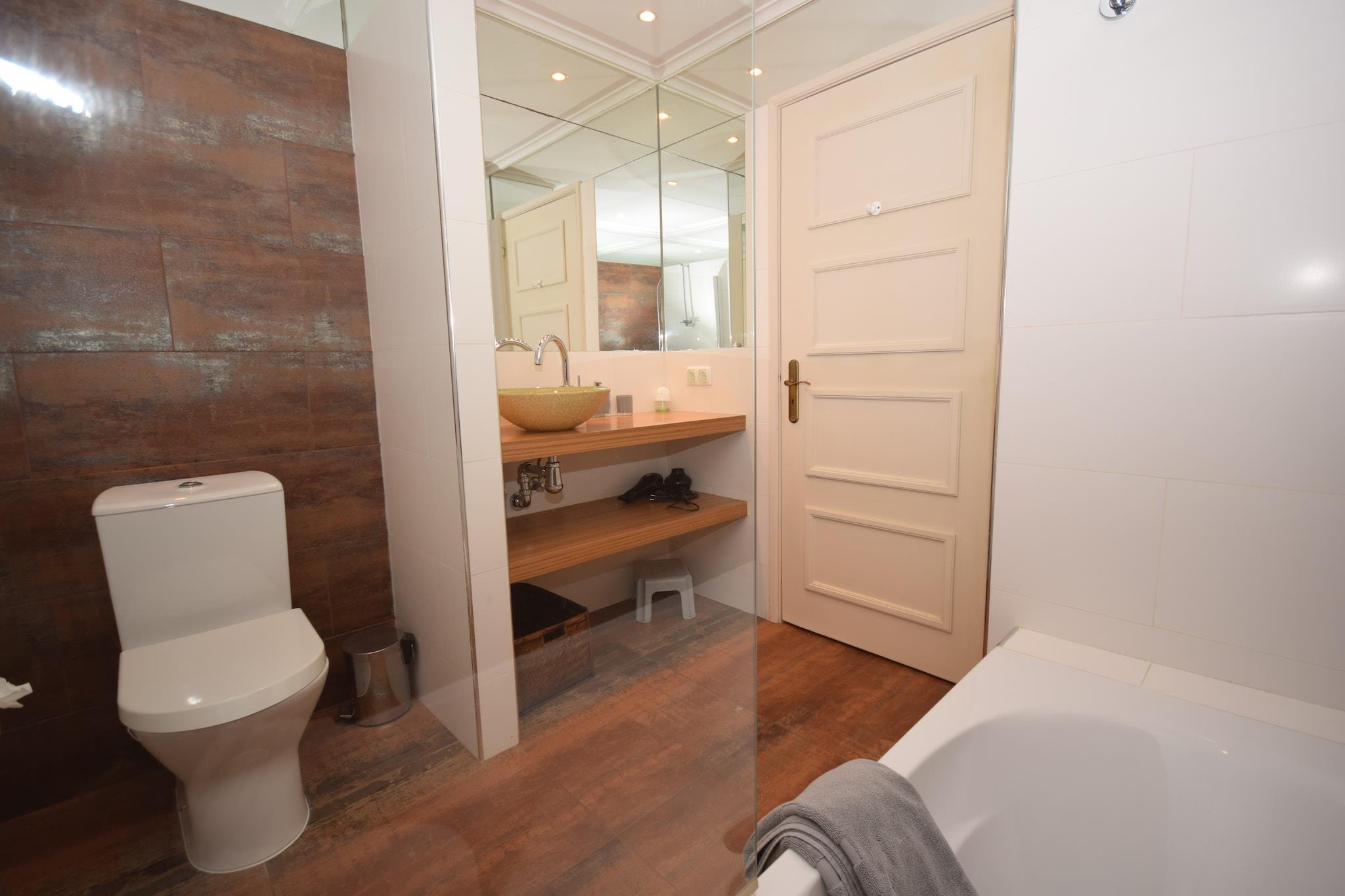 På 1. etage: (åbent køkken(elkedel, brødrister, komfur(Komfur med fem kogeplader), emhætte, kaffemaskine(kopper), ovn, mikrobølgeovn, opvaskemaskine , køle-fryseskab), stue / spisestue(Fjernsyn, spisebord, hyggepejs, sofahjørne, DVD-afspiller, balkon), soveværelse(2x enkeltseng(90 x 200 cm), enkeltfoldeseng, varme(elektrisk)), soveværelse(2x enkeltseng(90 x 200 cm), varme(elektrisk)), badeværelse(badekar med bruser, håndvask, toilet), bryggers(vaskemaskine)) badekar eller bruser, bruser, patio, patio, terrasse, have(deles med andre gæster), parkering, swimmingpool(deles med andre gæster, inkl. separat børne swimmingpool (maks. dybde 50 cm), 20 x 10 m., opened from 1/2 Mar upto and including Dec), strygebræt